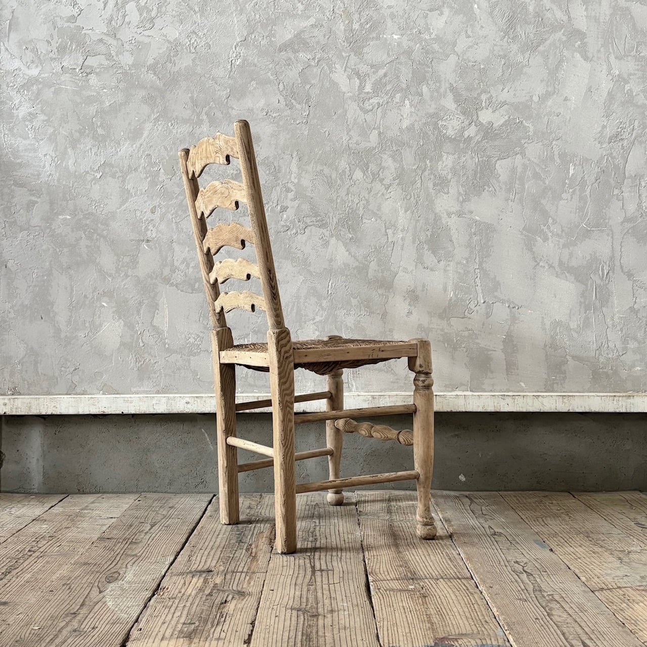 温かみのあるどこか懐かしい雰囲気を感じるラッシュシートのチェア。前後でデザインが違う脚部はしっかりとした作りで、丁寧に編み込まれたやや広めの座面は座りやすく安定感があります。薄めの木の色合いや背もたれの装飾も良い雰囲気です。