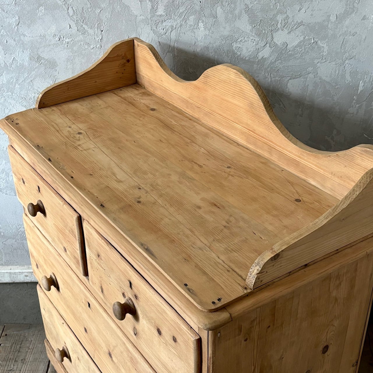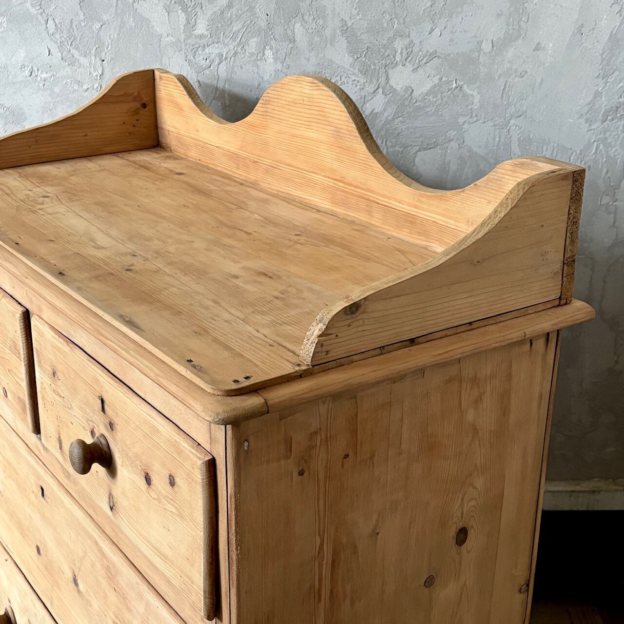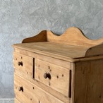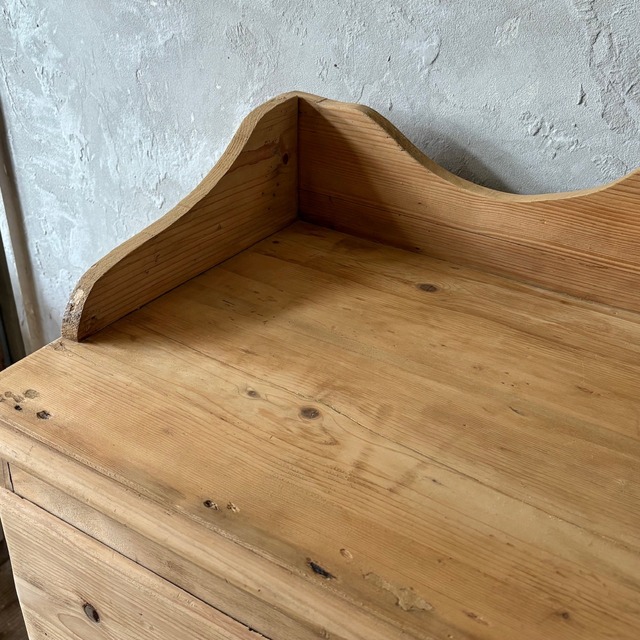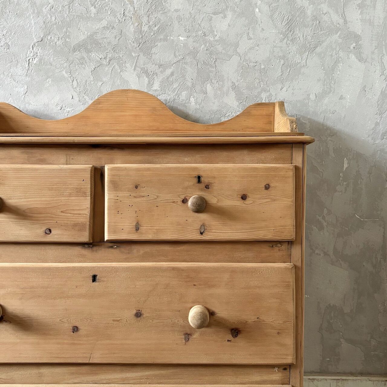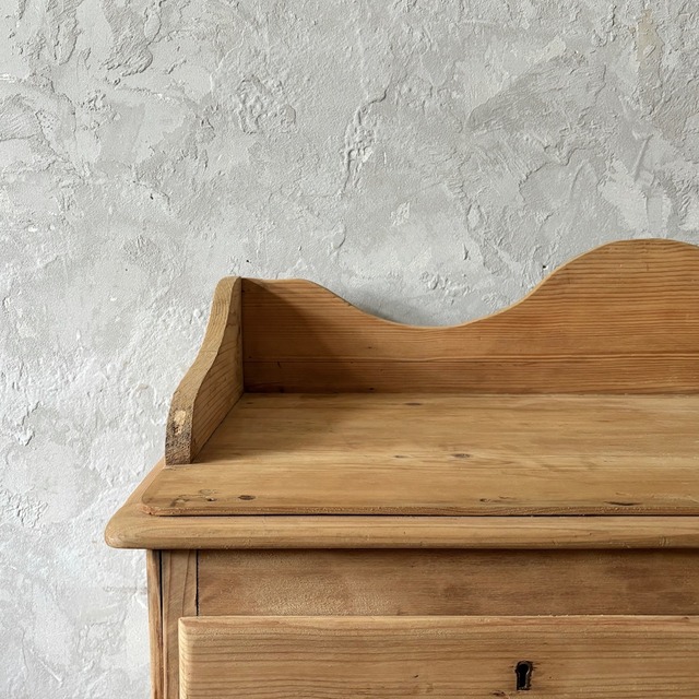 オールドパインの素朴な佇まいのチェスト。やや広めの天板部分を囲うようにつけられた装飾が華やかな印象で、飾るものを引き立ててくれます。引出し部分は奥行と幅が十分にあるので収納力があり、内部も良い状態です。飾り棚として使ったり、寝室や洗面所などでの収納にも良さそうです。
