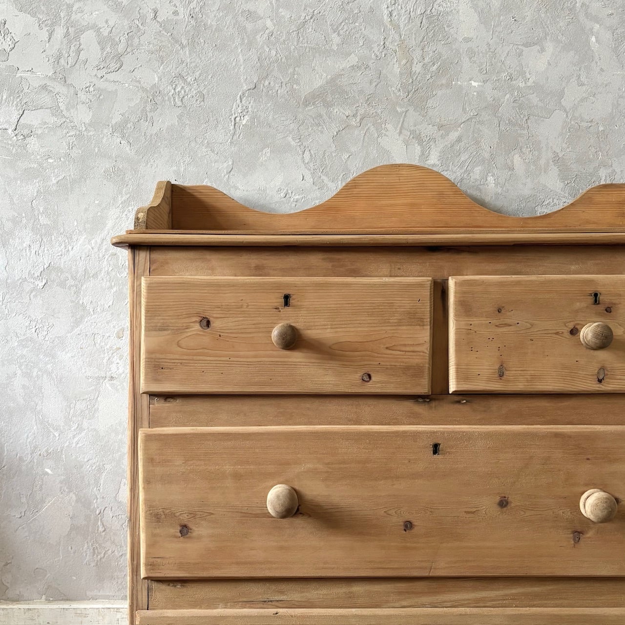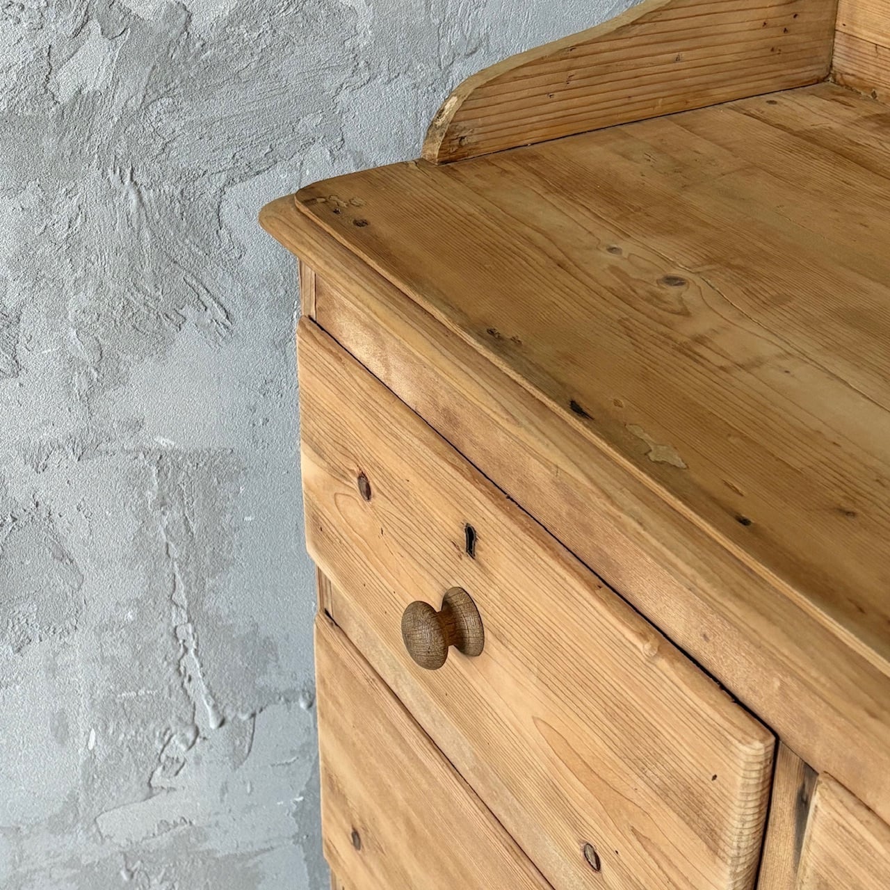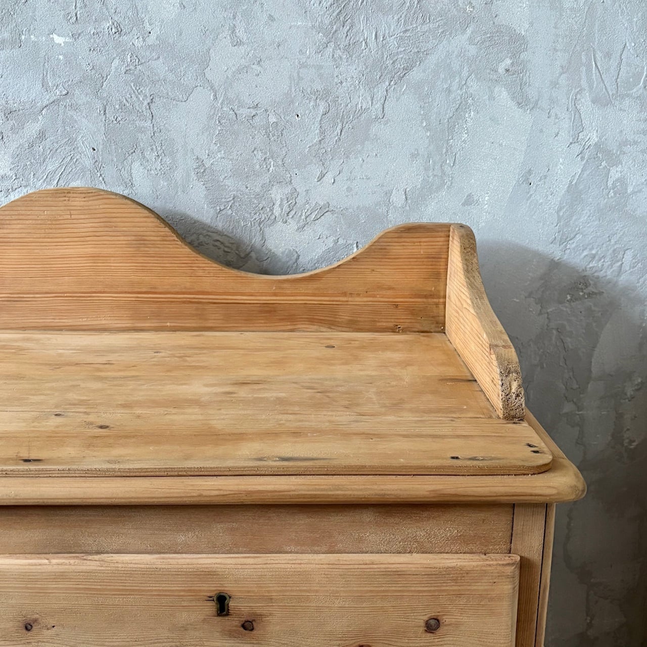 オールドパインの素朴な佇まいのチェスト。やや広めの天板部分を囲うようにつけられた装飾が華やかな印象で、飾るものを引き立ててくれます。引出し部分は奥行と幅が十分にあるので収納力があり、内部も良い状態です。飾り棚として使ったり、寝室や洗面所などでの収納にも良さそうです。