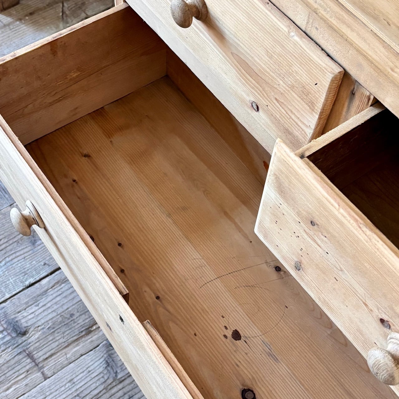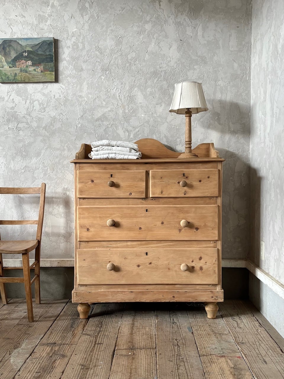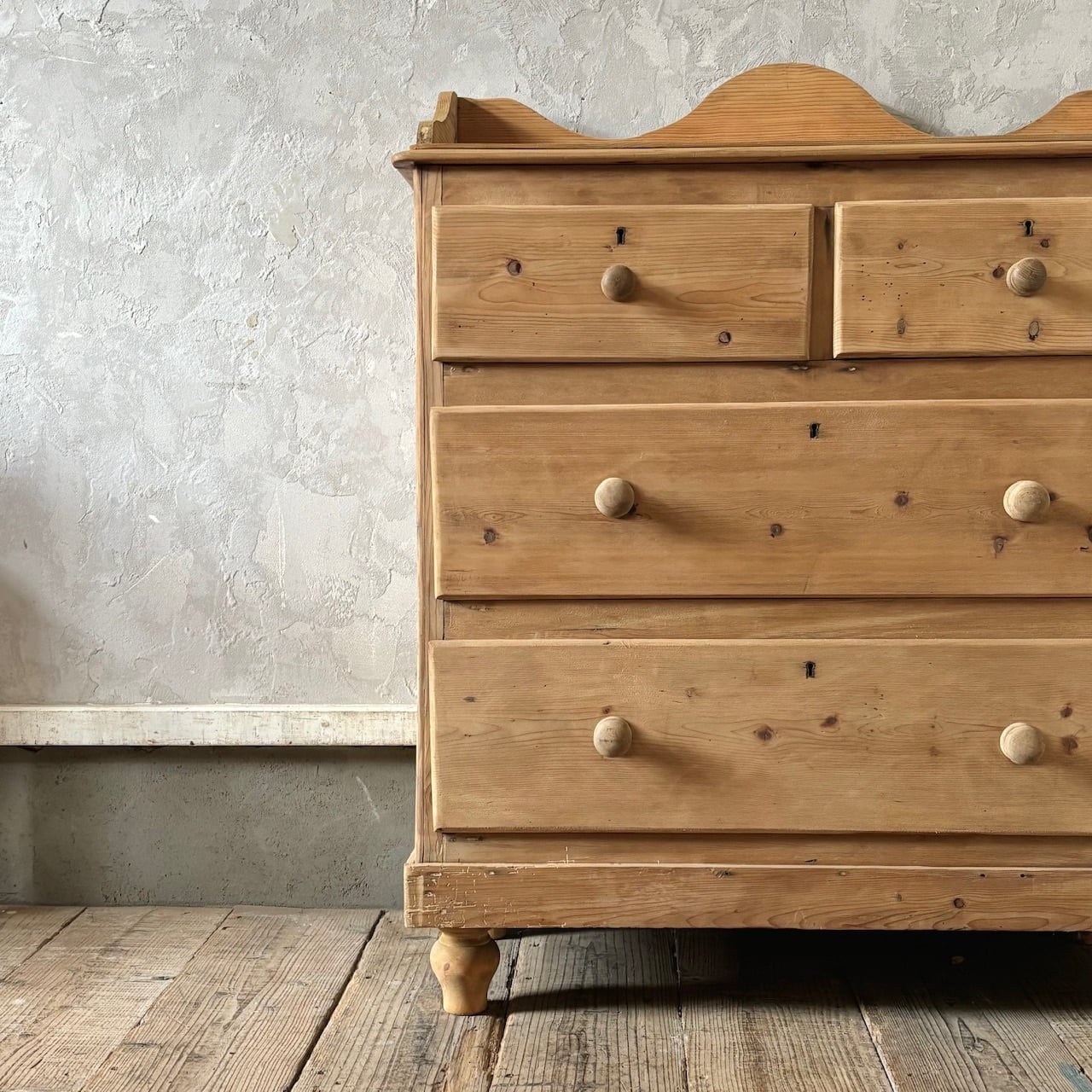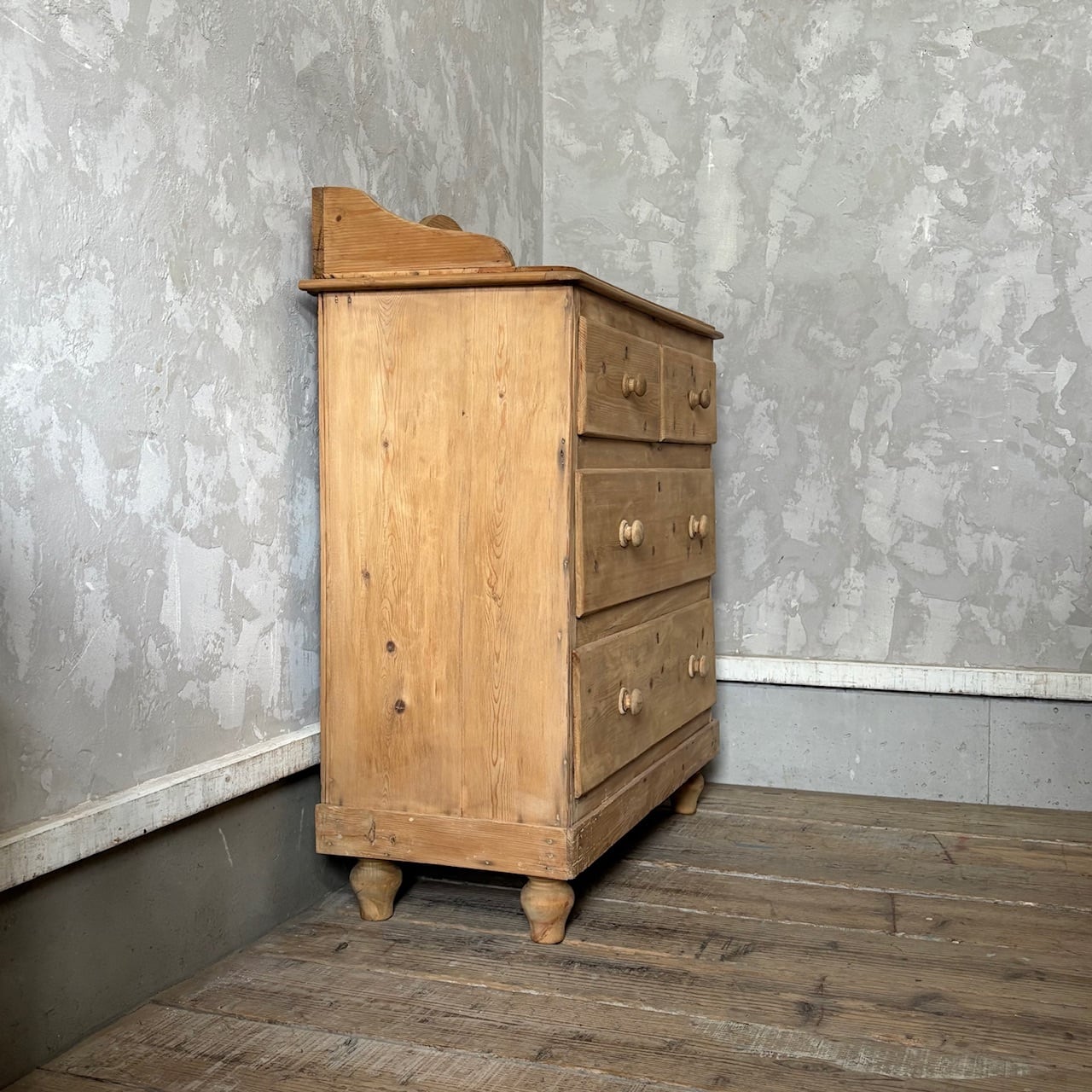 オールドパインの素朴な佇まいのチェスト。やや広めの天板部分を囲うようにつけられた装飾が華やかな印象で、飾るものを引き立ててくれます。引出し部分は奥行と幅が十分にあるので収納力があり、内部も良い状態です。飾り棚として使ったり、寝室や洗面所などでの収納にも良さそうです。
