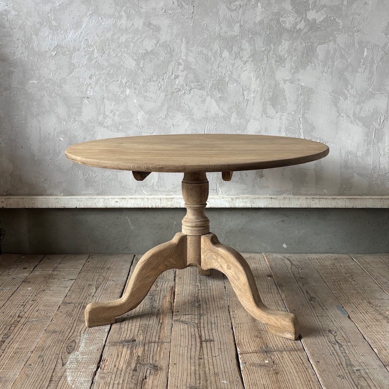 2〜3人掛け程のサイズ感の高さが低めの丸天板のテーブル。古いものならではの経年で歪んだ形や補修跡などの味わい深い表情が良く、少しボリュームのある脚と全体的にぽってりとした形が可愛いです。ソファなど低めの椅子と合わせるとゆったりとした感じで使えます。天板は折りたたみができる仕様です。