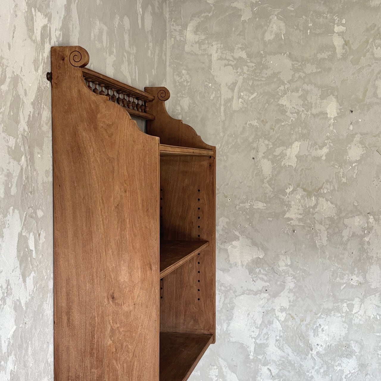 木の温もりが感じられるウォールシェルフ。奥行が深めなのでお皿なども置くことができ、棚受けの上下の位置を変えることで棚板の高さを変えることができます。トップやサイド部分など所々に施された装飾が良い雰囲気で存在感を高めています。お部屋での飾り棚 / 本棚としてやキッチン脇での食器棚としてなど様々な場所で使えそうです。背面には壁付け用の金具がついています。