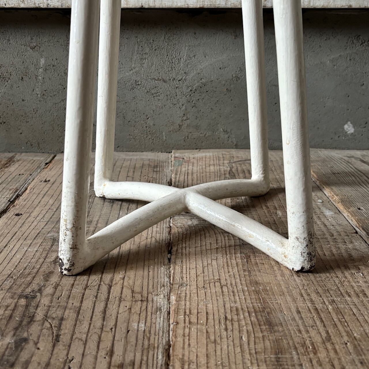 綺麗な木目の木の座面と白くペイントされたアイアンの脚との組み合わせが可愛い2トーンのスツール。実用できるしっかりとしたつくりで、中心が少し窪んだ形の丸い座面が良い座り心地です。お部屋や台所脇でのちょっとした腰掛けとしてなど様々な用途で使えそうです。