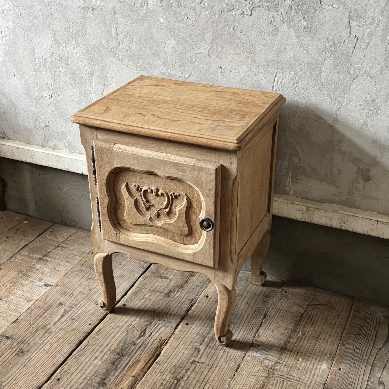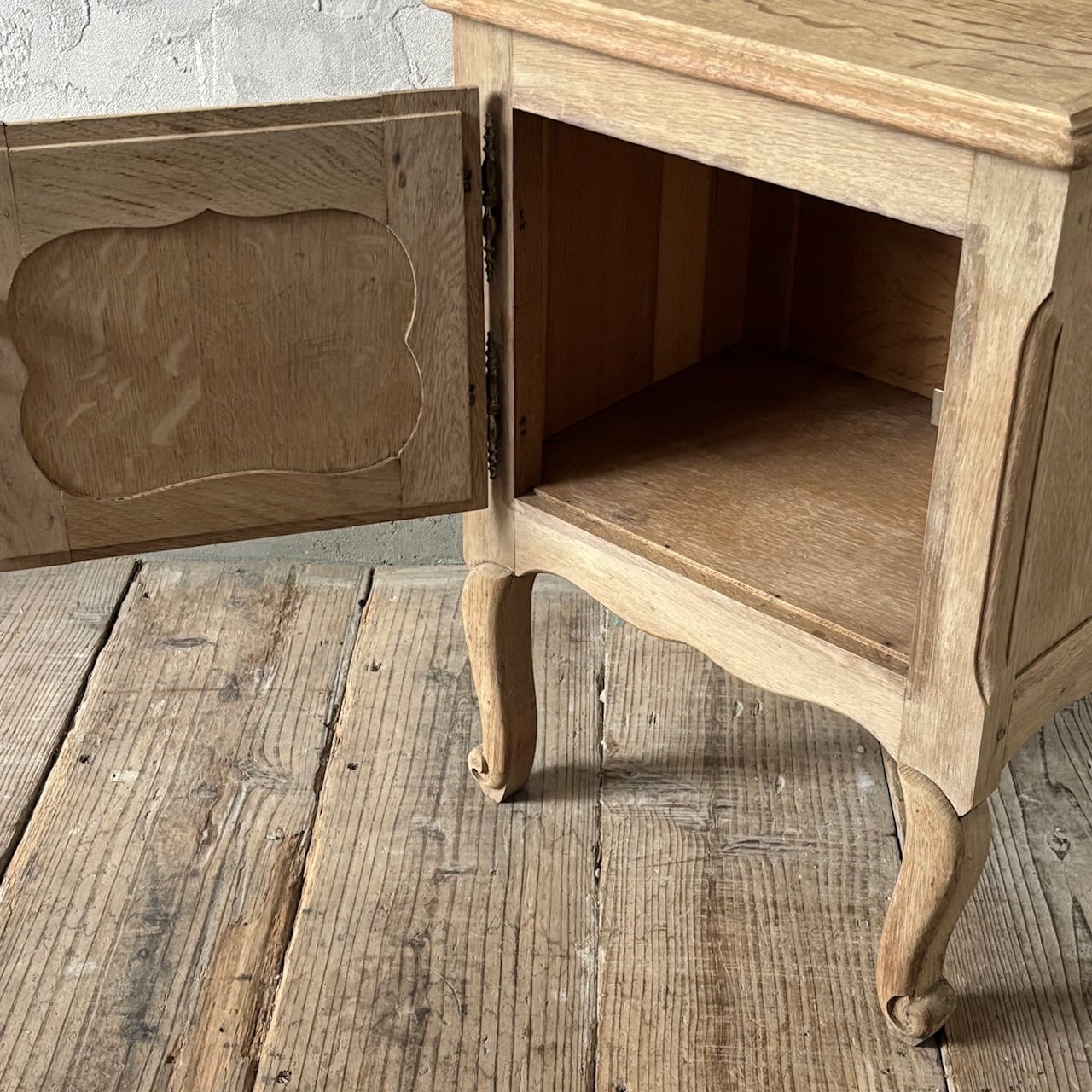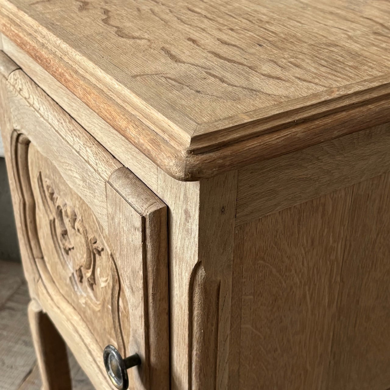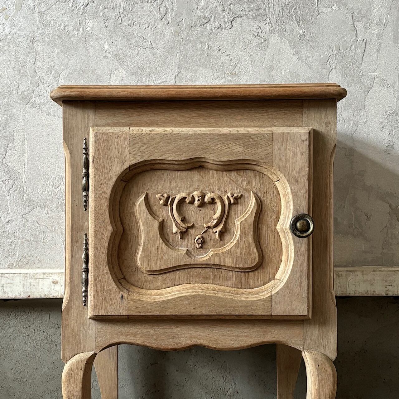 高さが低めのサイドキャビネット。扉に施された装飾や金具と猫脚がクラシカルな印象です。扉を開けると中は仕切りのない空間で、小さめながら収納力があります。