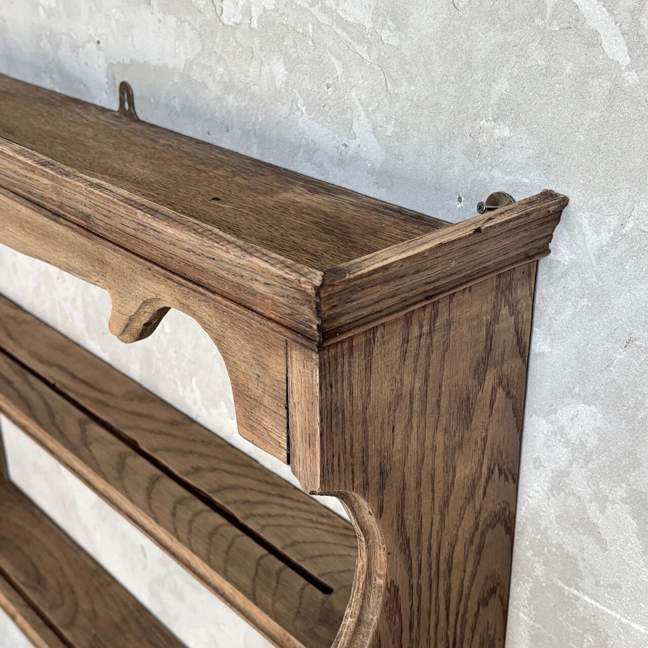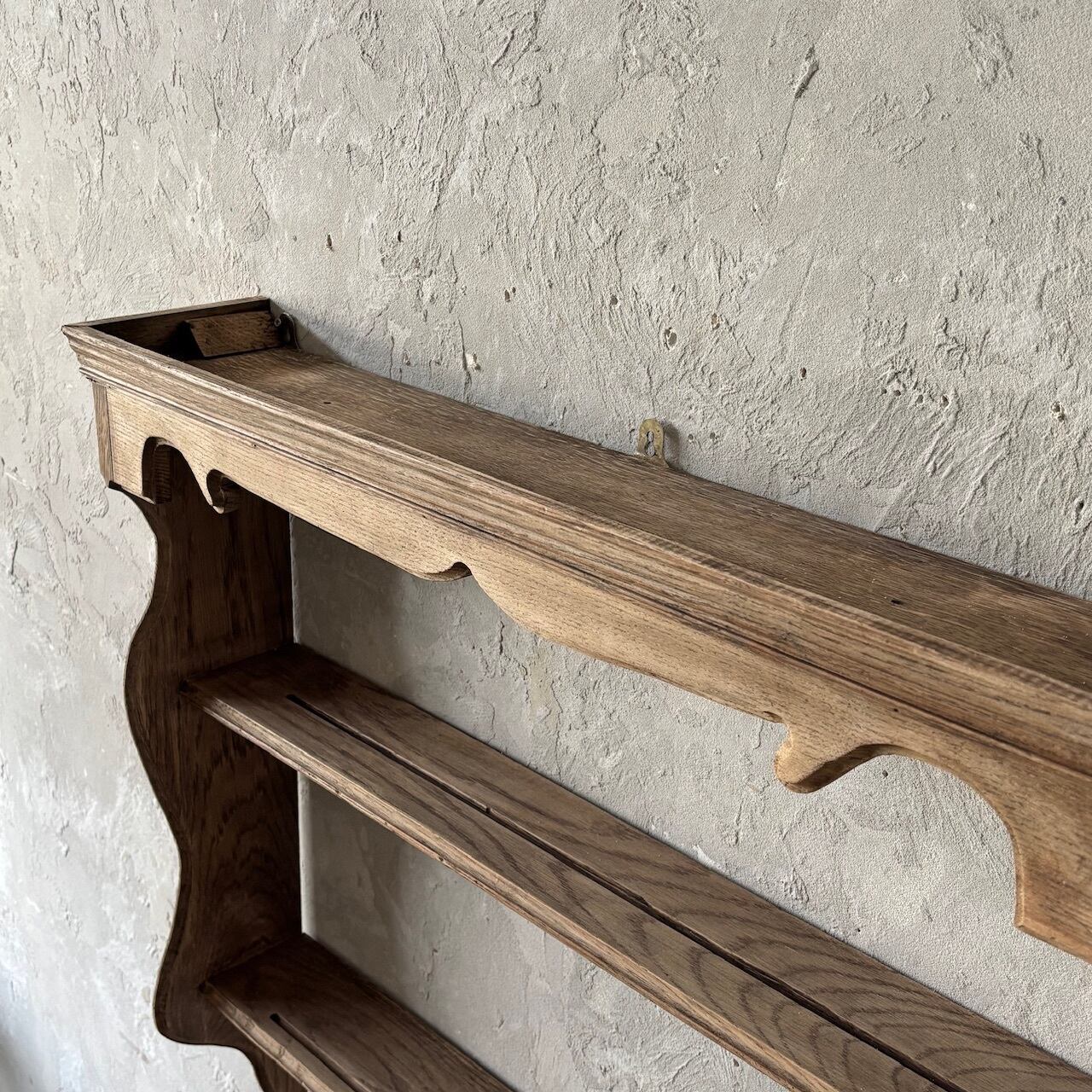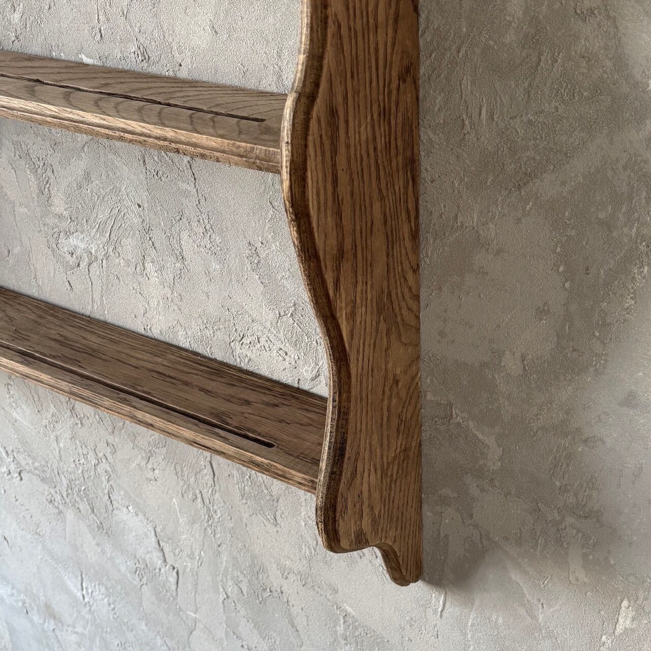 木の温もりが感じられる質感のウォールシェルフ。大きすぎず奥行が浅めなので壁面に飾った際の圧迫感がなく空間に溶け込みやすいです。各棚板にはお皿を立てかけて飾れるように溝がはいっています。背面には壁付け用の金具がついています。