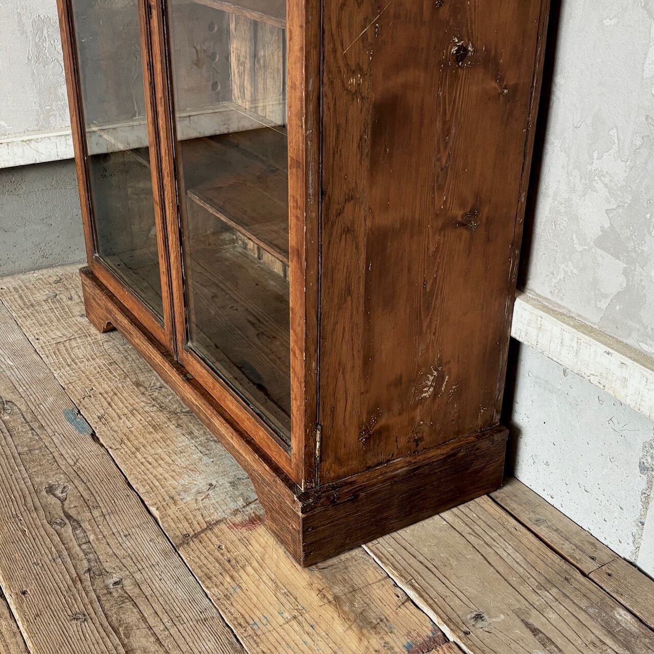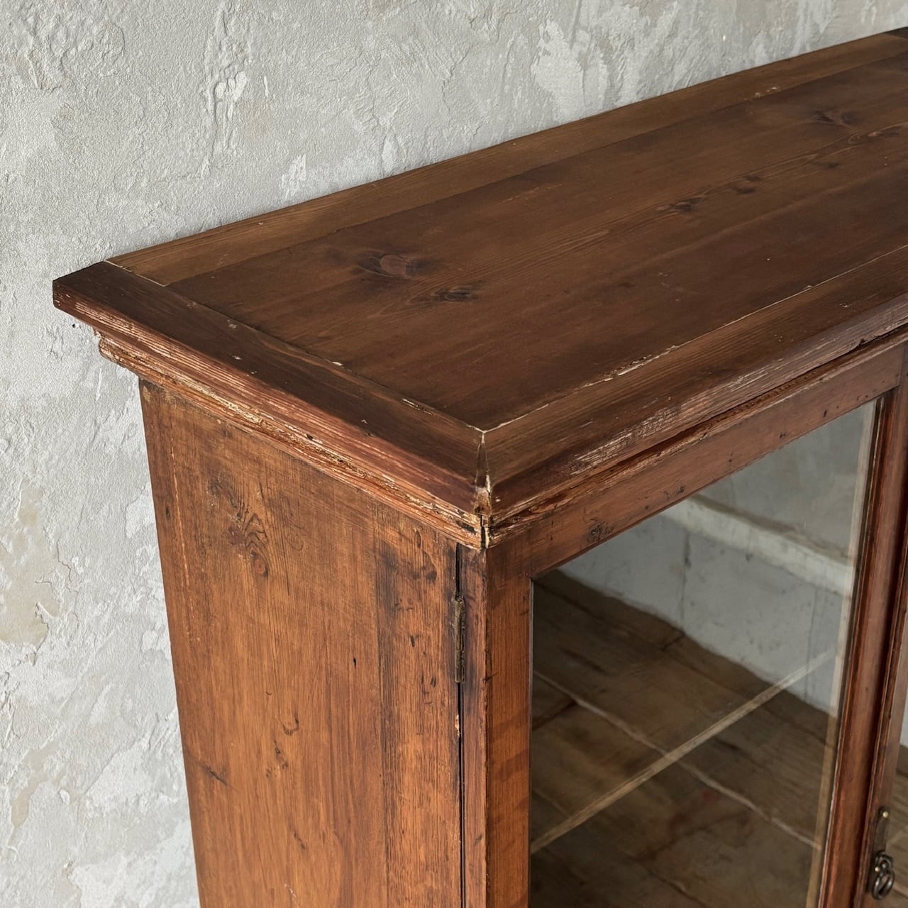 程よいサイズ感のガラスキャビネット。古いものならではの経年した木の表情と深みのある色合いが良く、高さが低めで奥行が浅めなので置いた際の圧迫感がありません。ガラス面が大きいので中が良く見え、シンプルなデザインなので空間に合わせやすいです。キッチン脇での食器棚、リビングでの飾り棚 / 本棚としてなど様々な場所で使えそうです。棚受けを移動させることで棚板の上下の位置の調整が可能です。