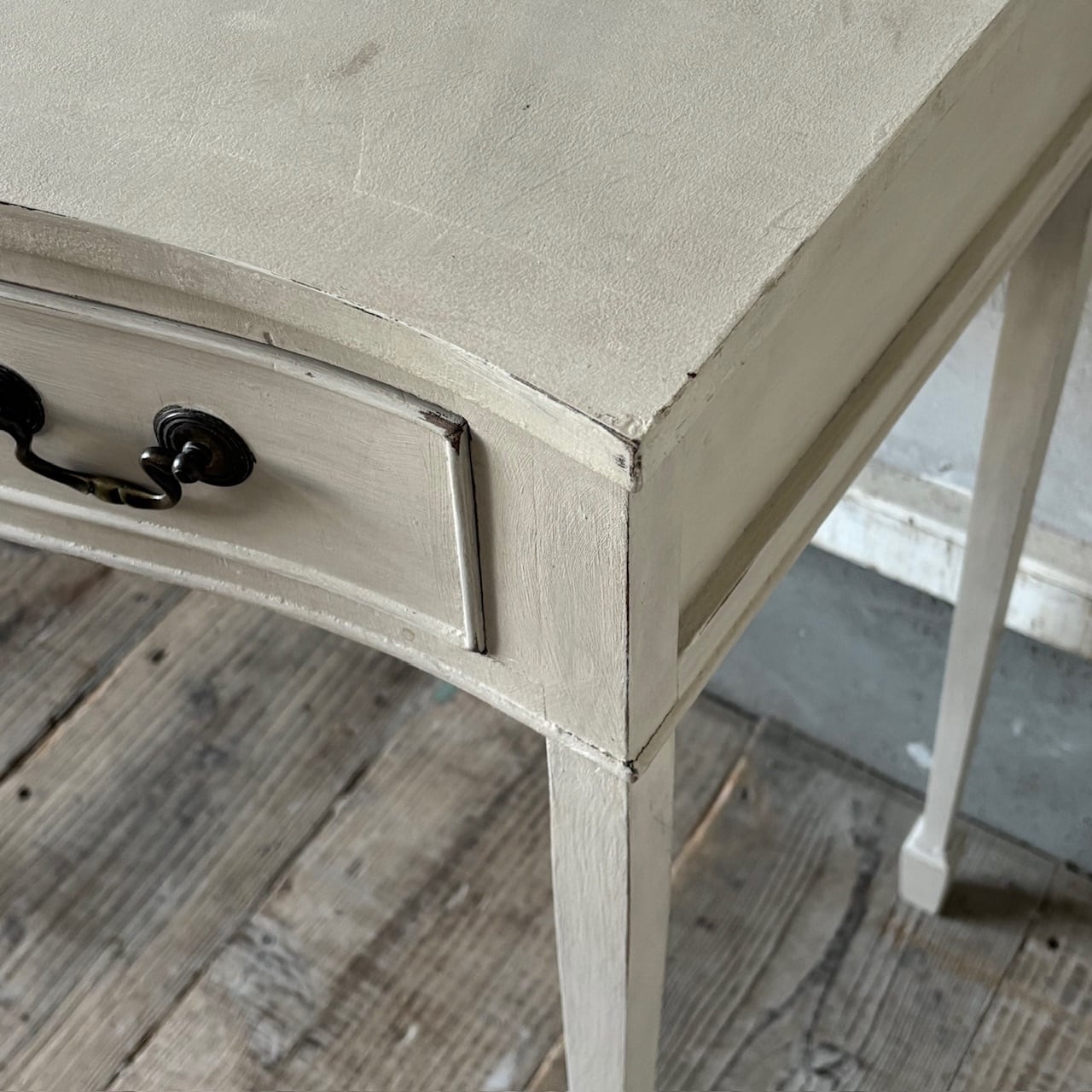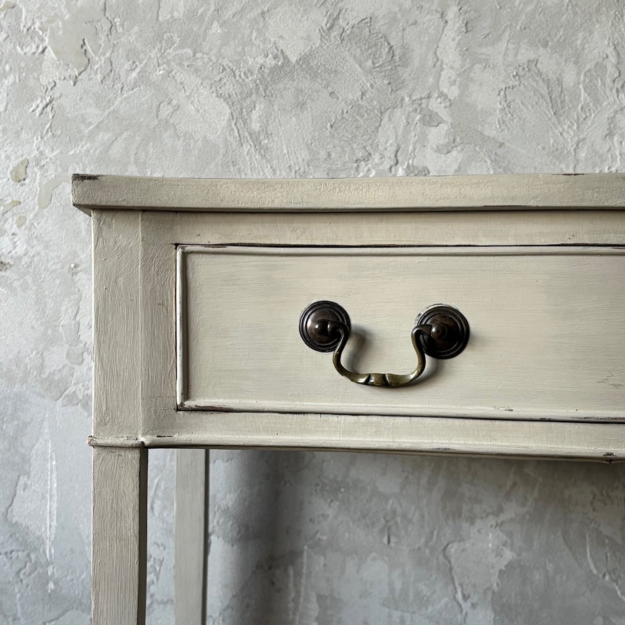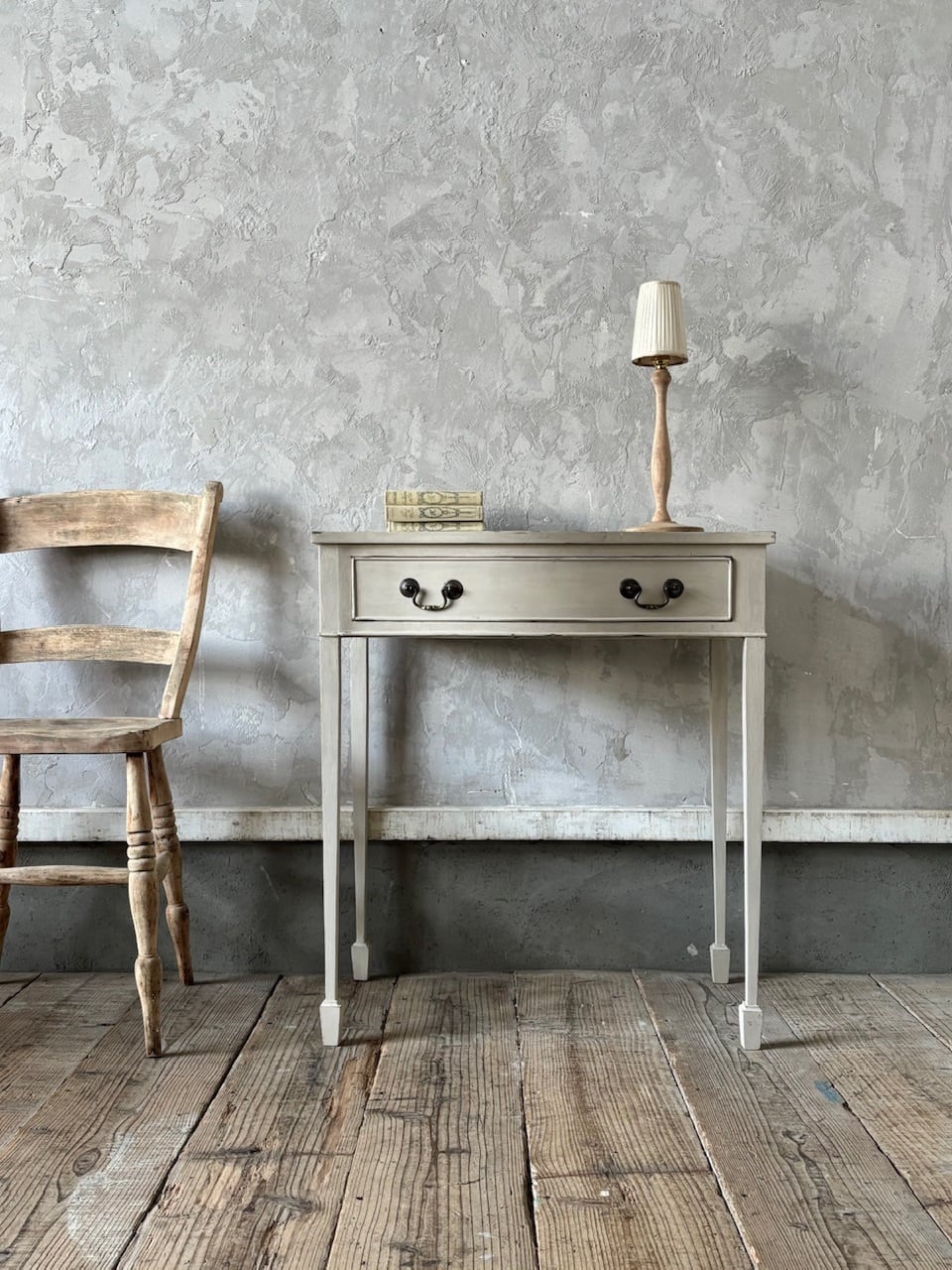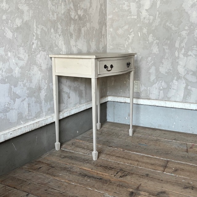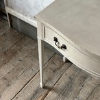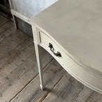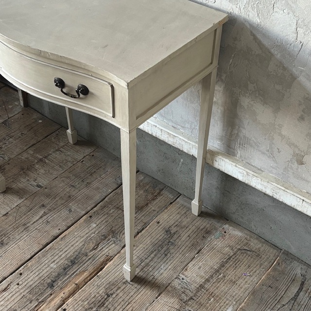 引き出し付きの小さめのデスク。すらりと細く伸びる脚や淡いグレージュの色合いが良く、天板の形に沿って作られた引き出しの形も可愛いです。デスクとしてはもちろん鏡と合わせてドレッサーのように使っても良さそうです。