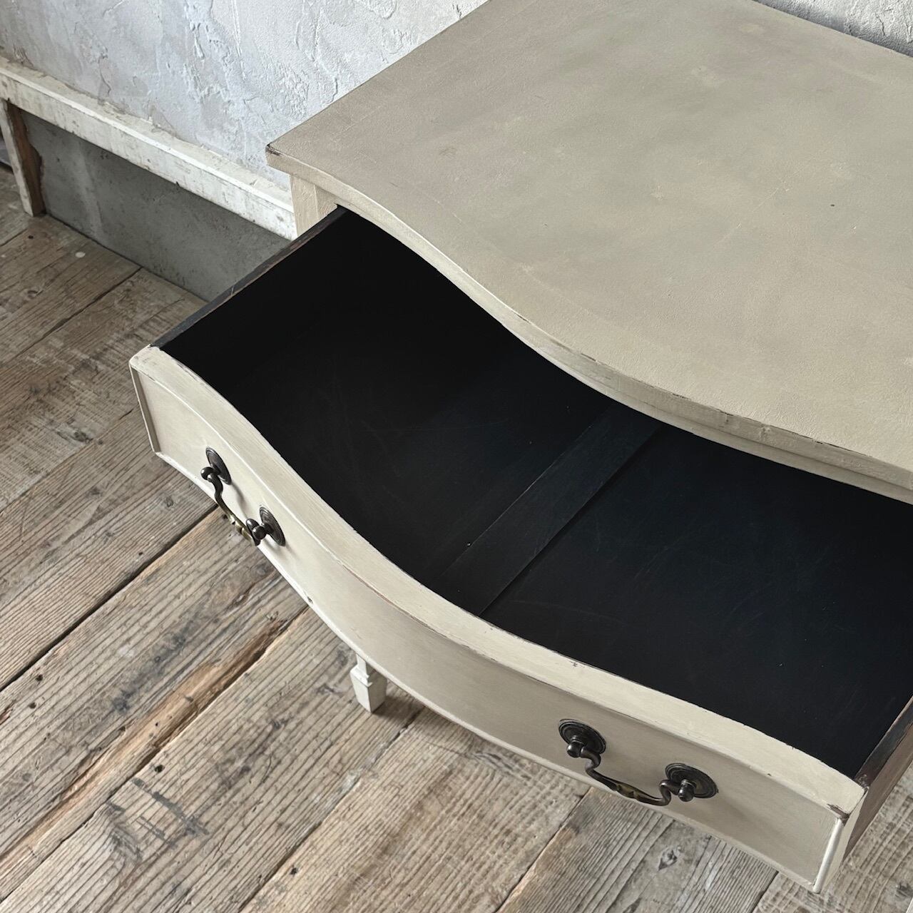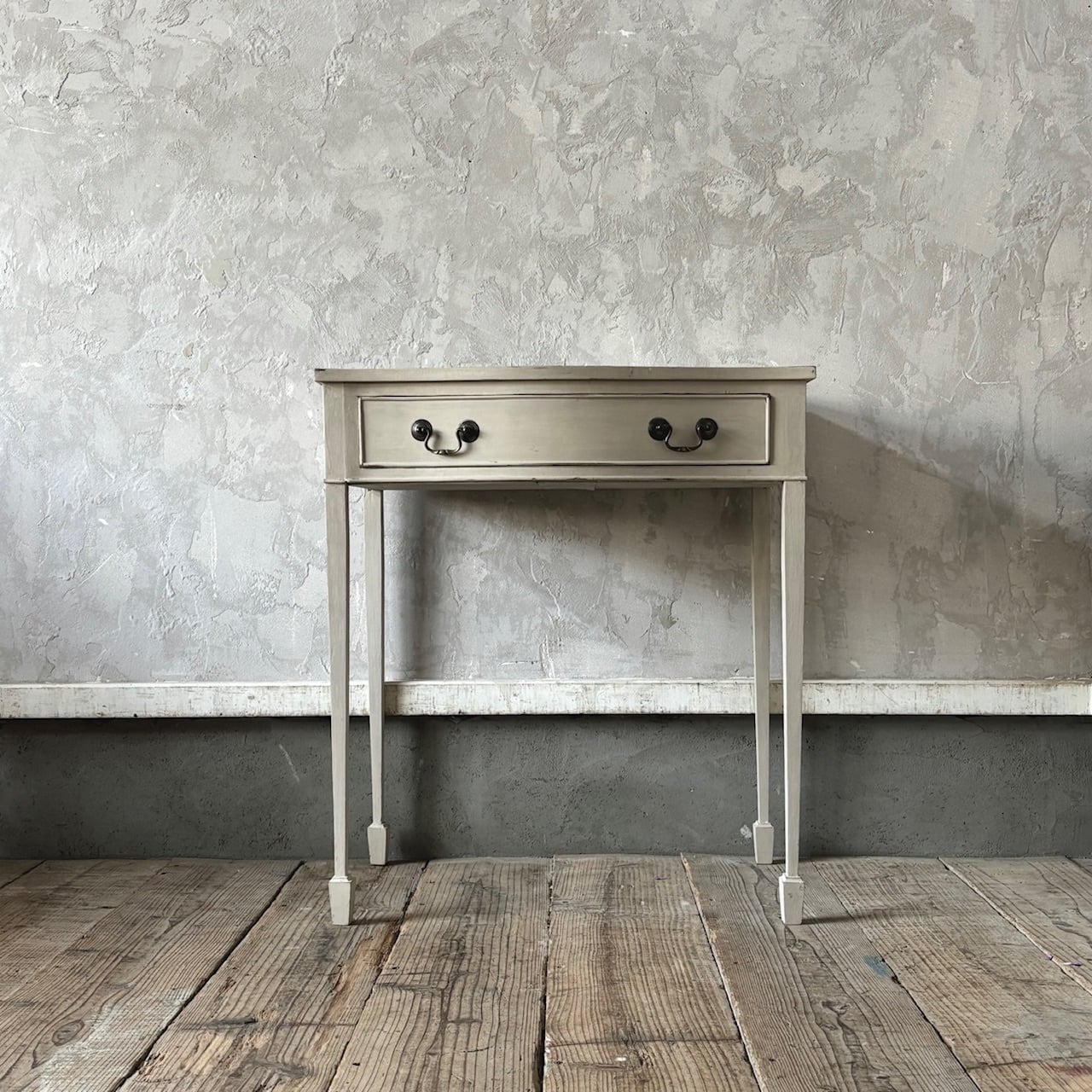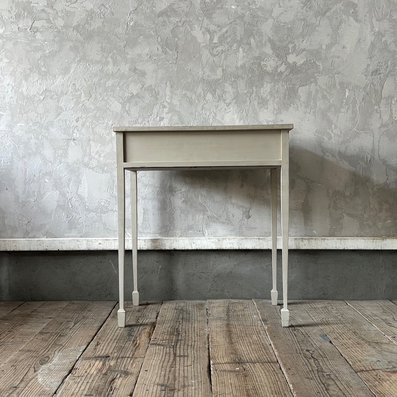 引き出し付きの小さめのデスク。すらりと細く伸びる脚や淡いグレージュの色合いが良く、天板の形に沿って作られた引き出しの形も可愛いです。デスクとしてはもちろん鏡と合わせてドレッサーのように使っても良さそうです。