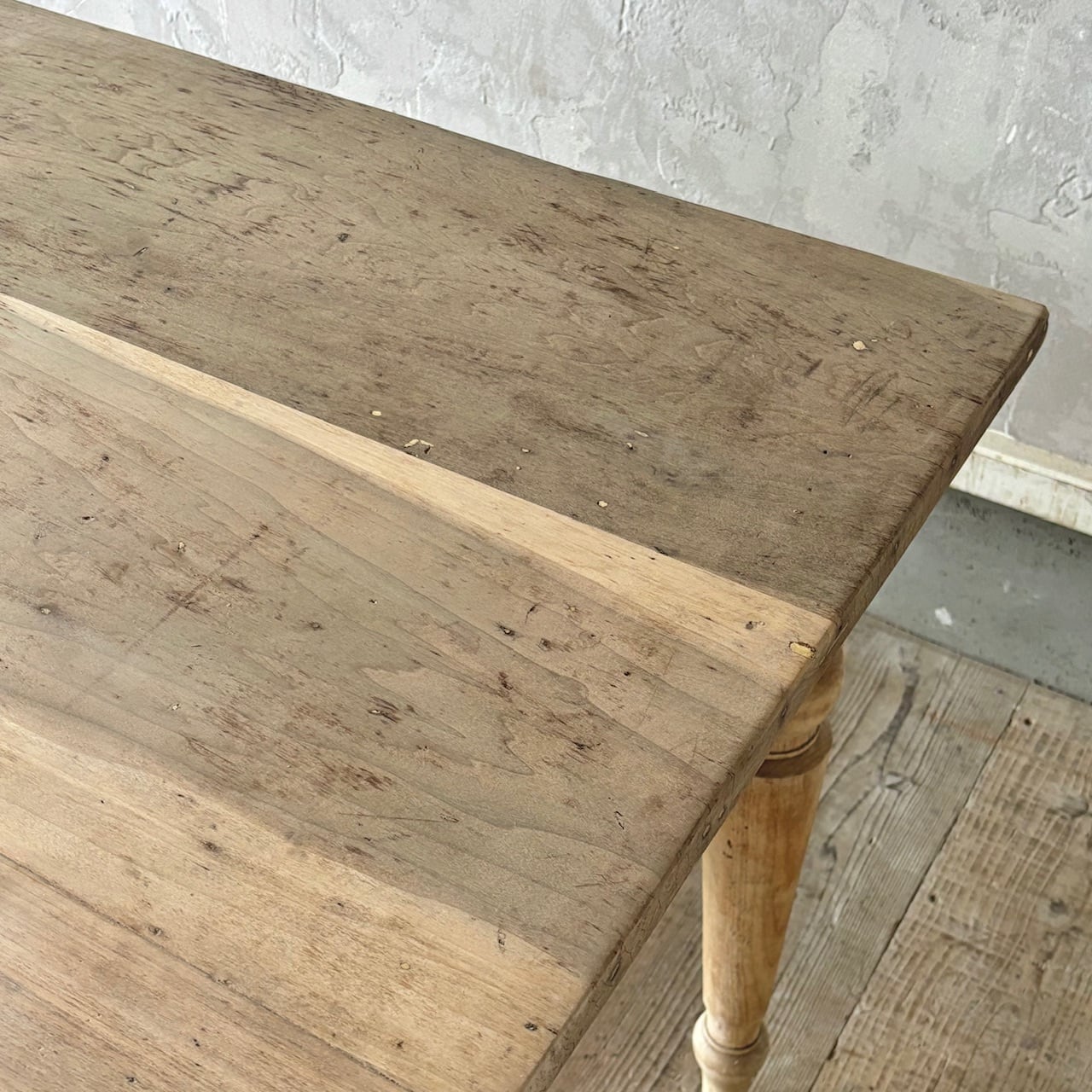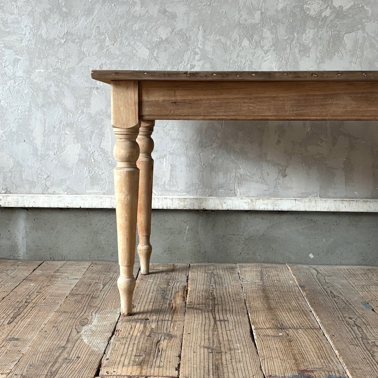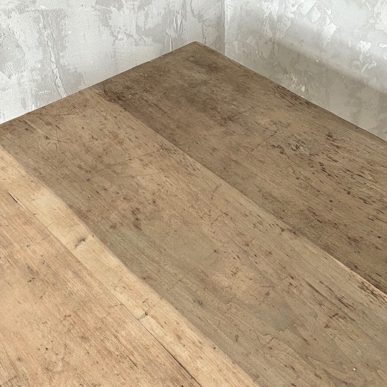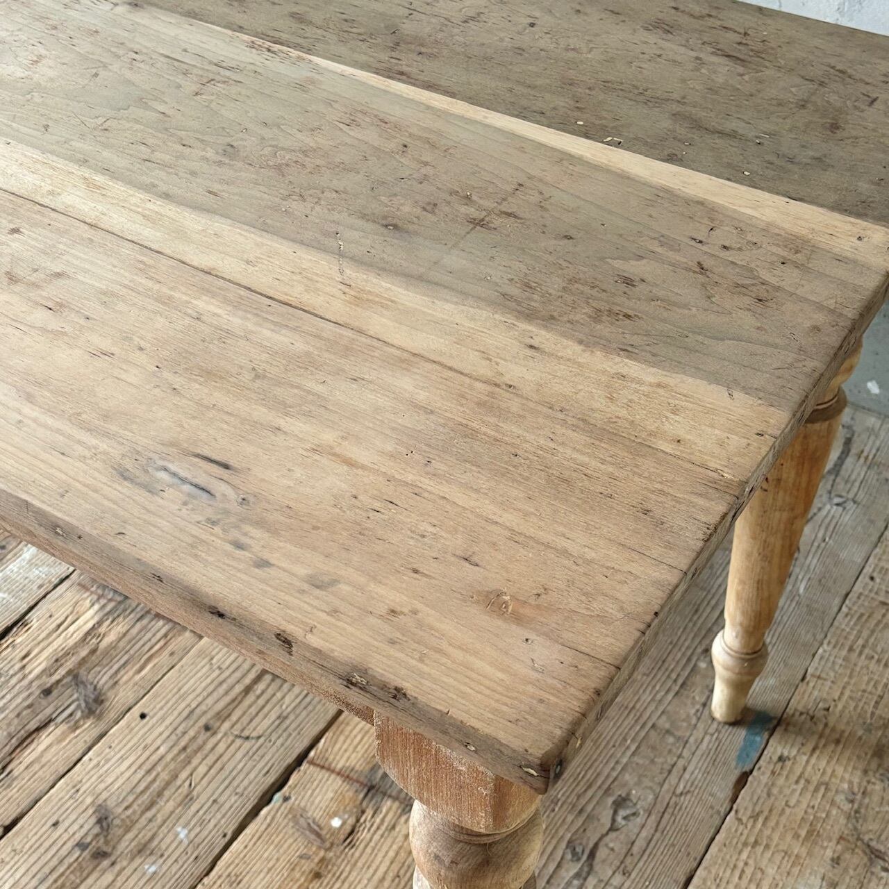 2〜4人掛け位のサイズ感のテーブル。力強さを感じる無駄のないデザインとしっかりとしたつくりで、経年した味わい深い木の表情も良い雰囲気です。高さ調整の脚のカットは可能です。
