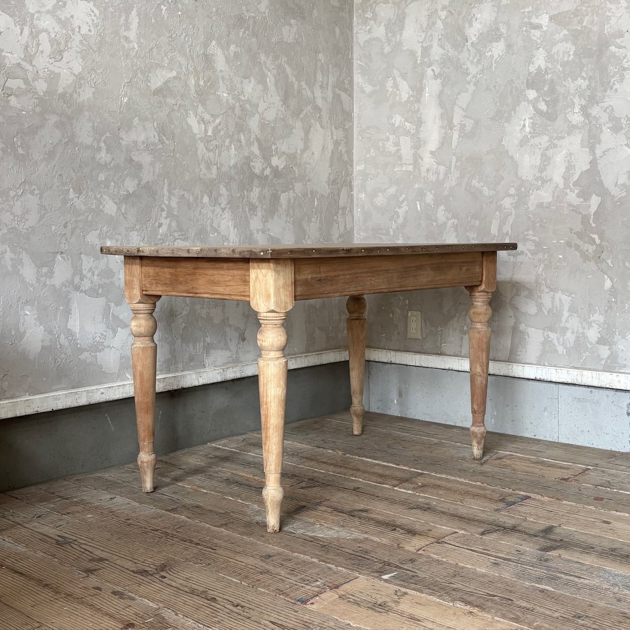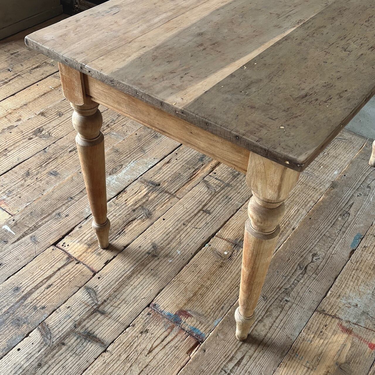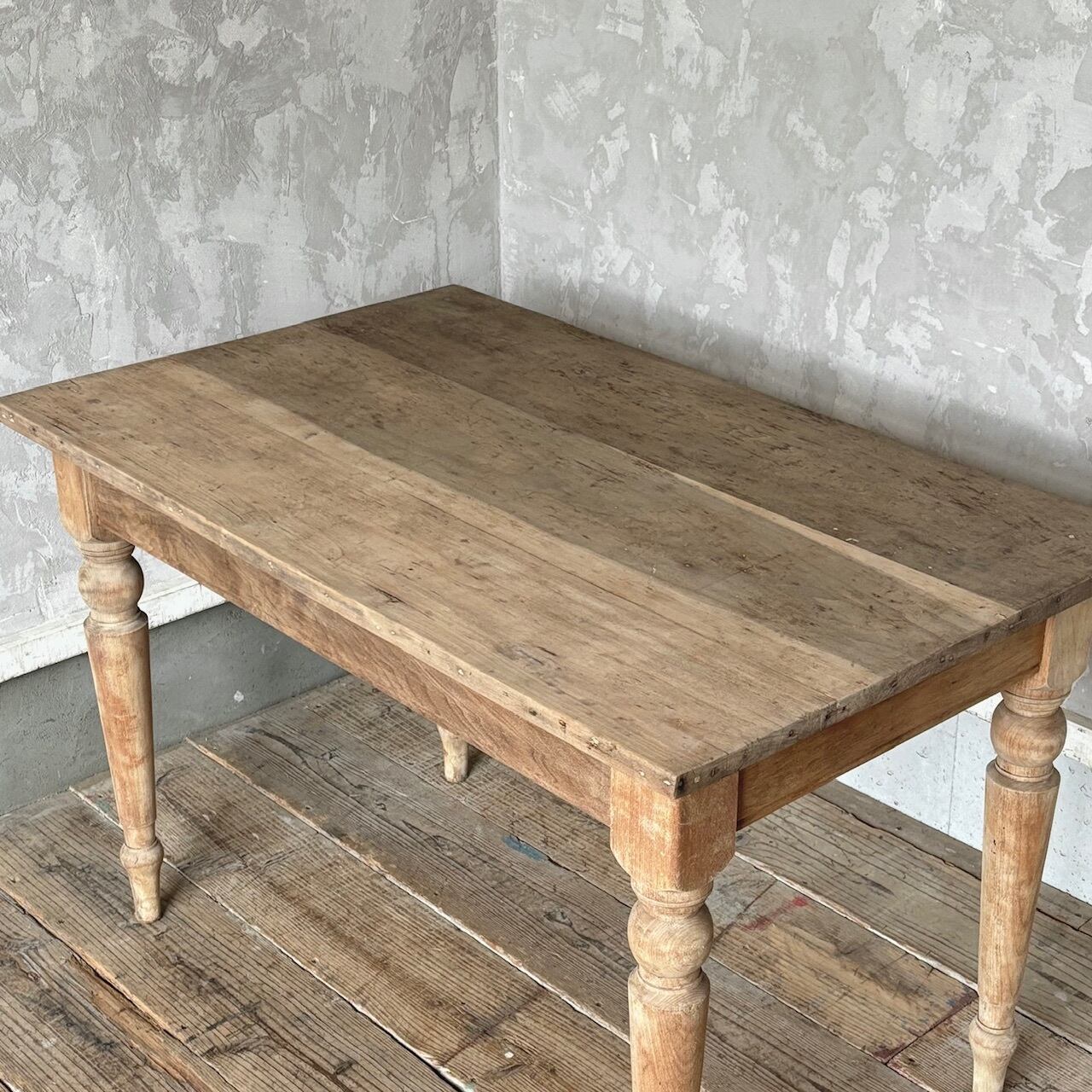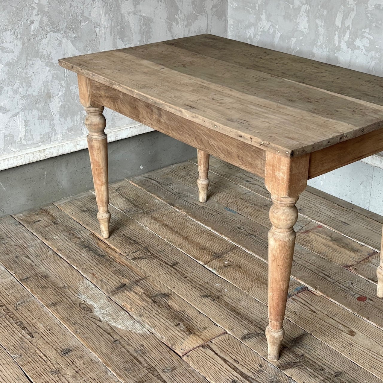 2〜4人掛け位のサイズ感のテーブル。力強さを感じる無駄のないデザインとしっかりとしたつくりで、経年した味わい深い木の表情も良い雰囲気です。高さ調整の脚のカットは可能です。