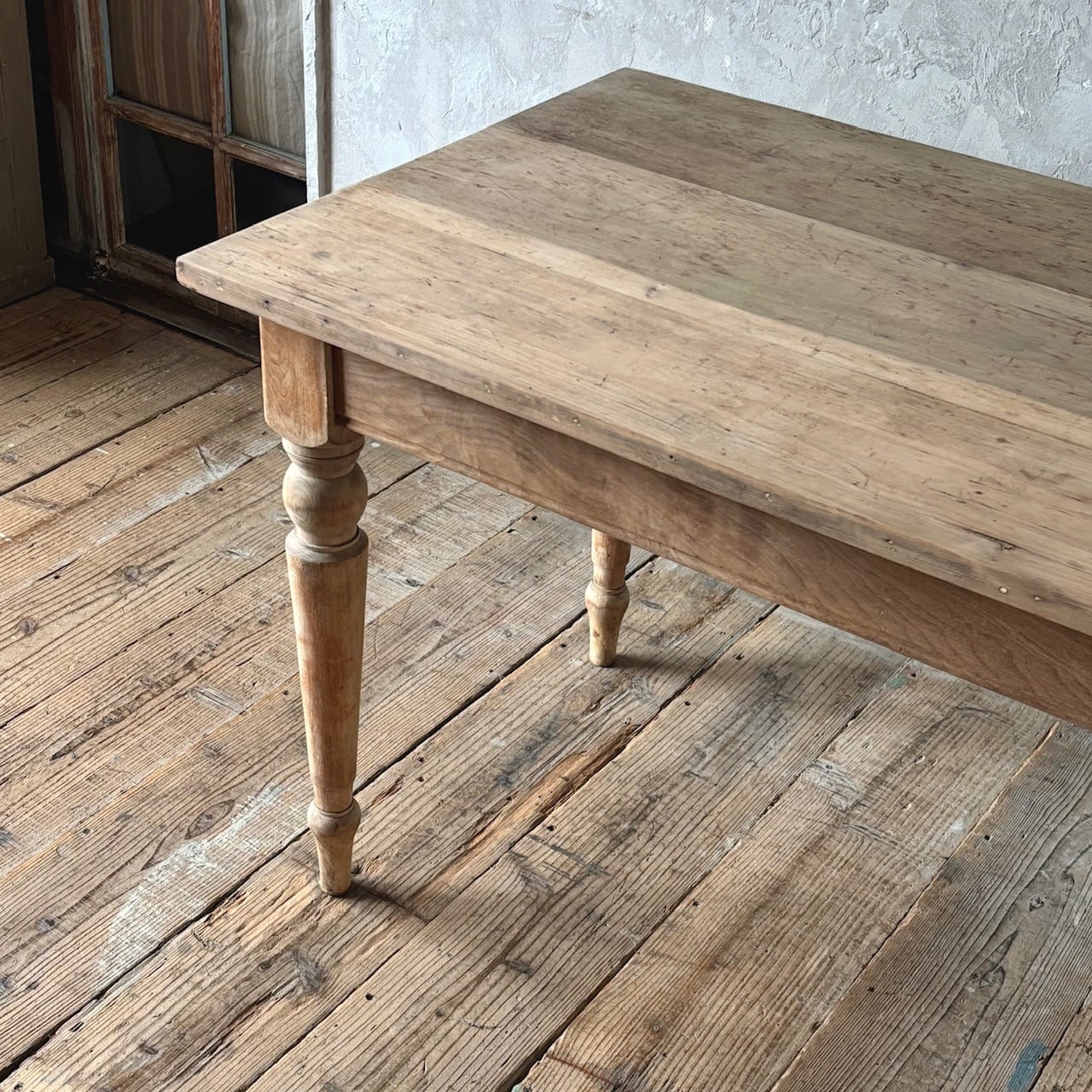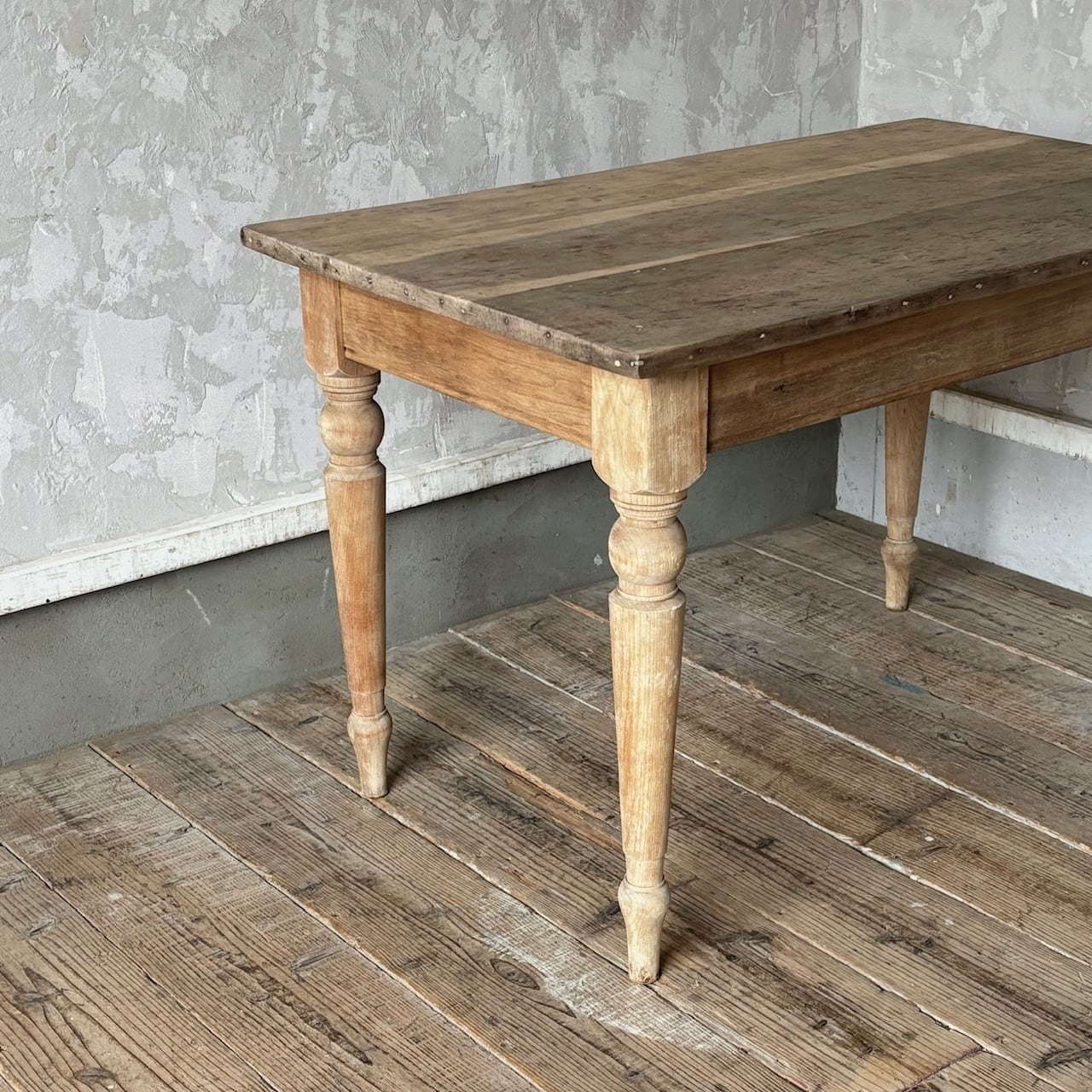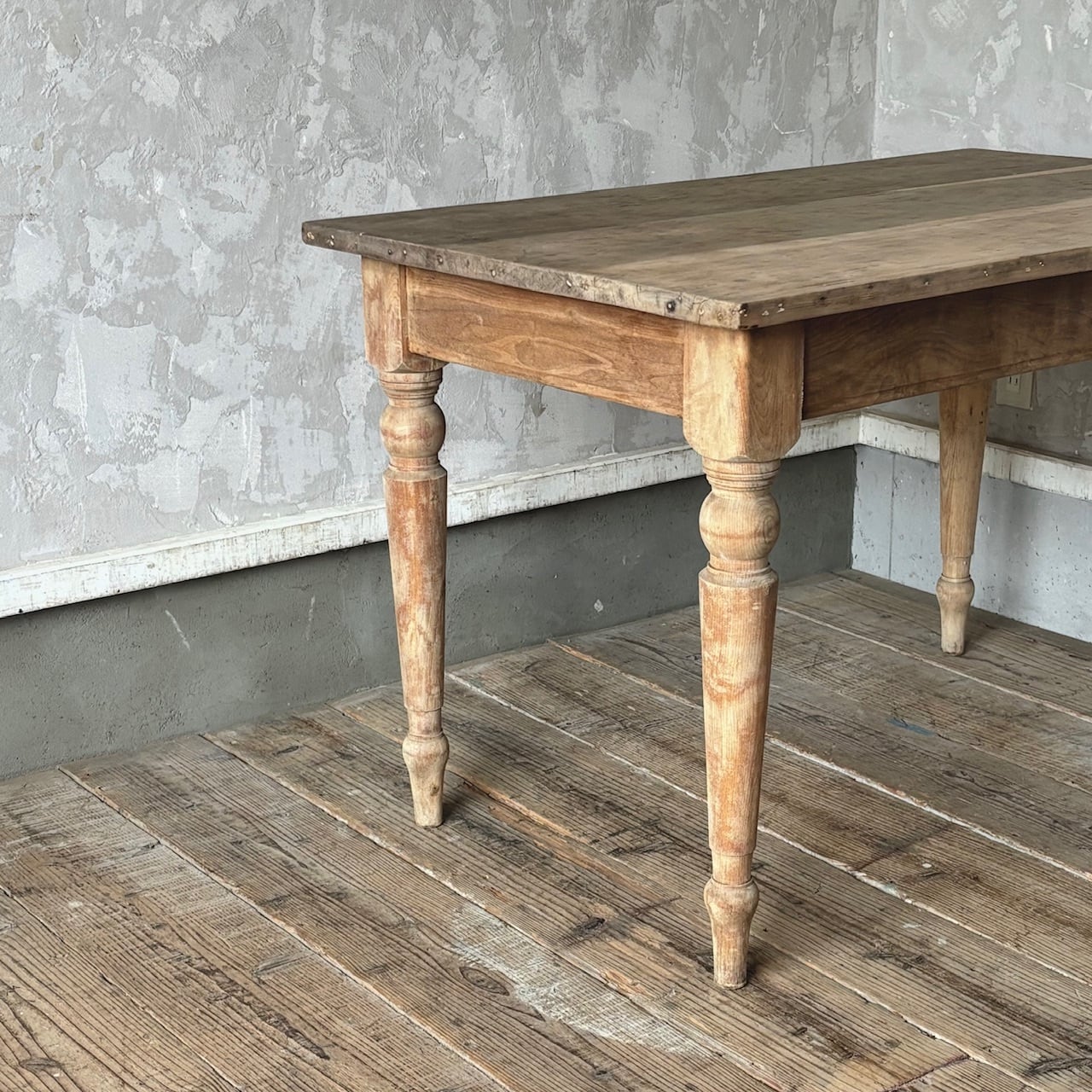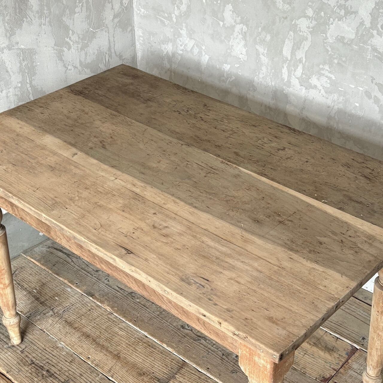2〜4人掛け位のサイズ感のテーブル。力強さを感じる無駄のないデザインとしっかりとしたつくりで、経年した味わい深い木の表情も良い雰囲気です。高さ調整の脚のカットは可能です。