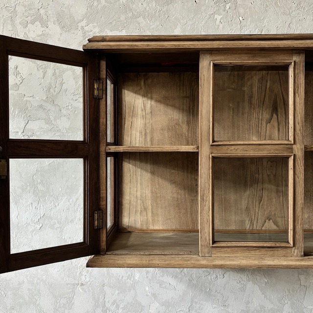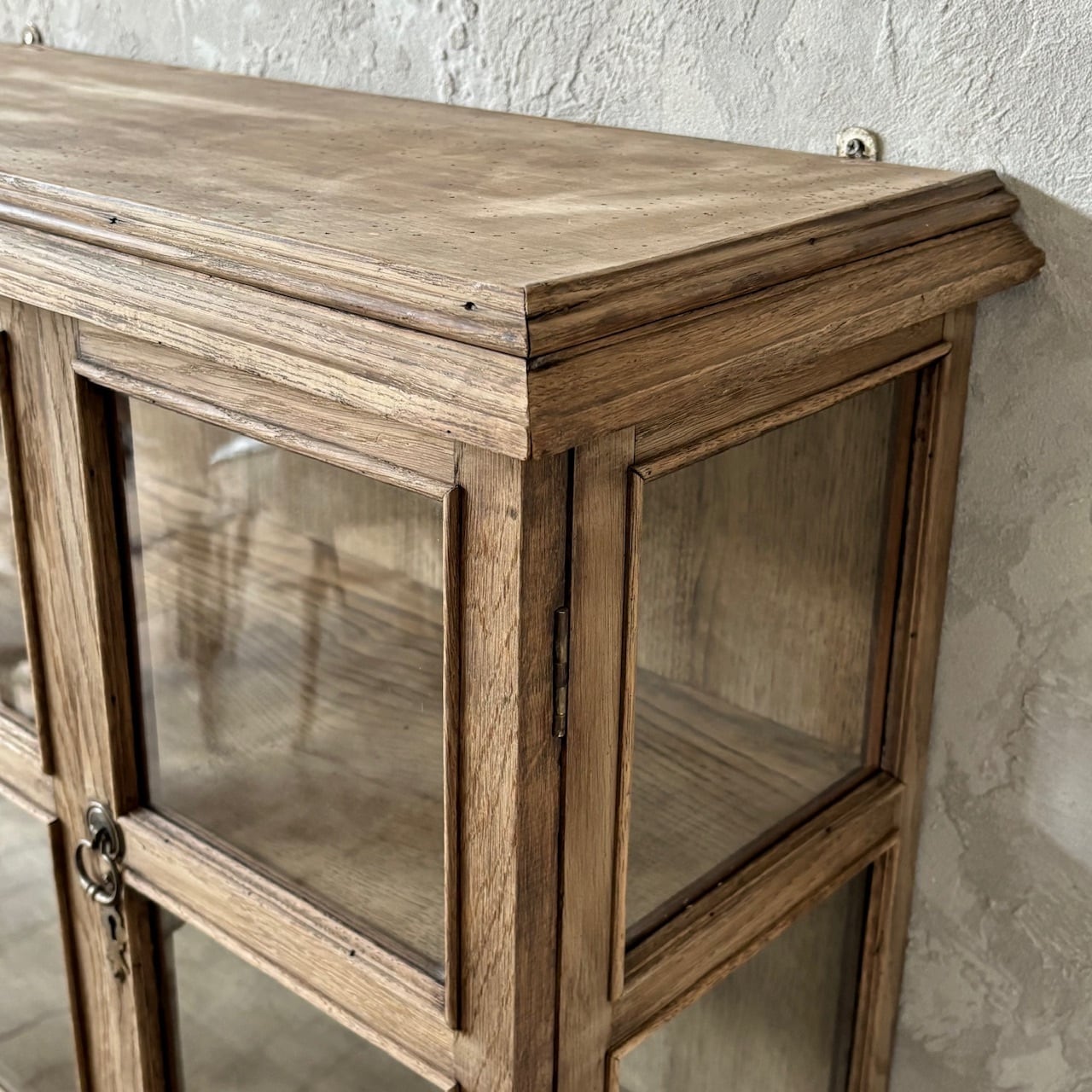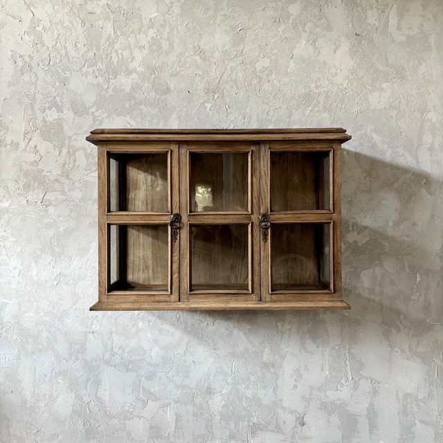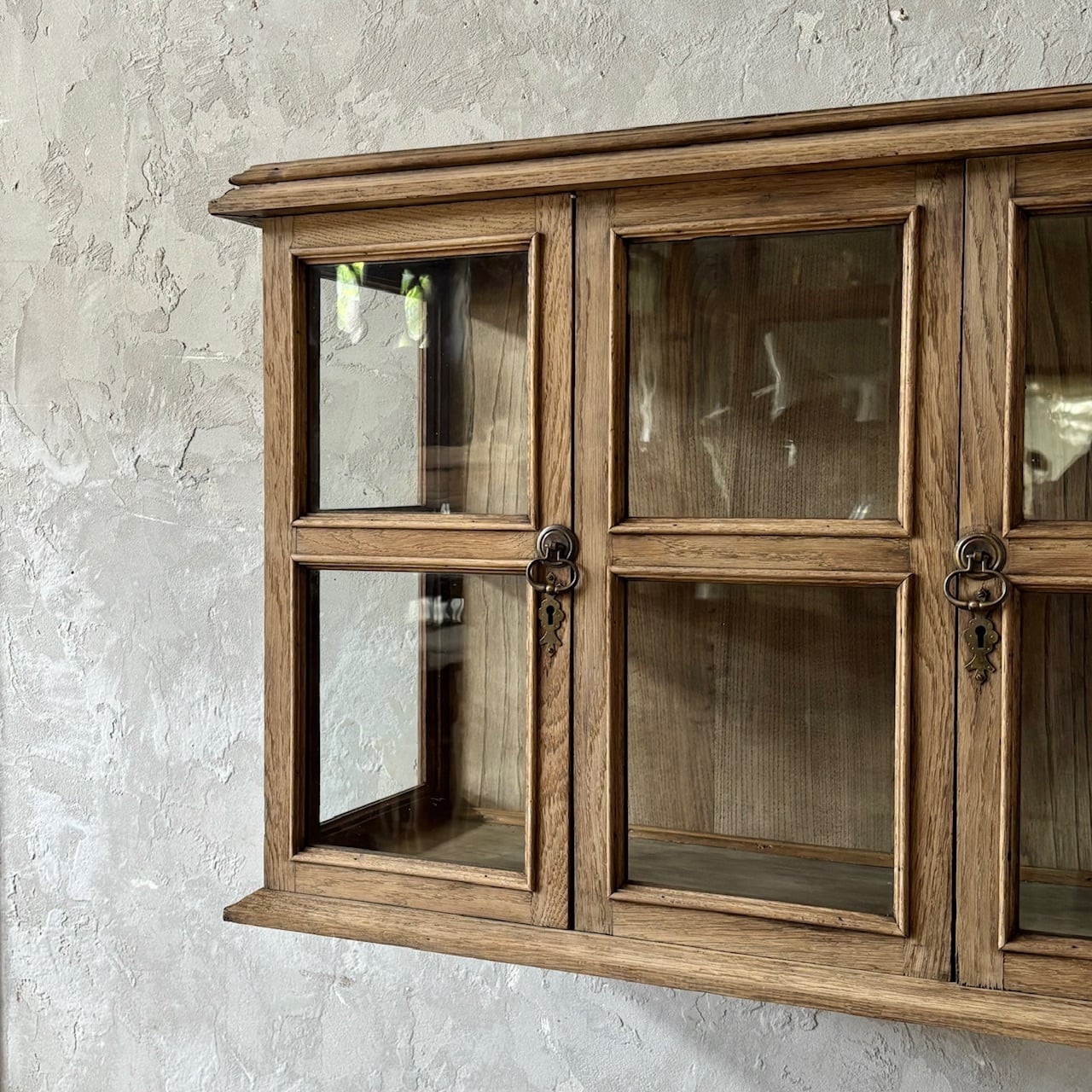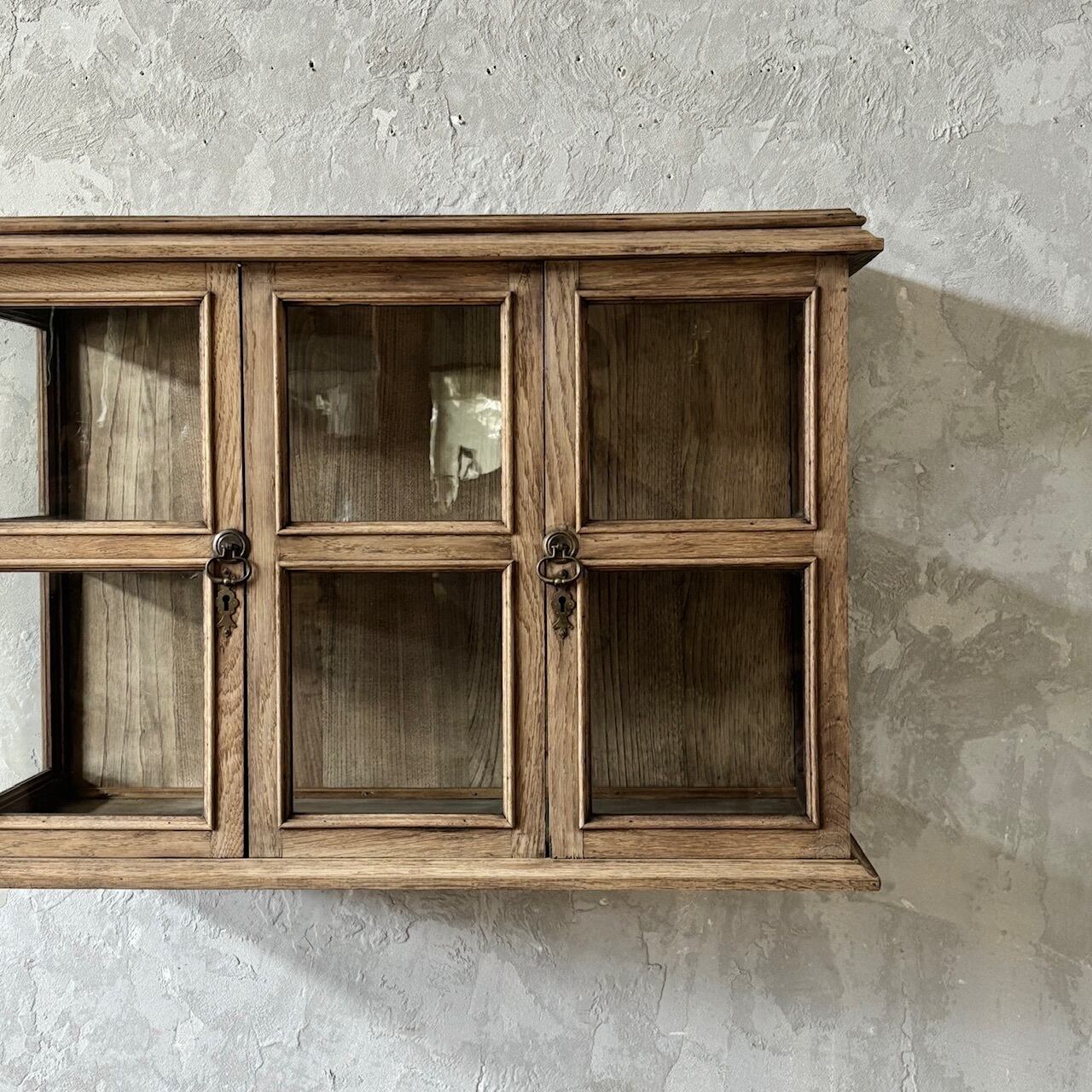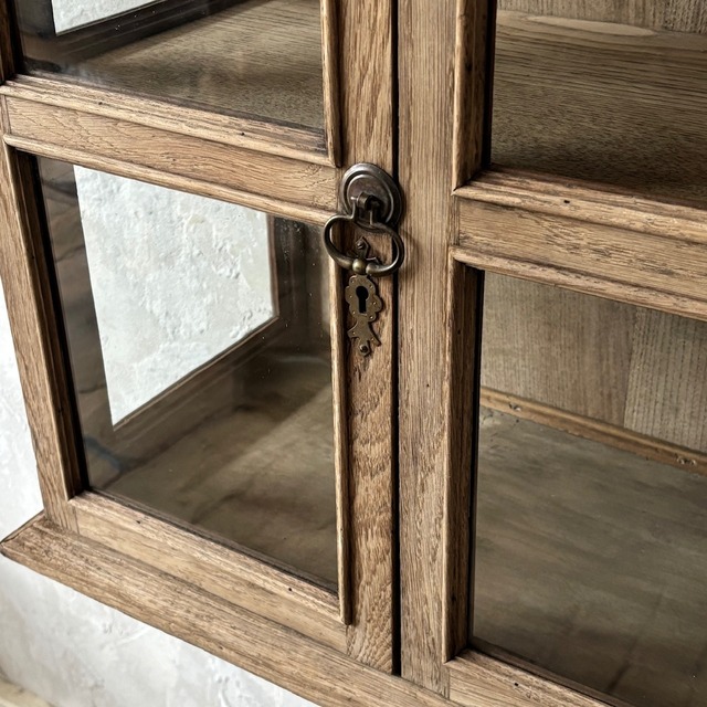 大きすぎない良いサイズ感のオーク材の3面ガラスのショーケース。1マスごとに区切られたデザインでフレームのような飾り方を楽しめます。全面にゆらゆらと揺れ映る古いガラスが残り良い雰囲気です。正面の両サイドのみ扉が開き、中は上下が棚板一枚で仕切られています。背面には壁付け用の金具が付いていますが、キャビネットやカウンターなどの上に置いても使えます。キッチン脇での食器棚としてやリビングでの飾り棚、ショップでのディスプレイ用としてなど様々な場所で使えそうです。扉には施錠可能な鍵が付いています。