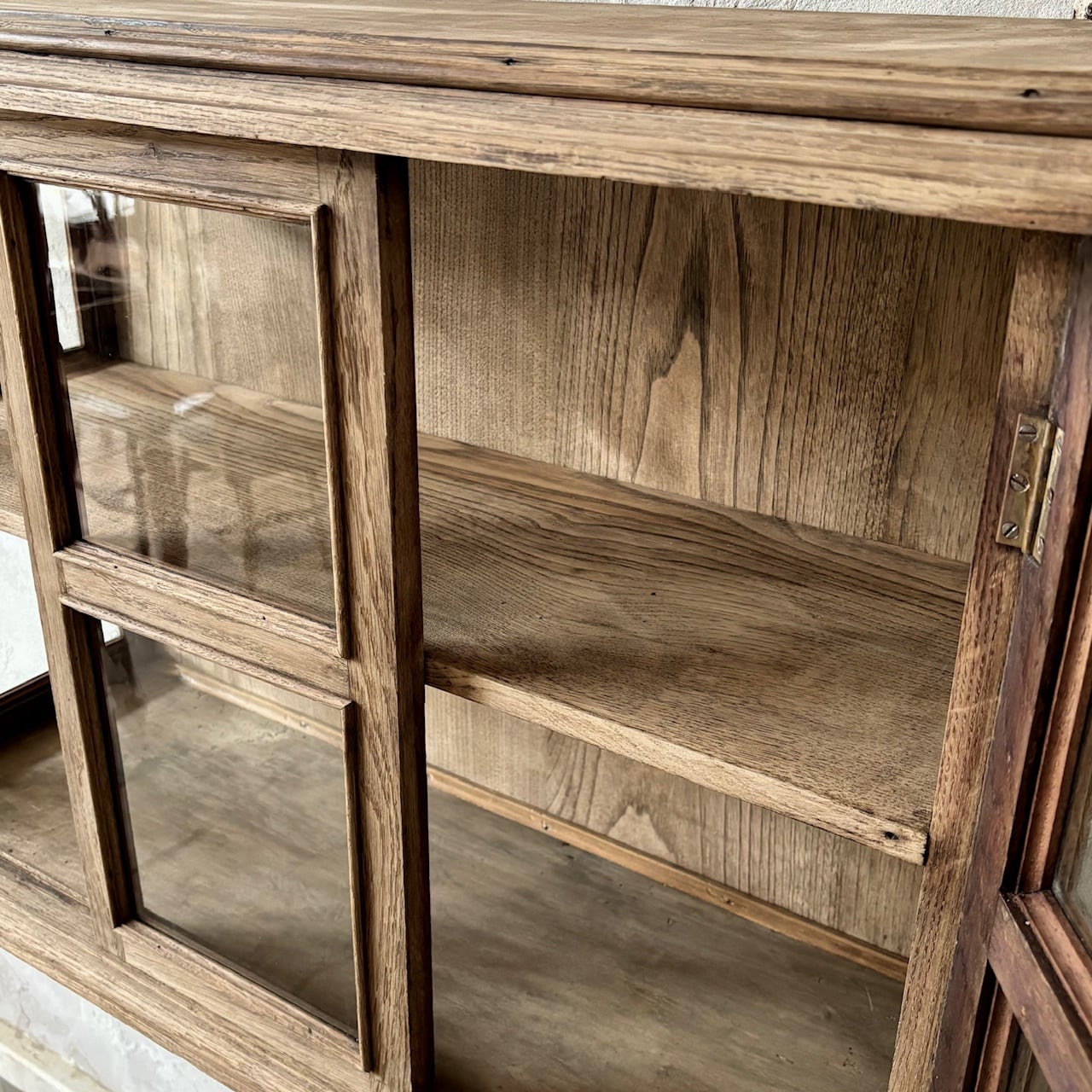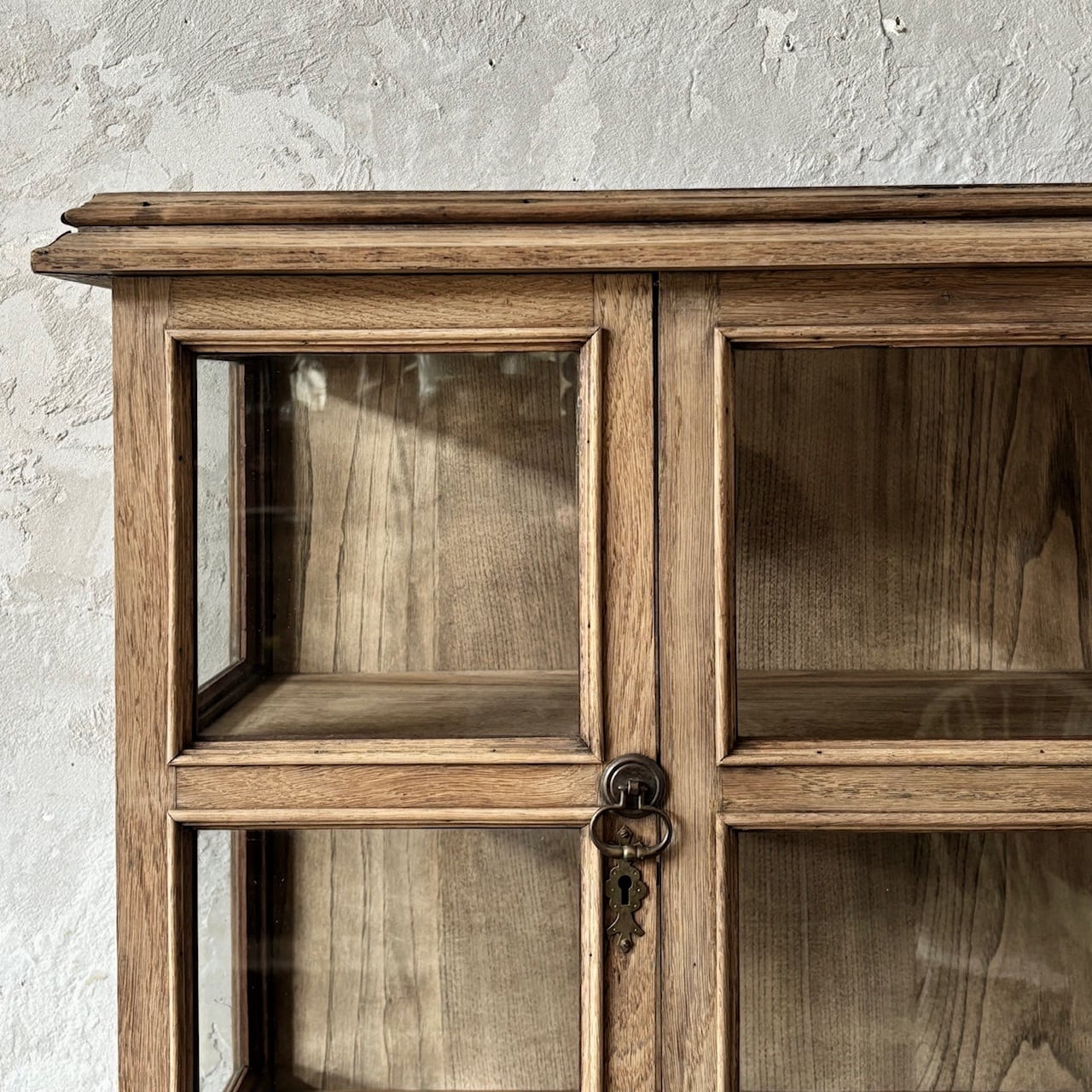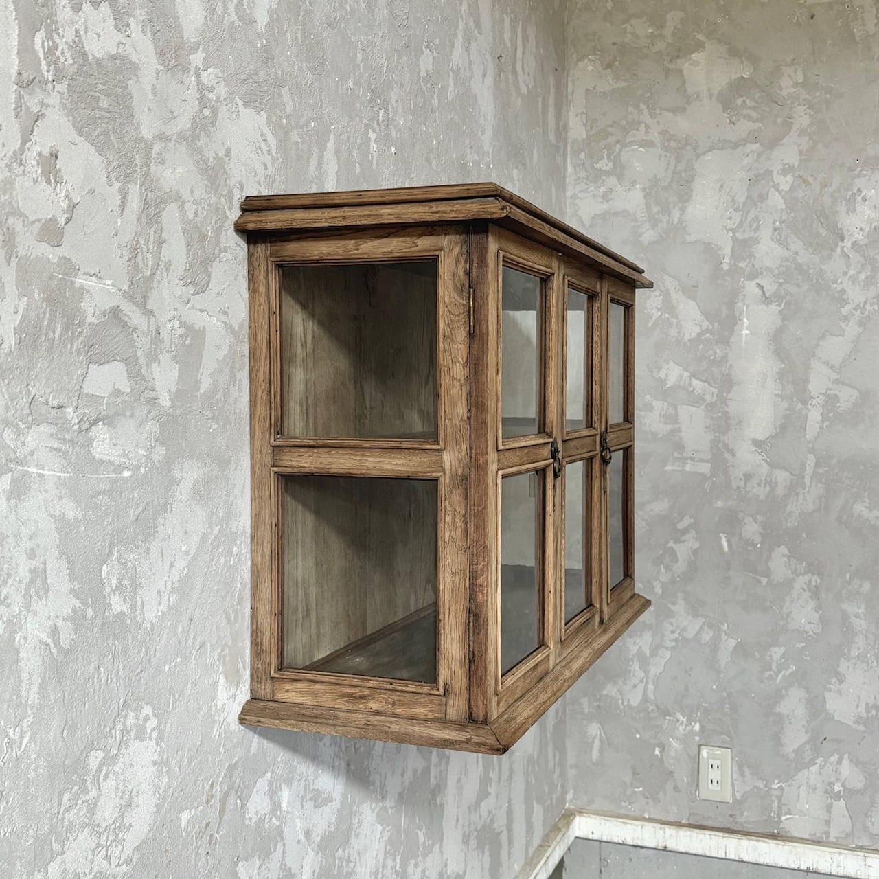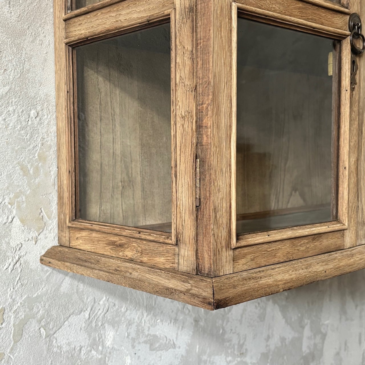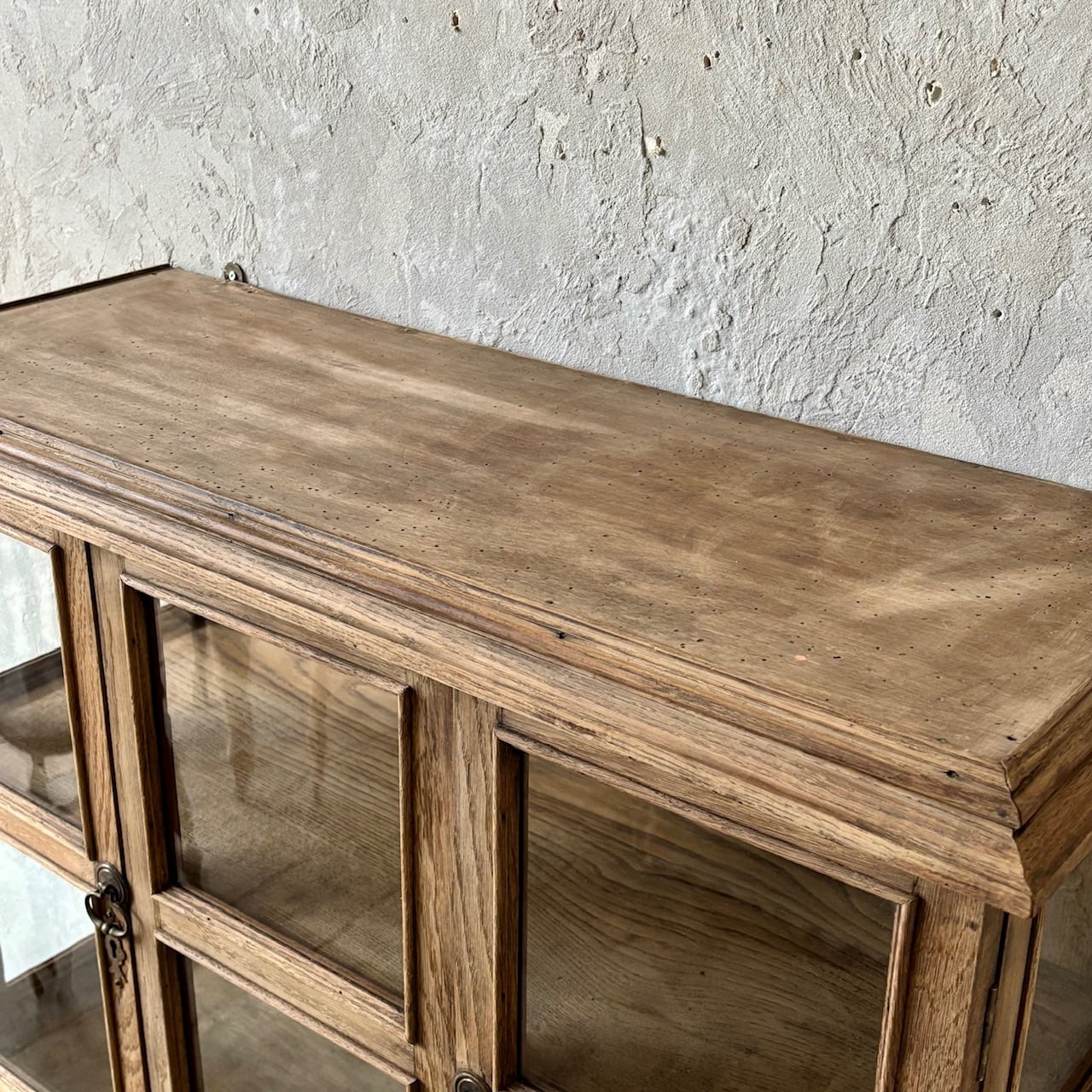 大きすぎない良いサイズ感のオーク材の3面ガラスのショーケース。1マスごとに区切られたデザインでフレームのような飾り方を楽しめます。全面にゆらゆらと揺れ映る古いガラスが残り良い雰囲気です。正面の両サイドのみ扉が開き、中は上下が棚板一枚で仕切られています。背面には壁付け用の金具が付いていますが、キャビネットやカウンターなどの上に置いても使えます。キッチン脇での食器棚としてやリビングでの飾り棚、ショップでのディスプレイ用としてなど様々な場所で使えそうです。扉には施錠可能な鍵が付いています。