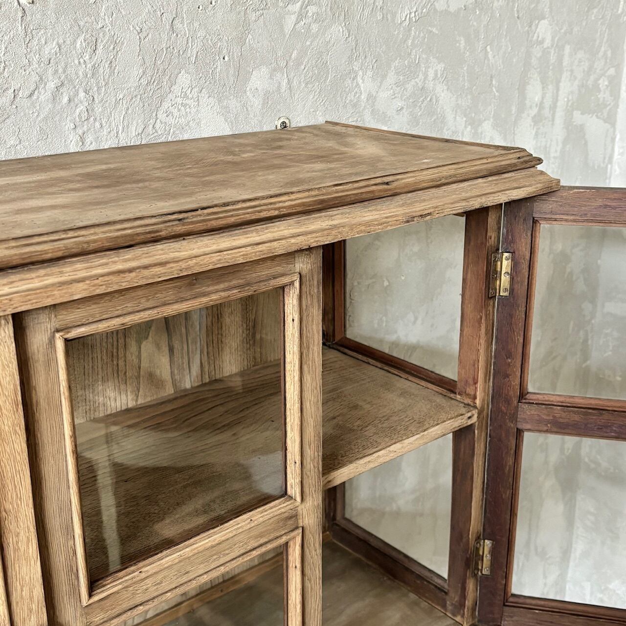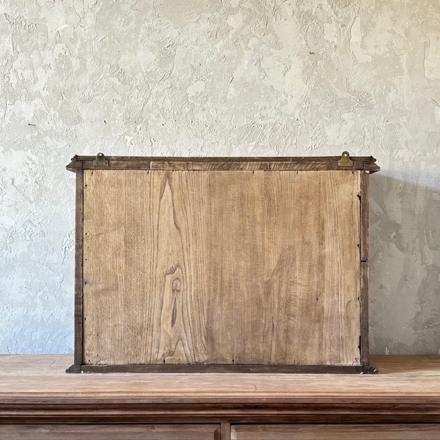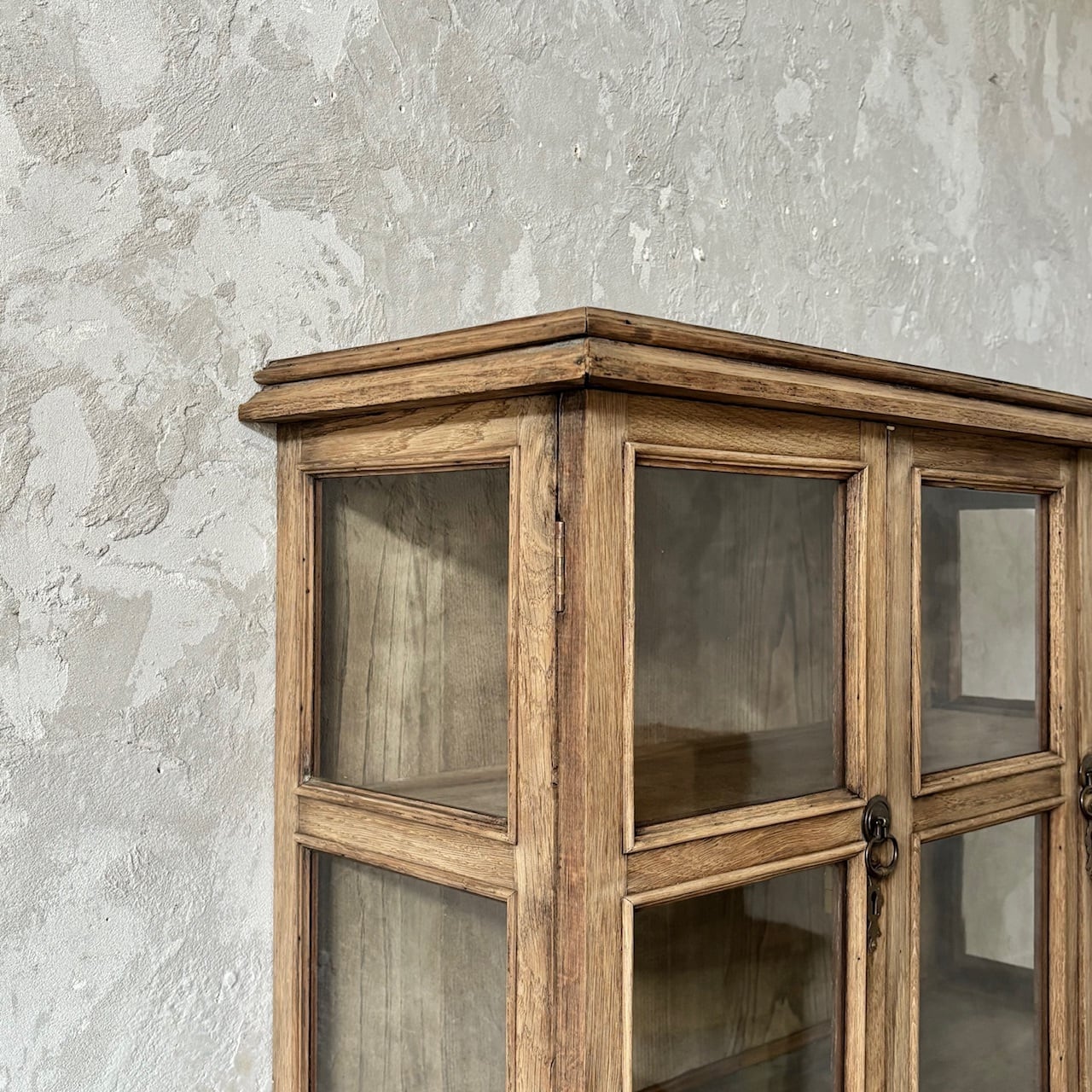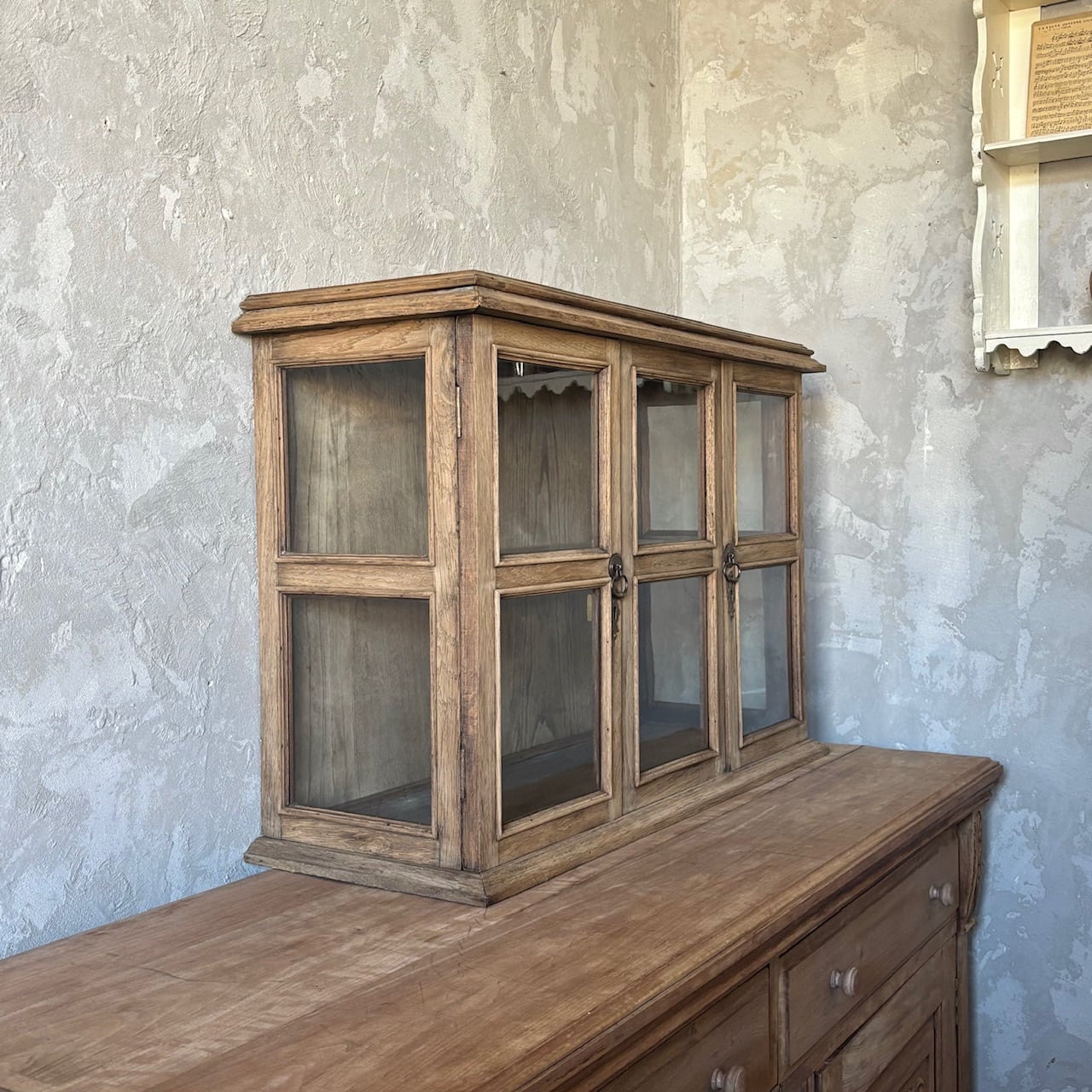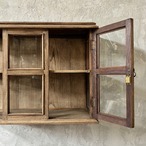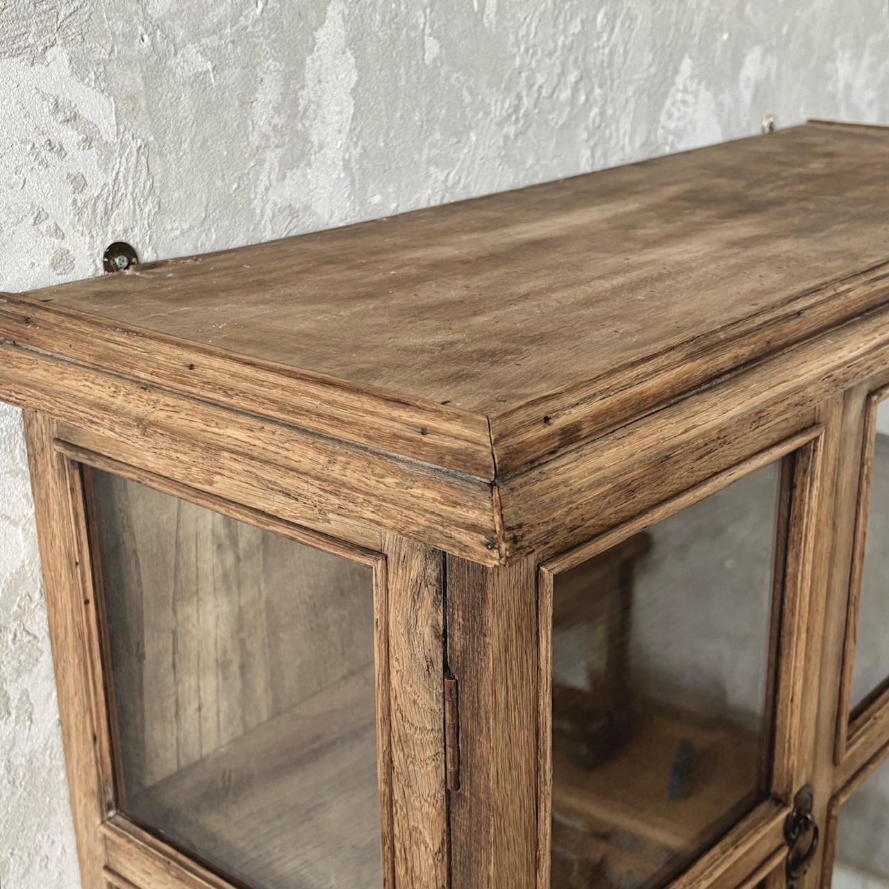 大きすぎない良いサイズ感のオーク材の3面ガラスのショーケース。1マスごとに区切られたデザインでフレームのような飾り方を楽しめます。全面にゆらゆらと揺れ映る古いガラスが残り良い雰囲気です。正面の両サイドのみ扉が開き、中は上下が棚板一枚で仕切られています。背面には壁付け用の金具が付いていますが、キャビネットやカウンターなどの上に置いても使えます。キッチン脇での食器棚としてやリビングでの飾り棚、ショップでのディスプレイ用としてなど様々な場所で使えそうです。扉には施錠可能な鍵が付いています。