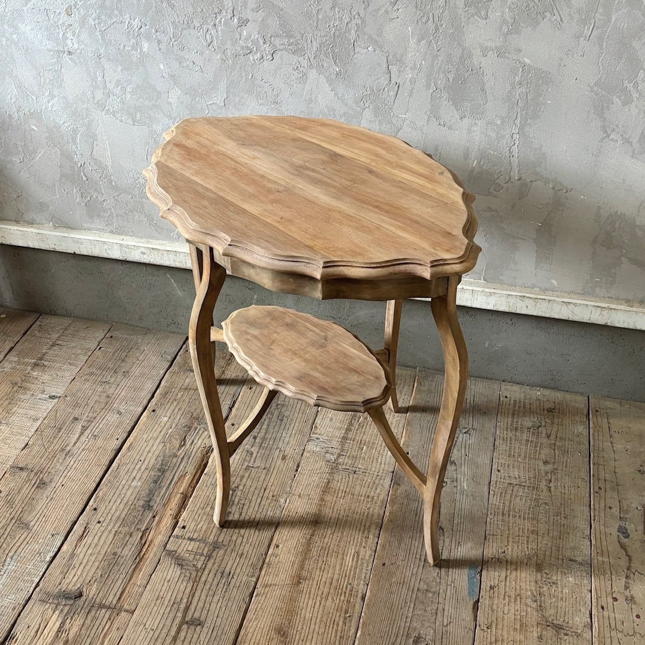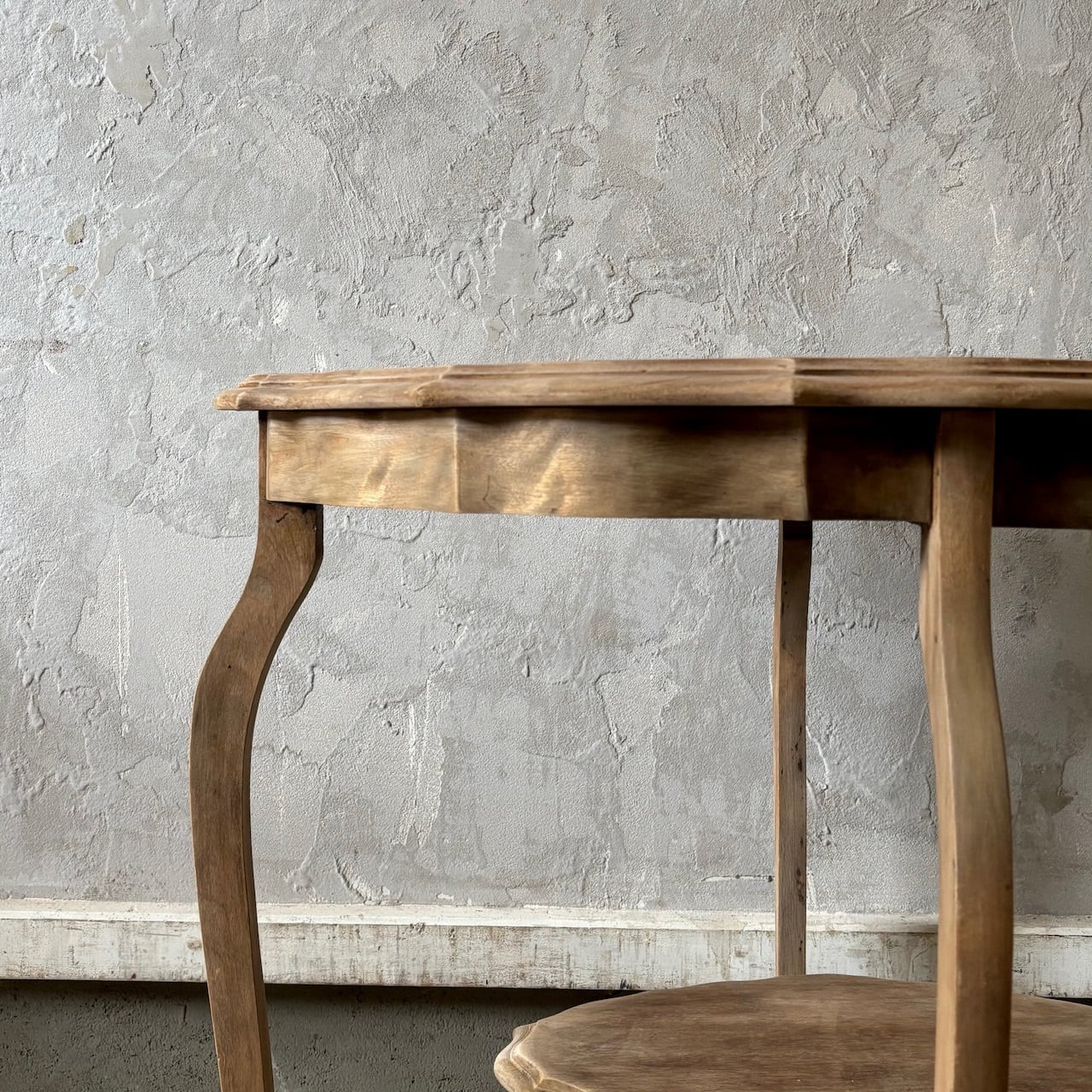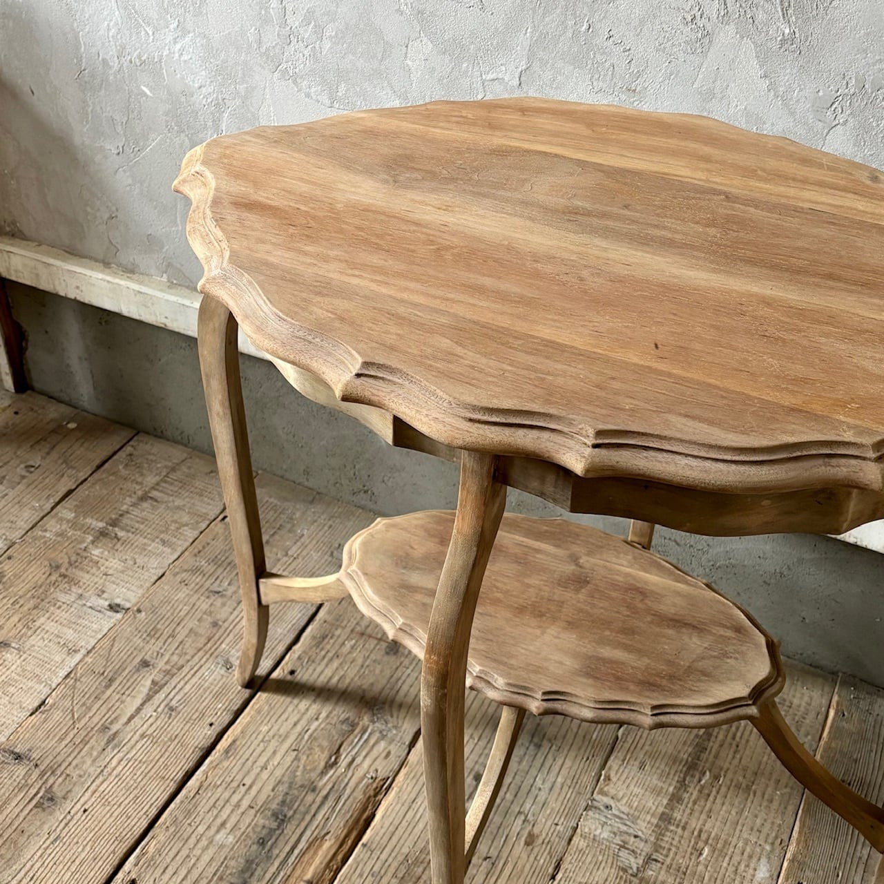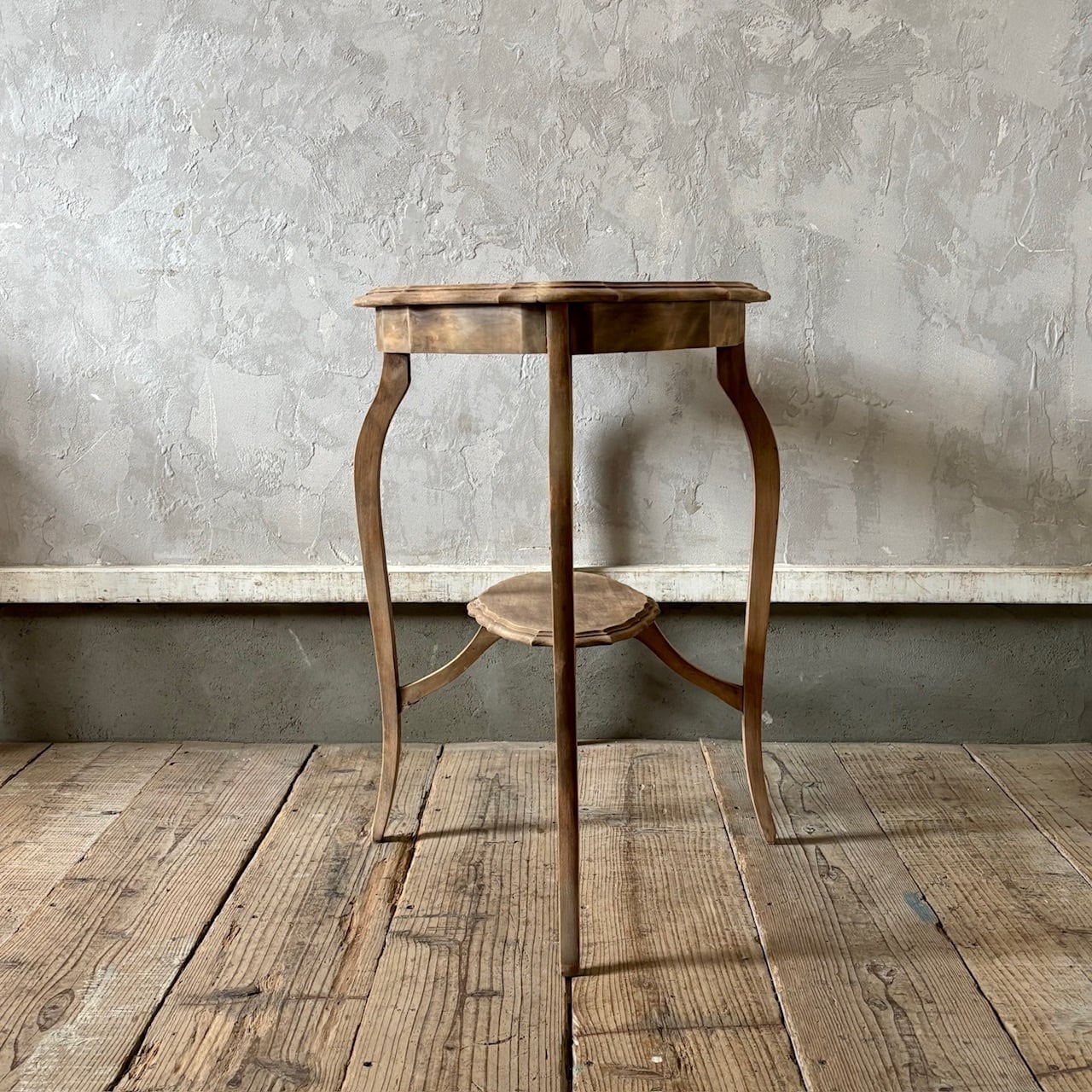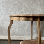 珍しい形の天板のサイドテーブル。天板の縁や幕板などに施された装飾と緩やかな曲線を描く脚が華やかで良い雰囲気です。椅子と合わせてお部屋の片隅でのテーブルとしてや花台やディスプレイ台としてなど様々な用途で使えそうです。