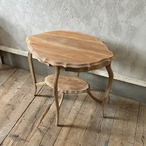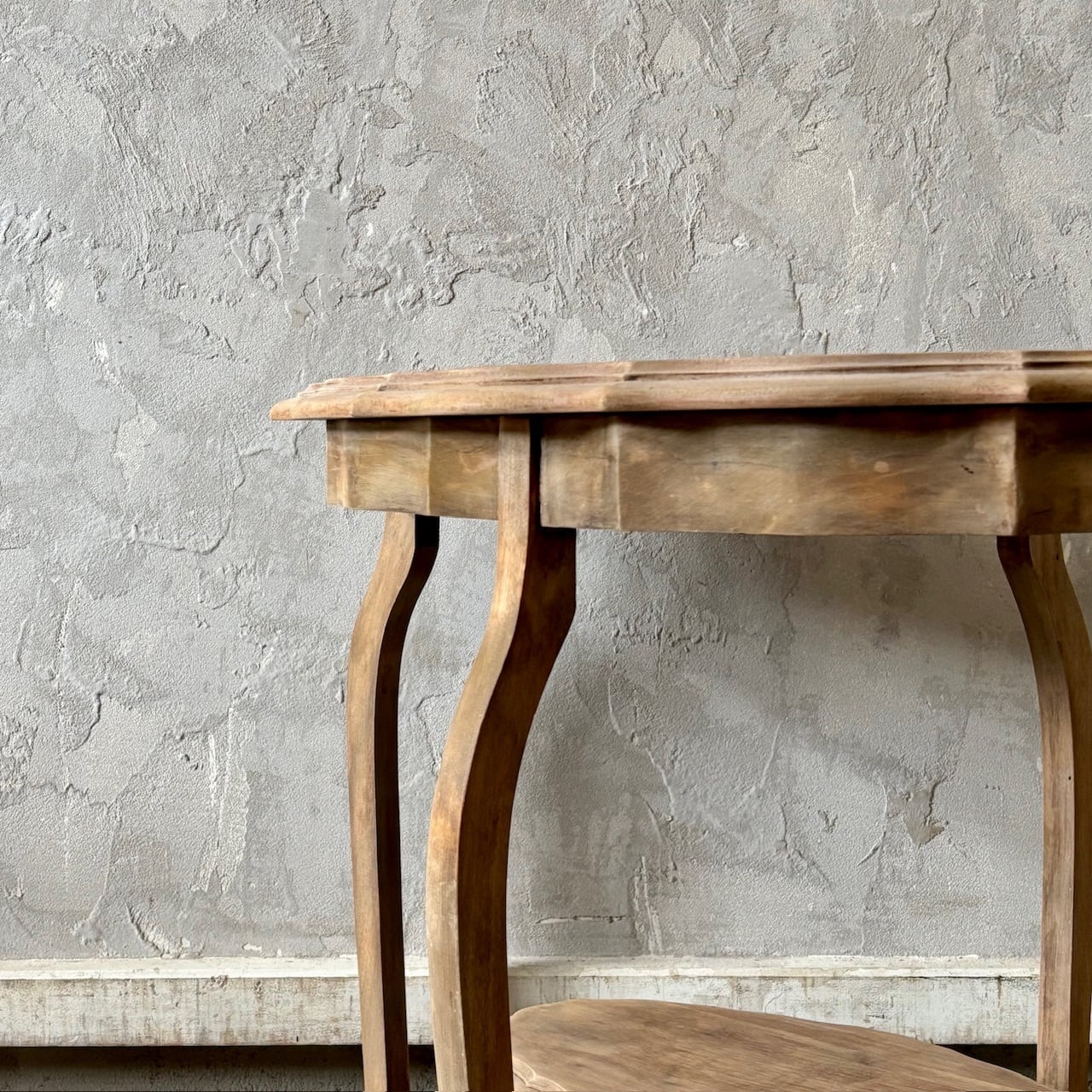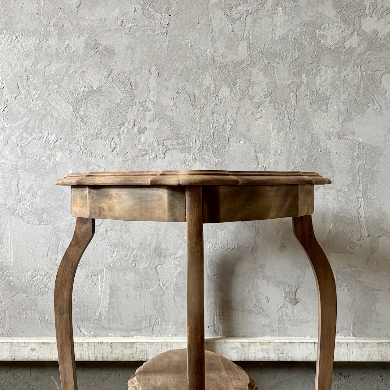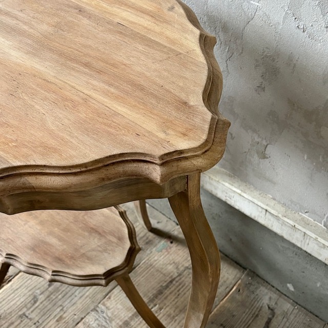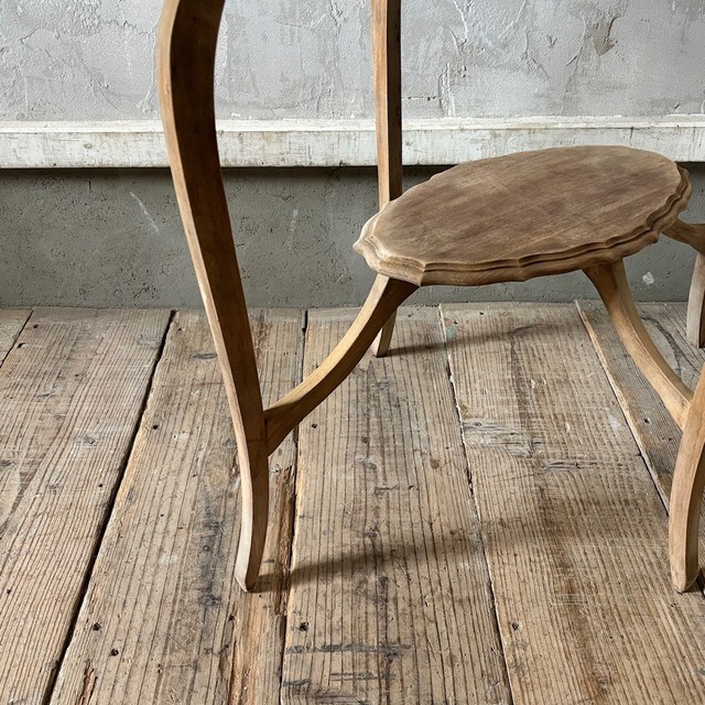 珍しい形の天板のサイドテーブル。天板の縁や幕板などに施された装飾と緩やかな曲線を描く脚が華やかで良い雰囲気です。椅子と合わせてお部屋の片隅でのテーブルとしてや花台やディスプレイ台としてなど様々な用途で使えそうです。