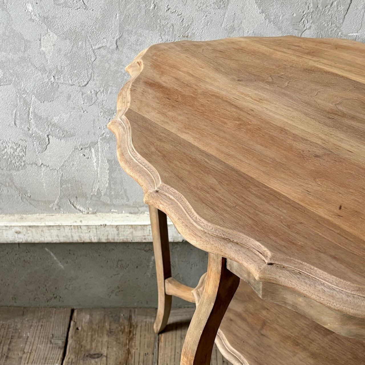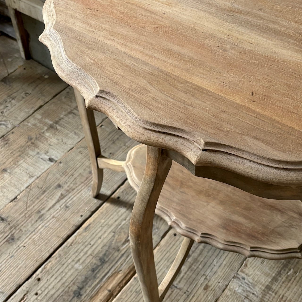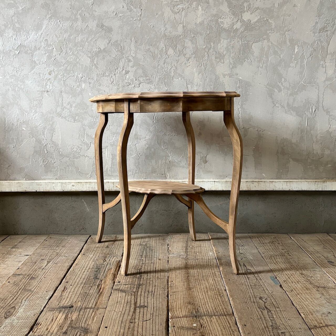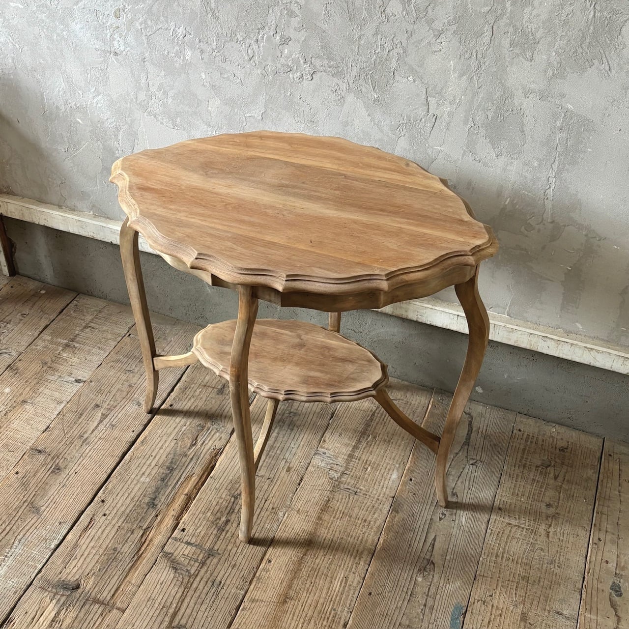 珍しい形の天板のサイドテーブル。天板の縁や幕板などに施された装飾と緩やかな曲線を描く脚が華やかで良い雰囲気です。椅子と合わせてお部屋の片隅でのテーブルとしてや花台やディスプレイ台としてなど様々な用途で使えそうです。