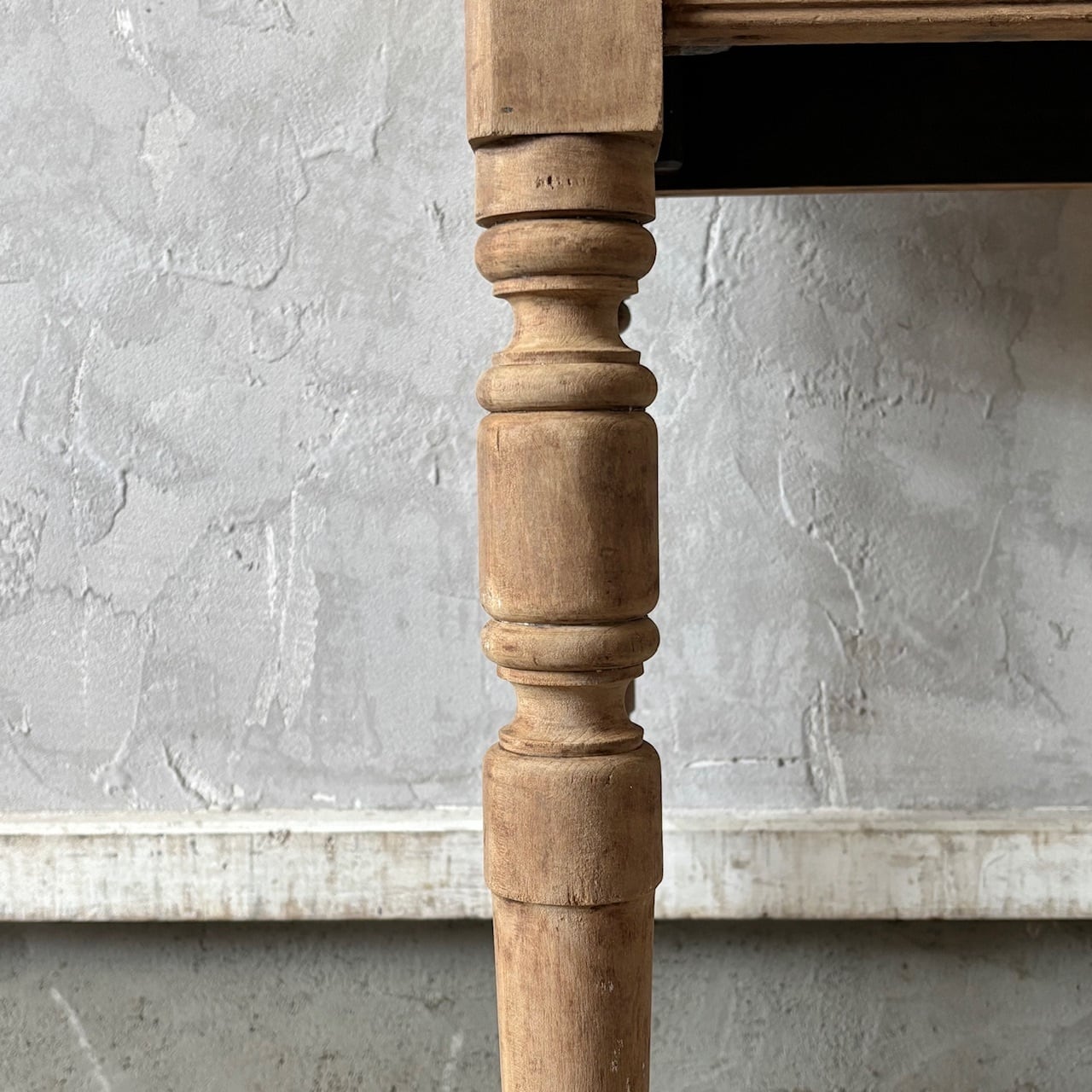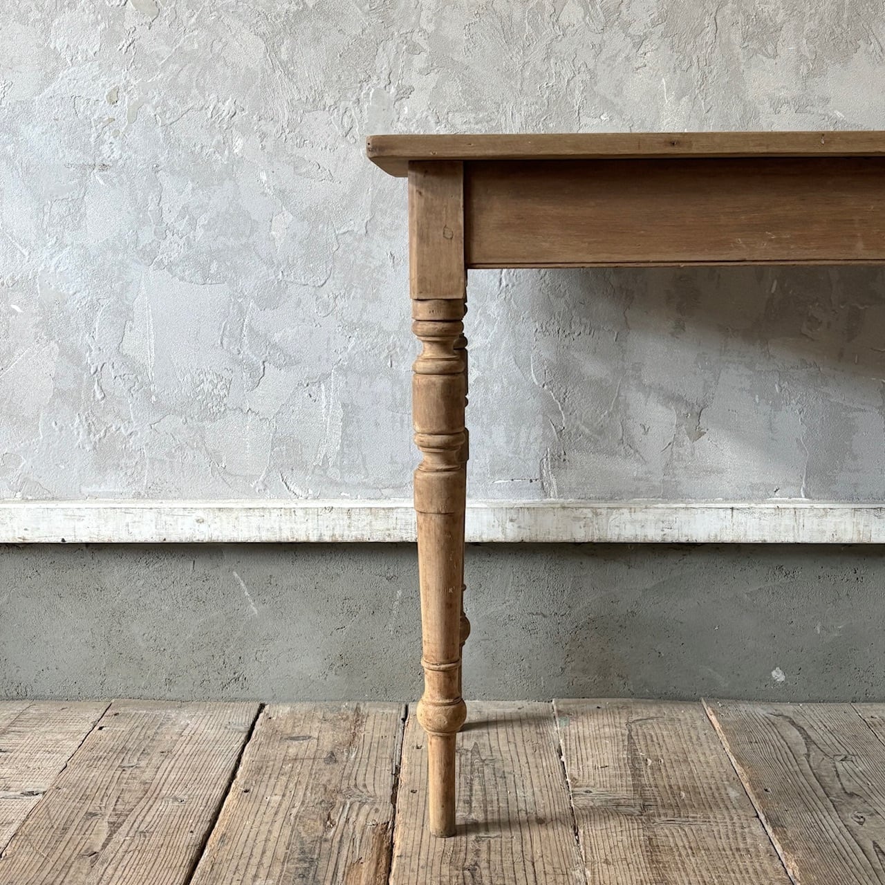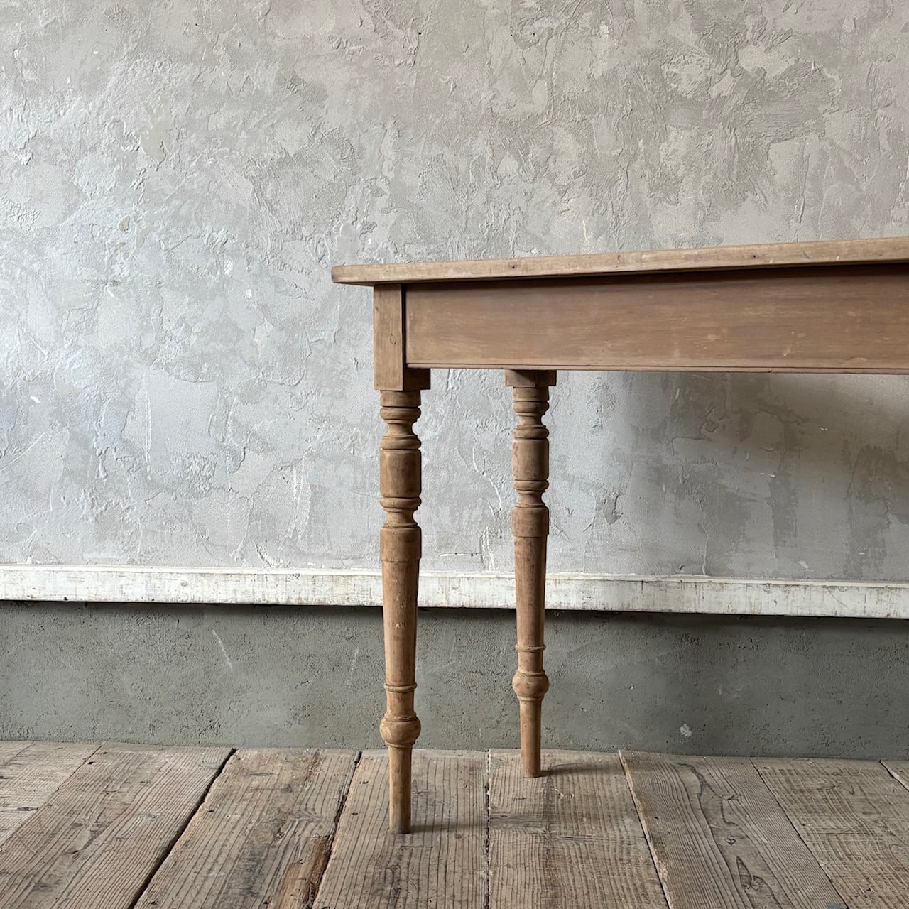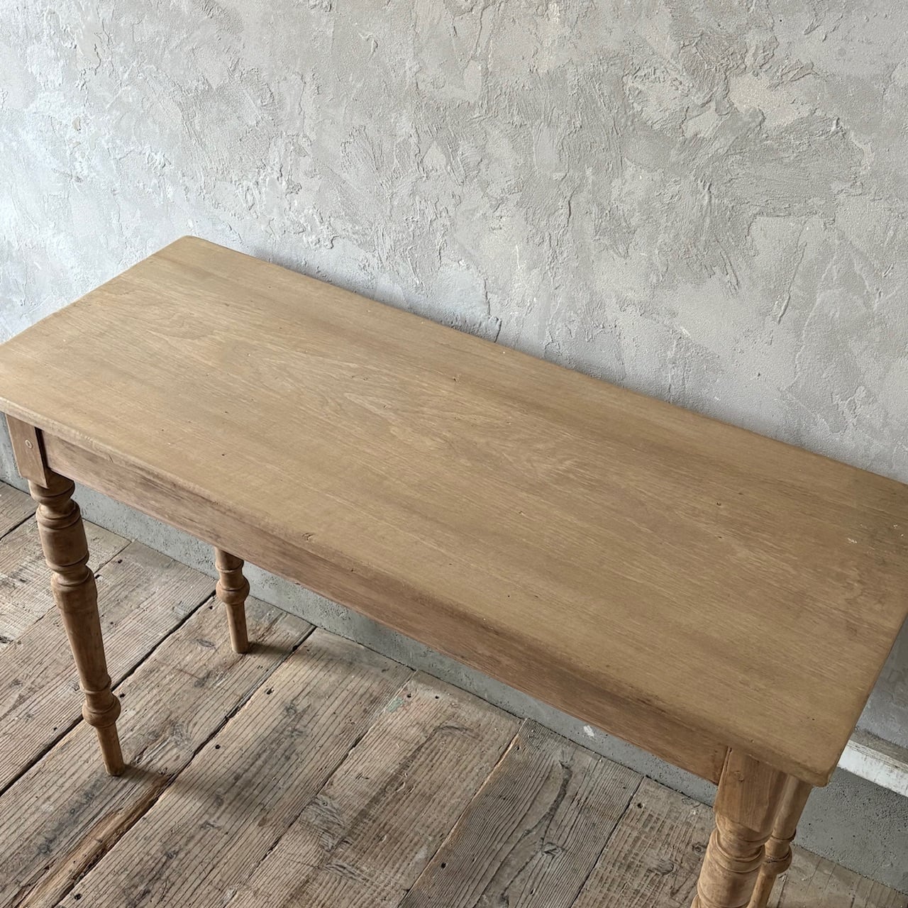 シンプルなデザインの奥行が浅めのテーブル。一枚板の天板と脚の装飾、木の温もりが感じられる質感と表情が良い雰囲気です。テーブルとしてはもちろん壁際に置いてデスクとしてやディスプレイテーブルのように使うのも良さそうです。高さ調整の脚のカットは可能です。