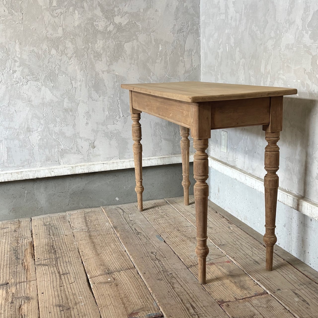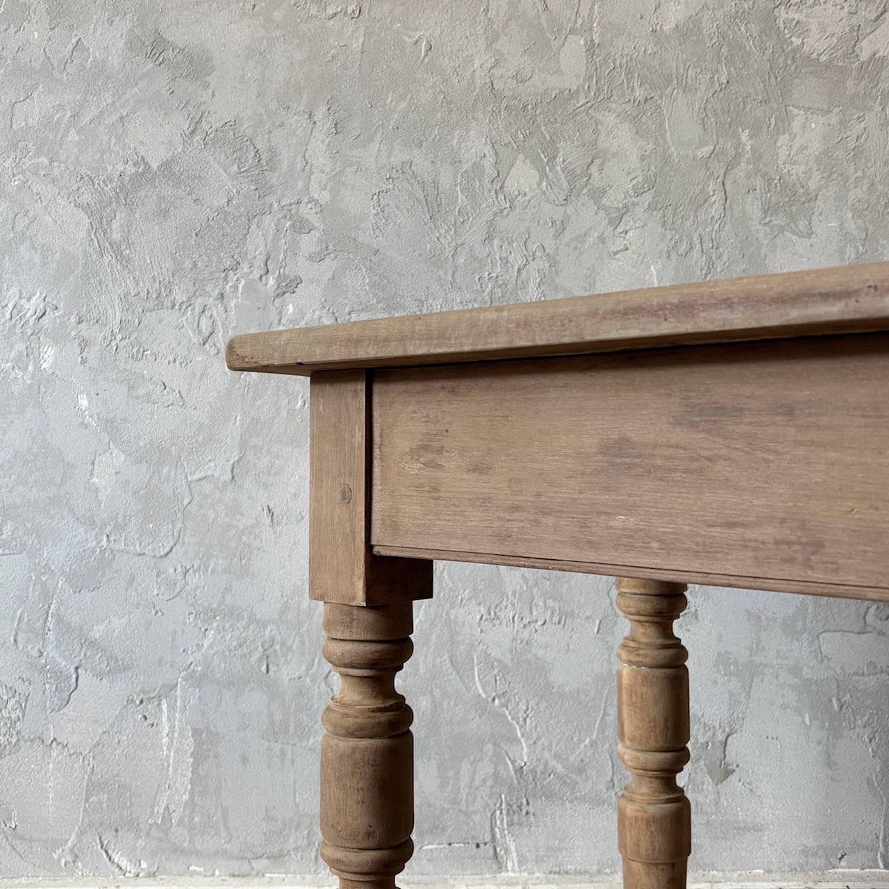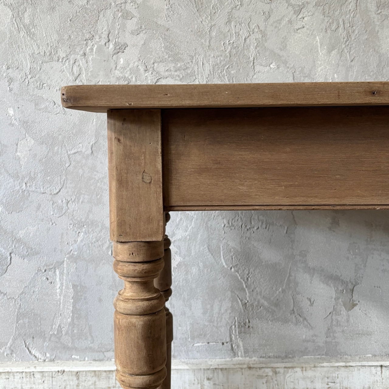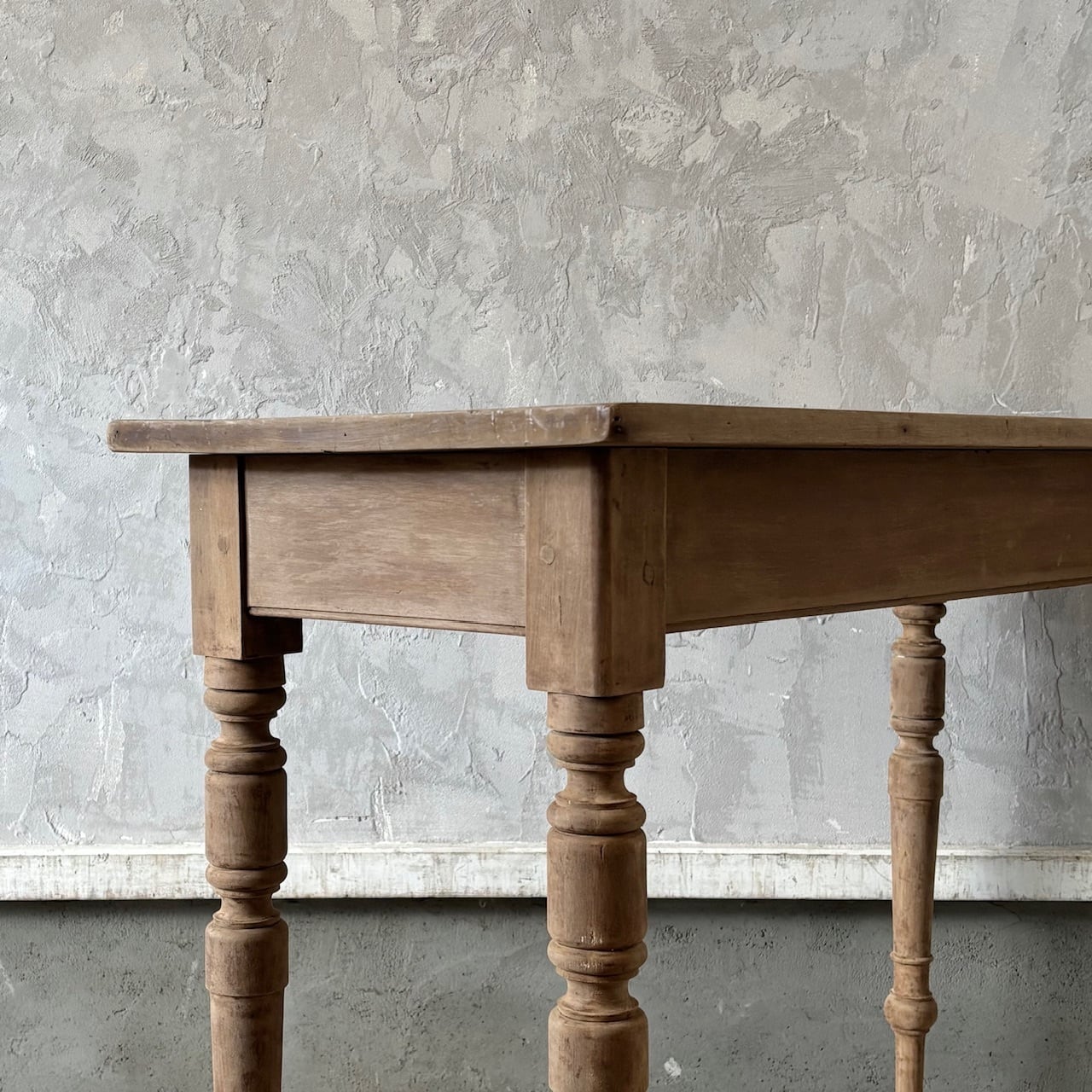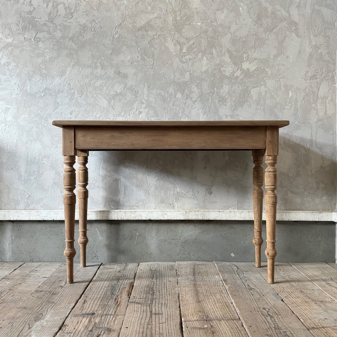 シンプルなデザインの奥行が浅めのテーブル。一枚板の天板と脚の装飾、木の温もりが感じられる質感と表情が良い雰囲気です。テーブルとしてはもちろん壁際に置いてデスクとしてやディスプレイテーブルのように使うのも良さそうです。高さ調整の脚のカットは可能です。