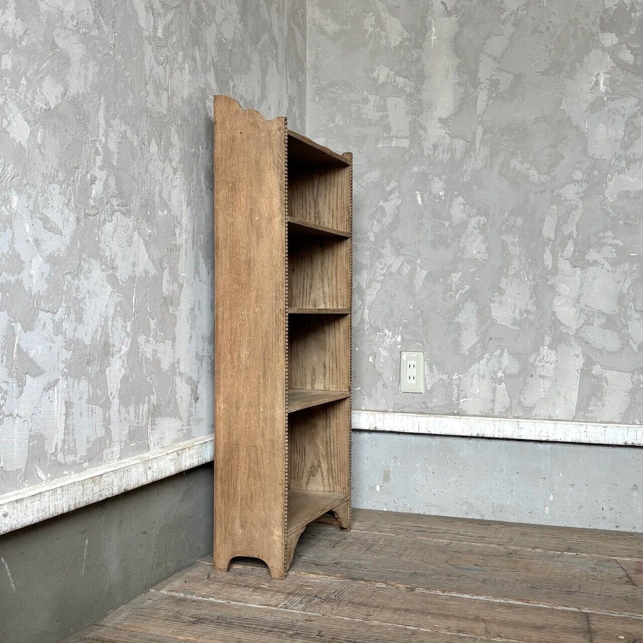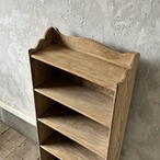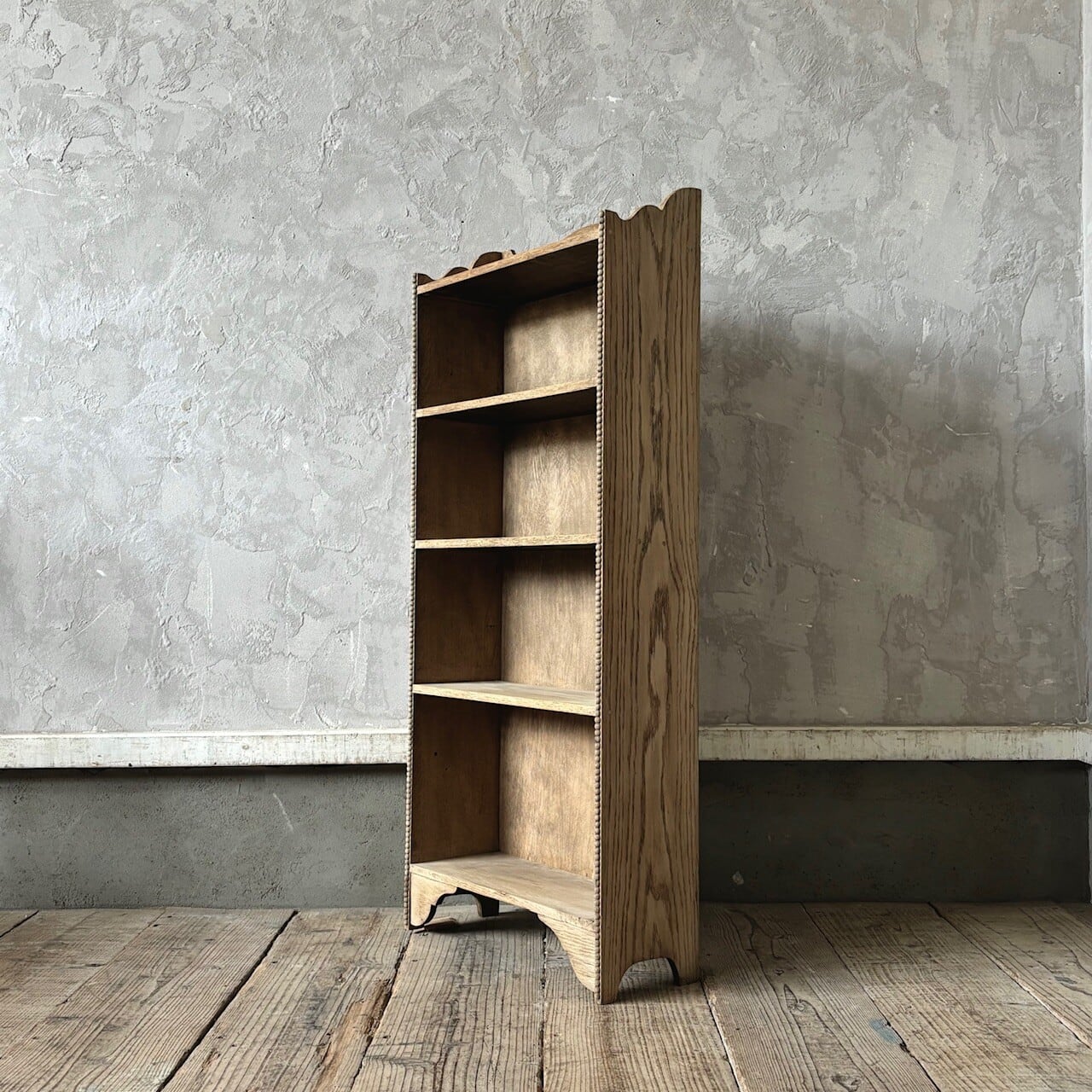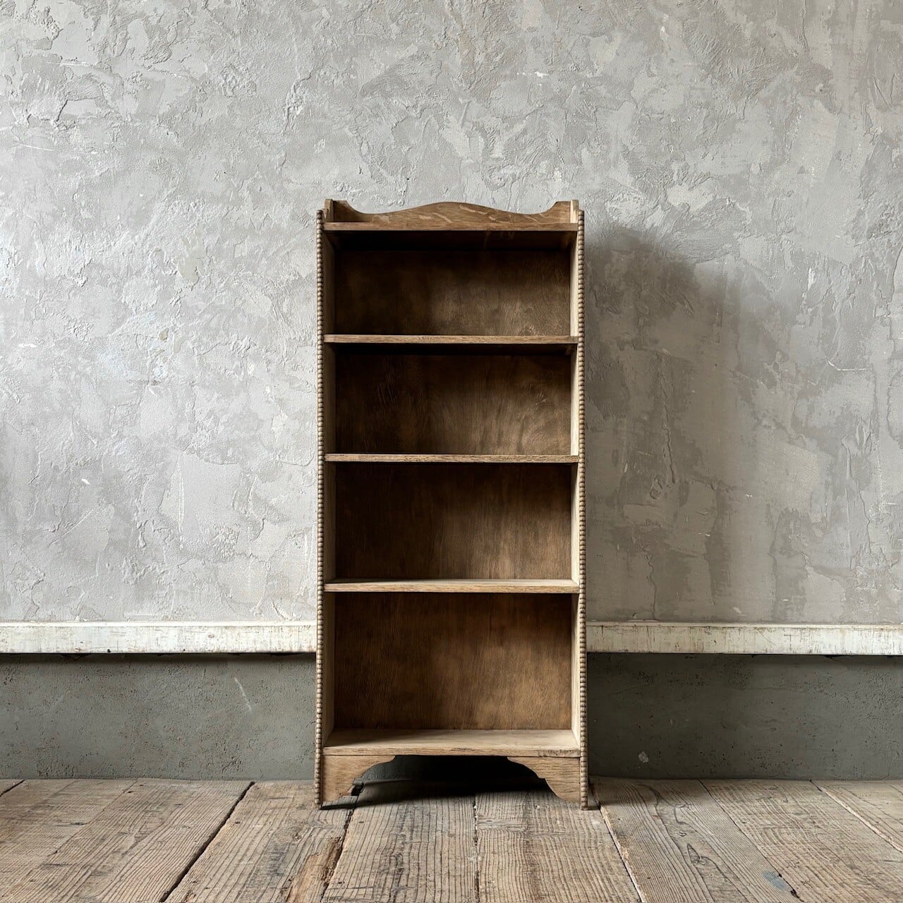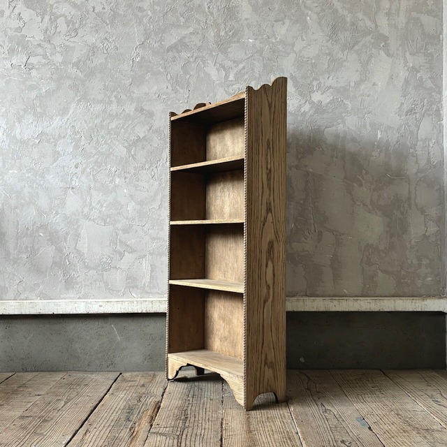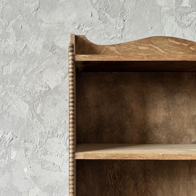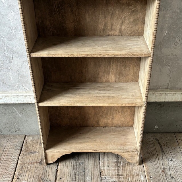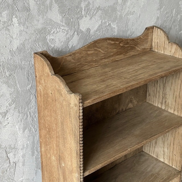 場所をとらないサイズ感のシェルフ。木の温もりが感じられる質感と色合いや所々に施された装飾が良い雰囲気です。お部屋での本棚や飾り棚として、ショップのディスプレイ棚にも良さそうです。