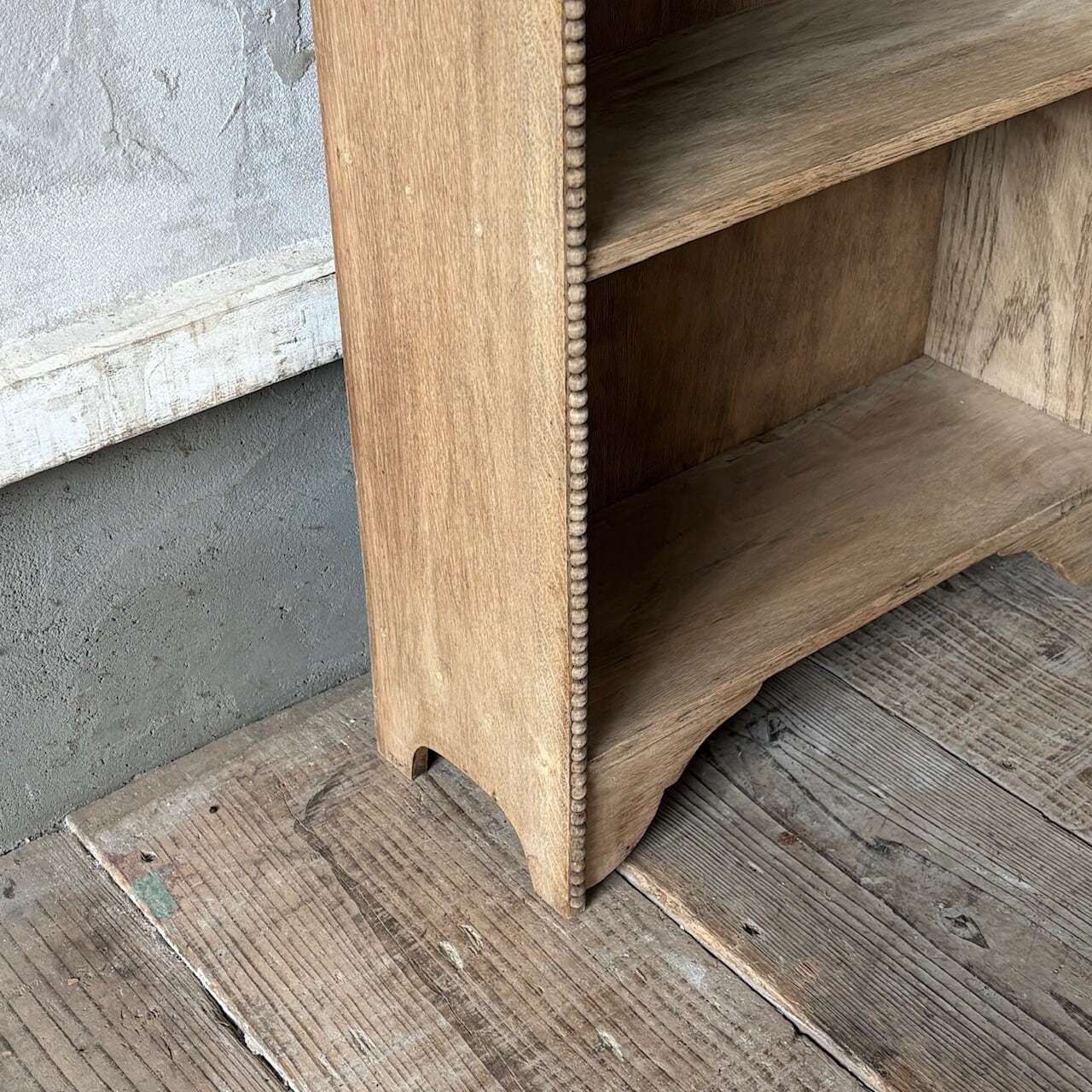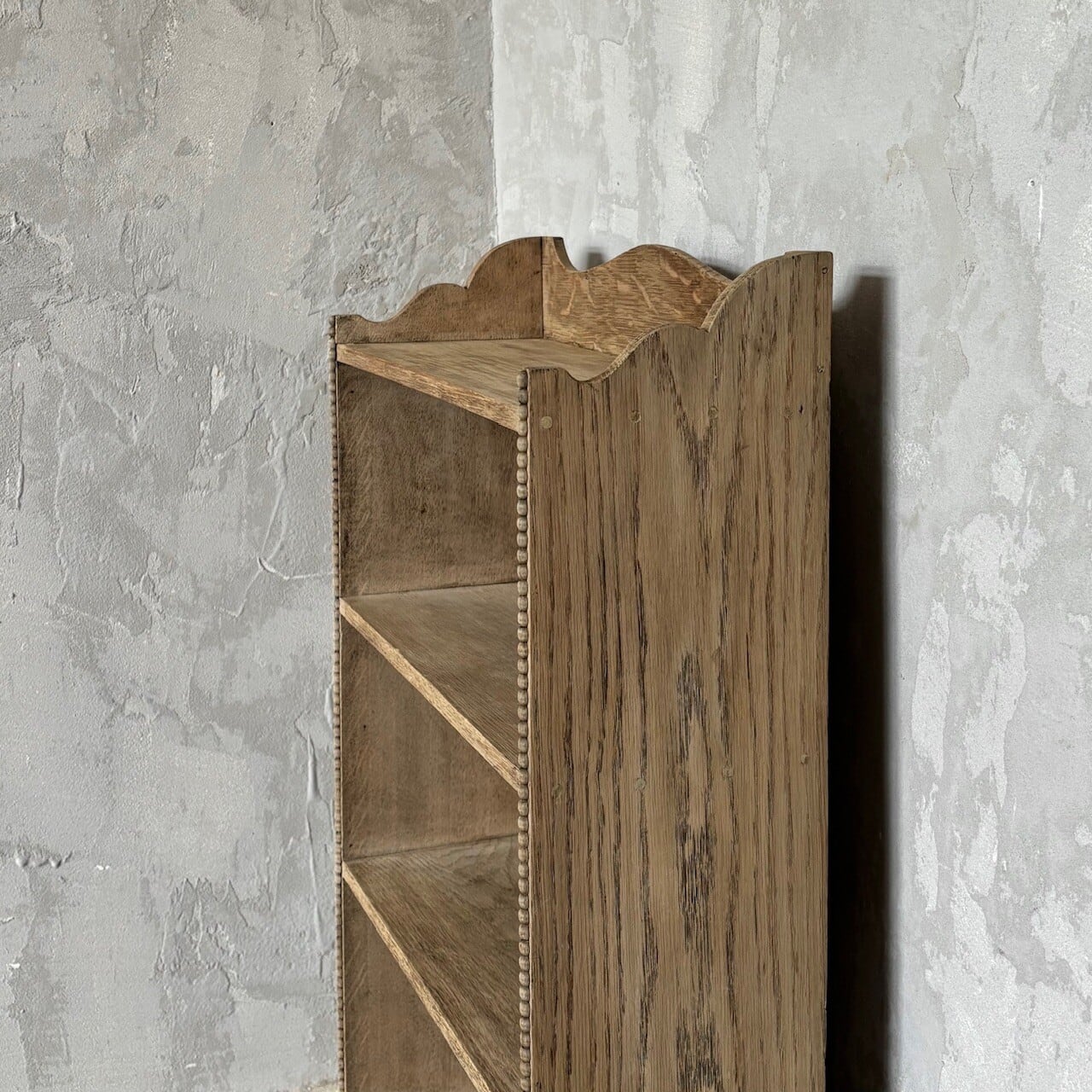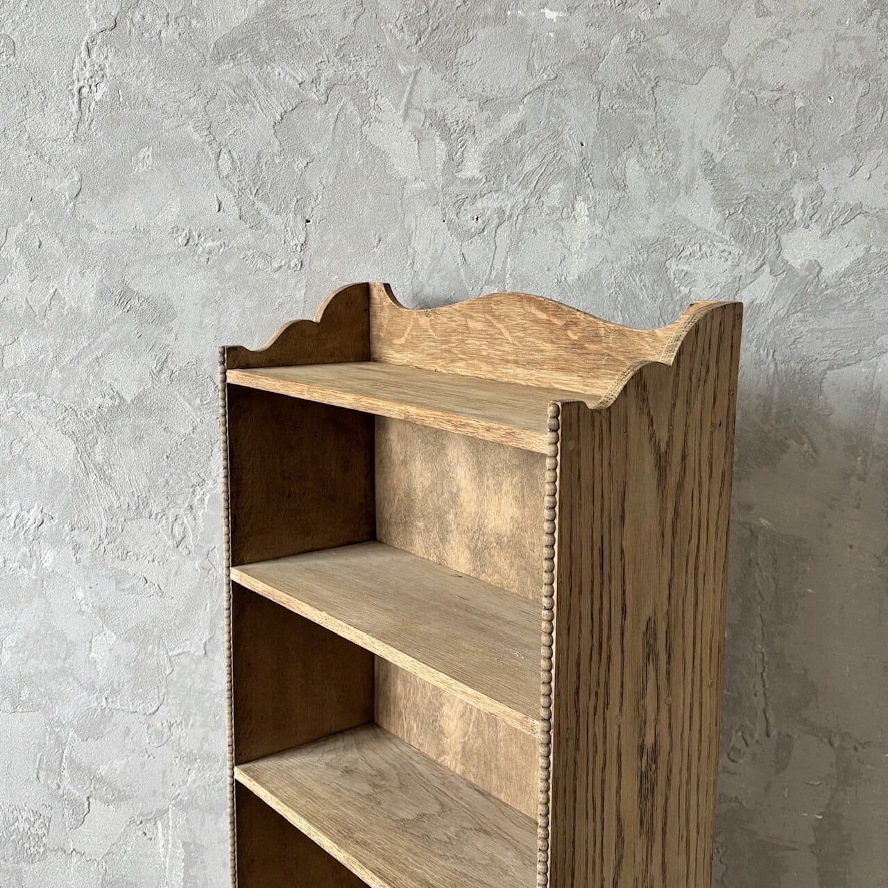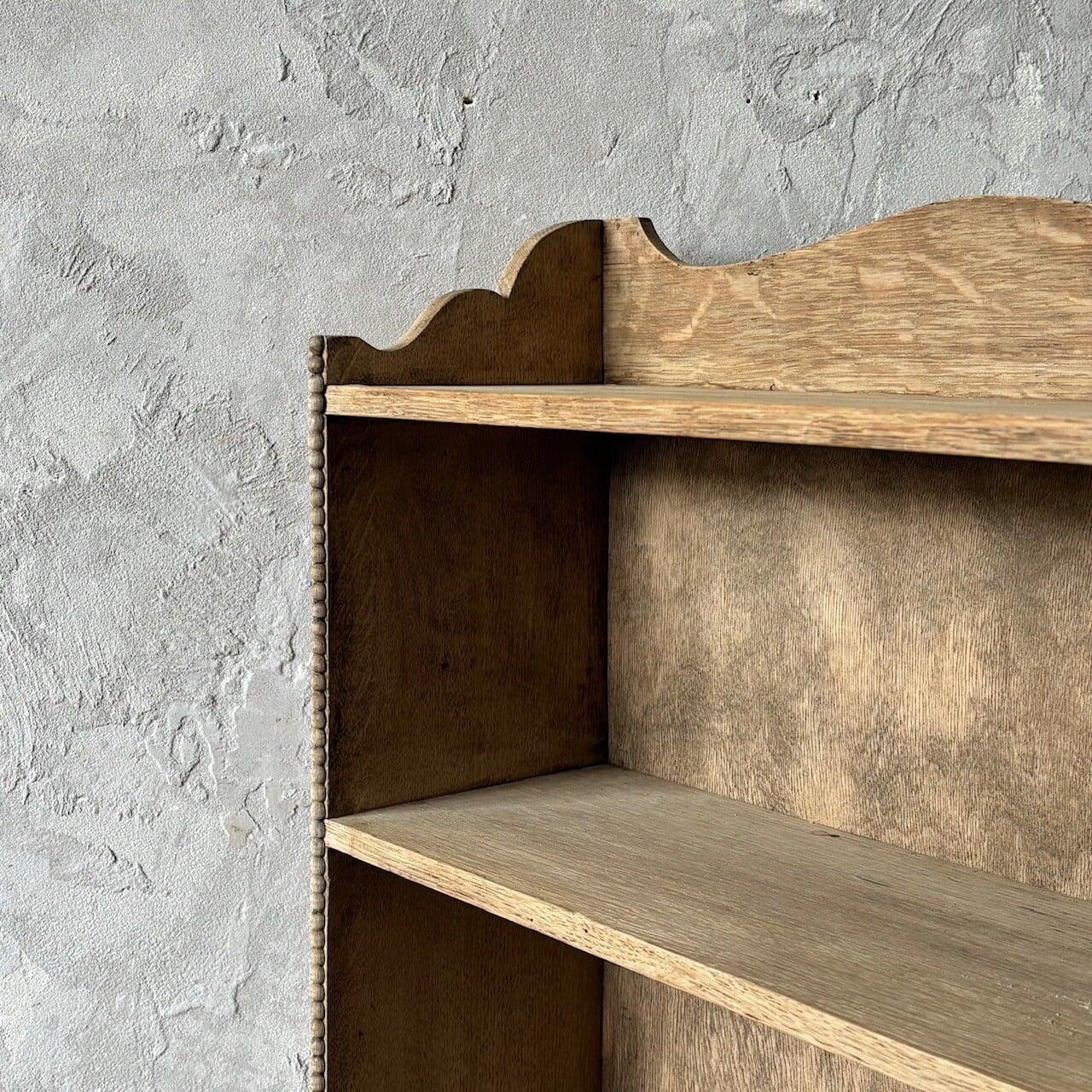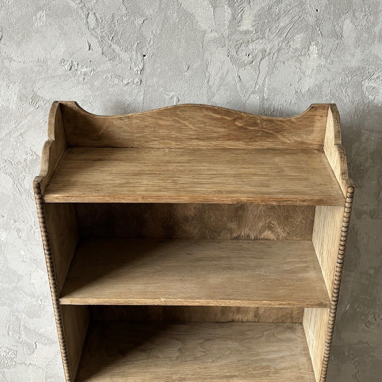 場所をとらないサイズ感のシェルフ。木の温もりが感じられる質感と色合いや所々に施された装飾が良い雰囲気です。お部屋での本棚や飾り棚として、ショップのディスプレイ棚にも良さそうです。
