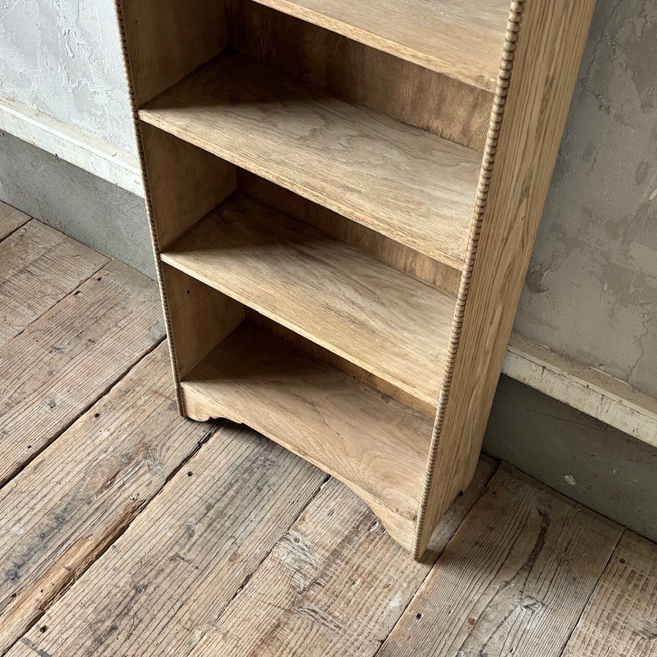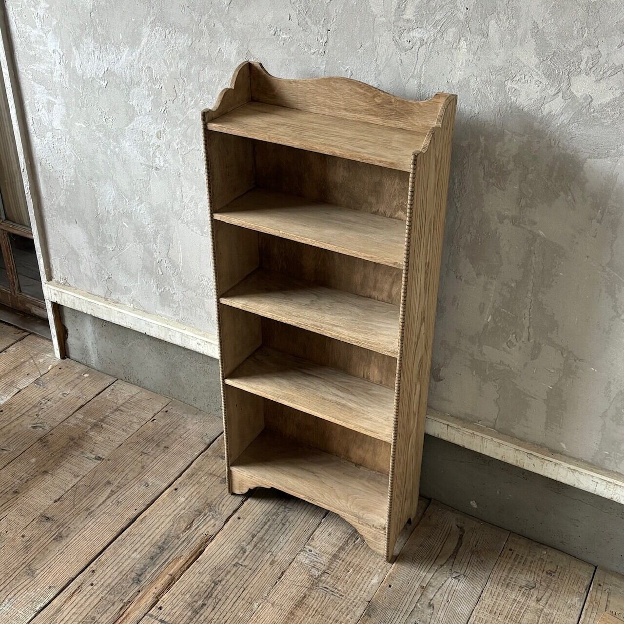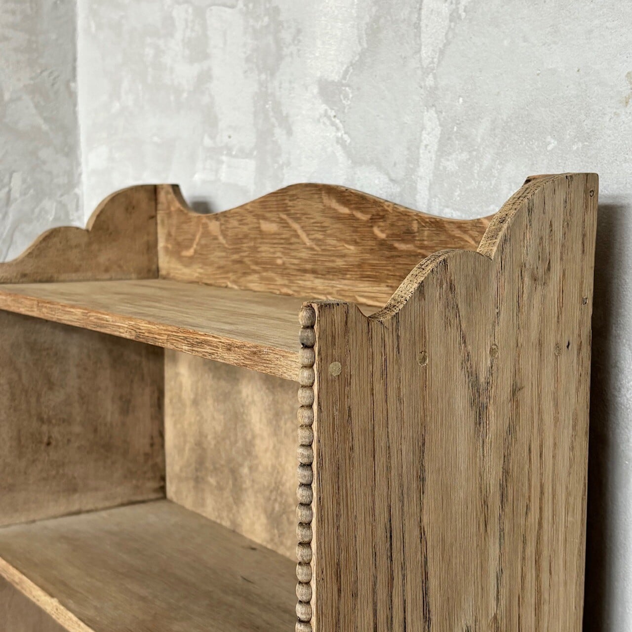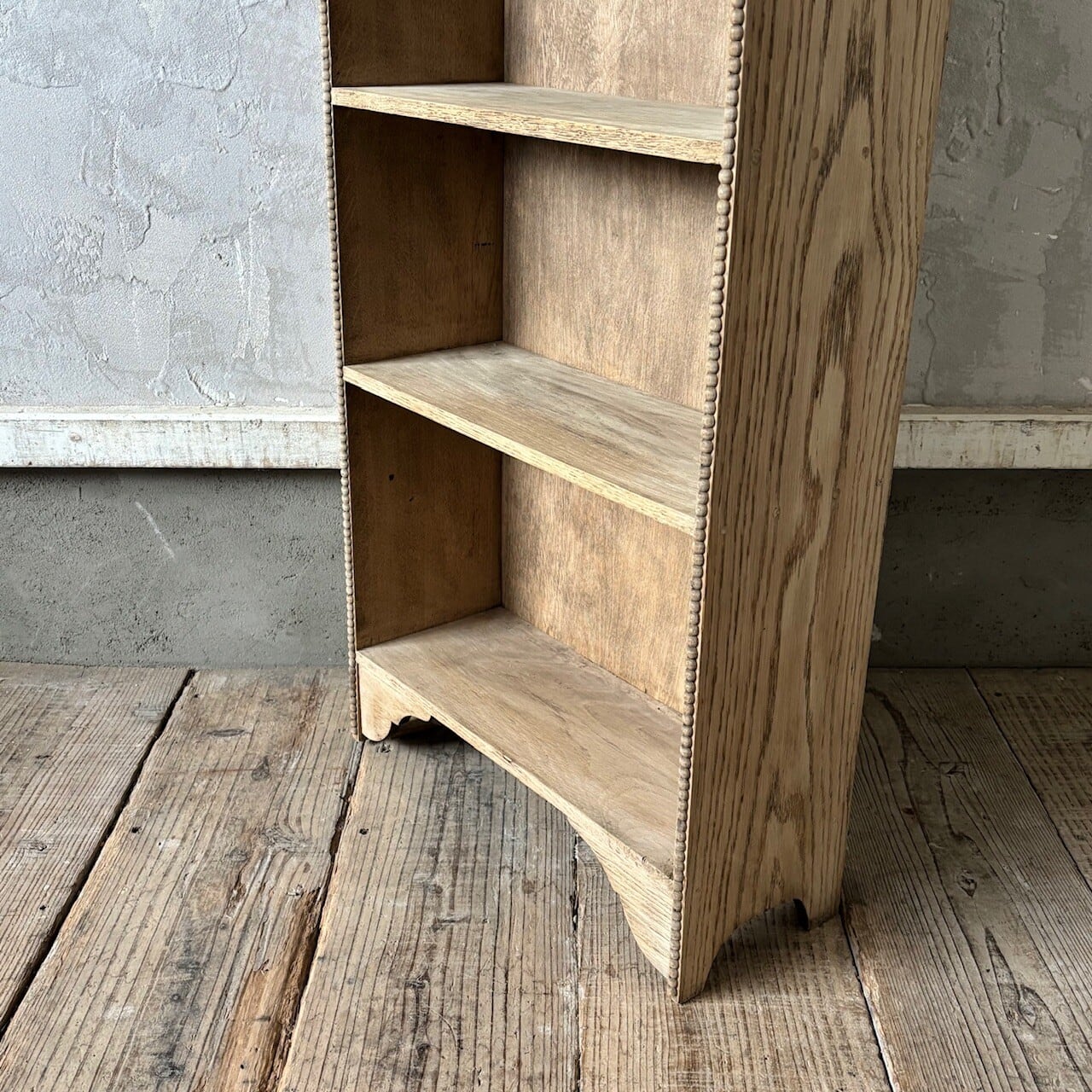 場所をとらないサイズ感のシェルフ。木の温もりが感じられる質感と色合いや所々に施された装飾が良い雰囲気です。お部屋での本棚や飾り棚として、ショップのディスプレイ棚にも良さそうです。