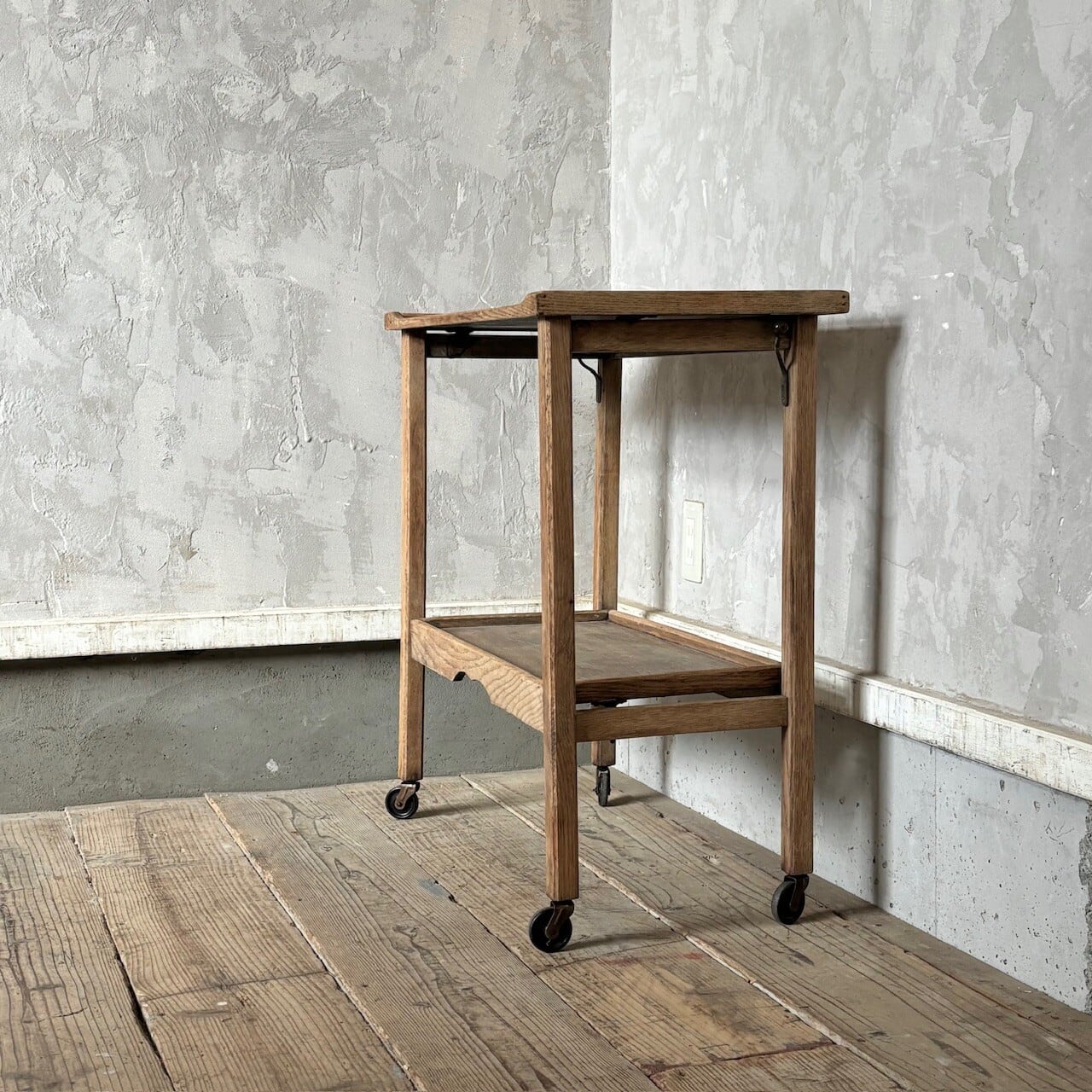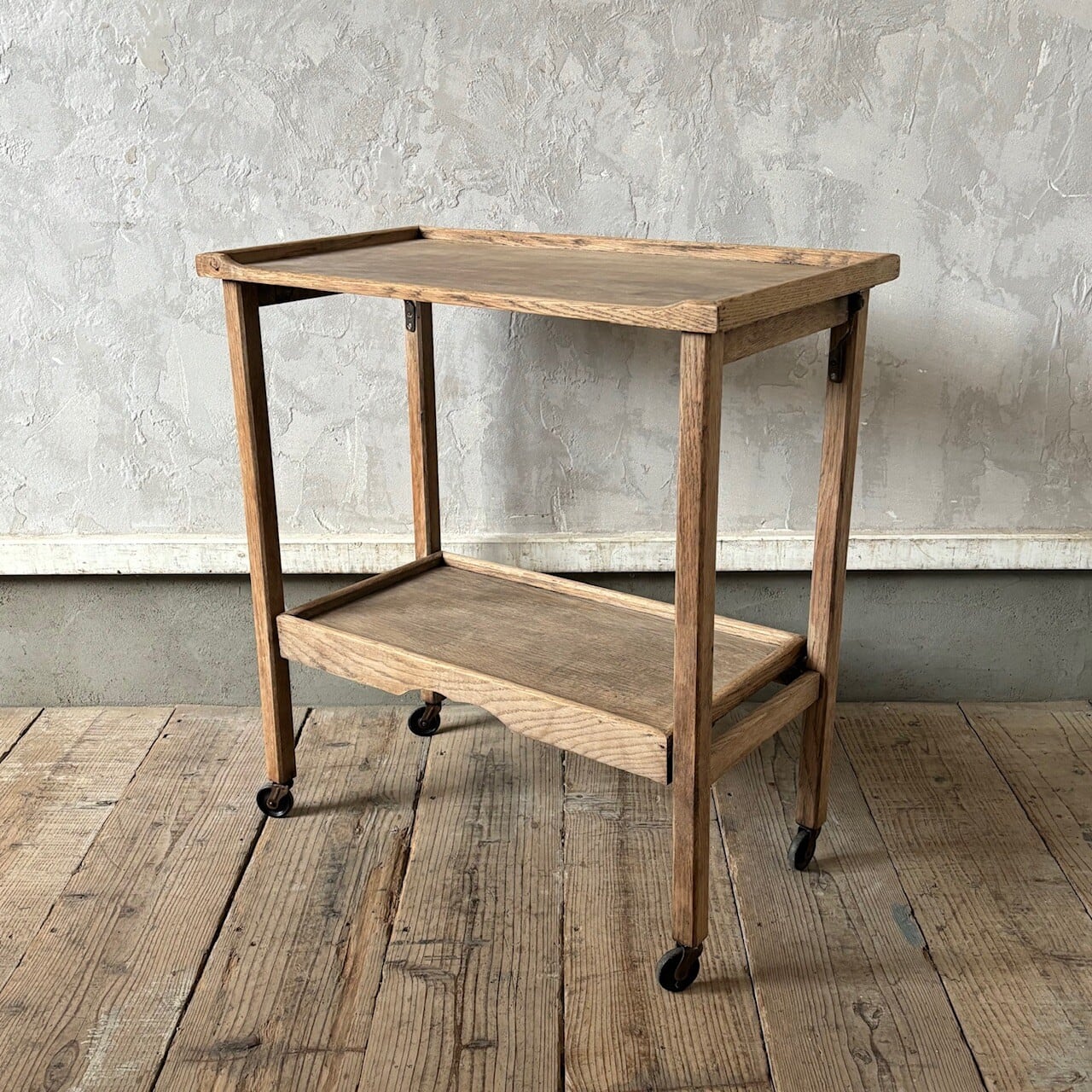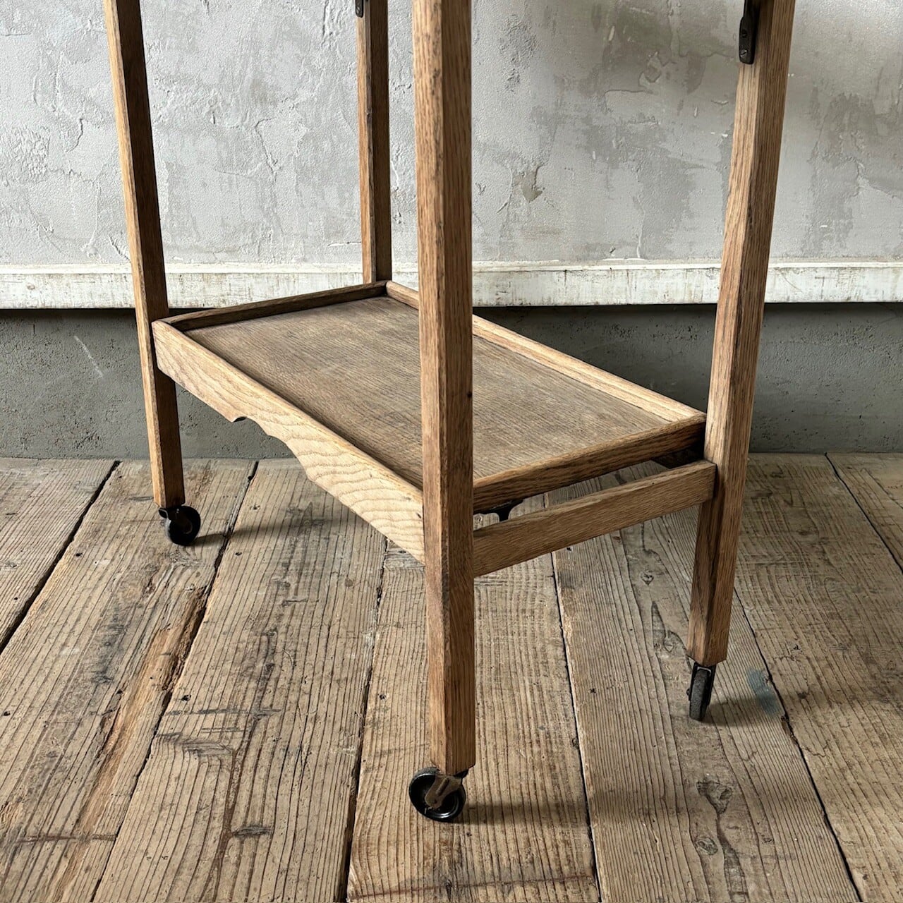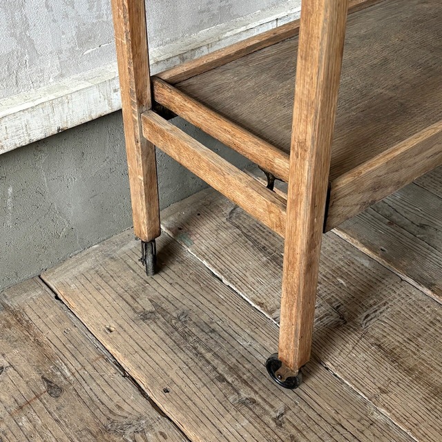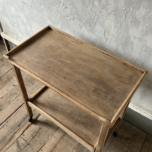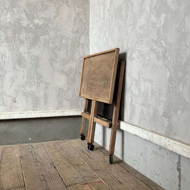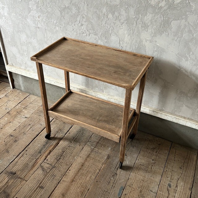 ティーセットやデザートなどを運ぶ際に使われていたトロリー。キャスターはスムーズに動くので実用的で、キッチン脇で使ったりサイドテーブルとして使ったりと使い勝手が良いです。使わない際は折りたたみが可能です。