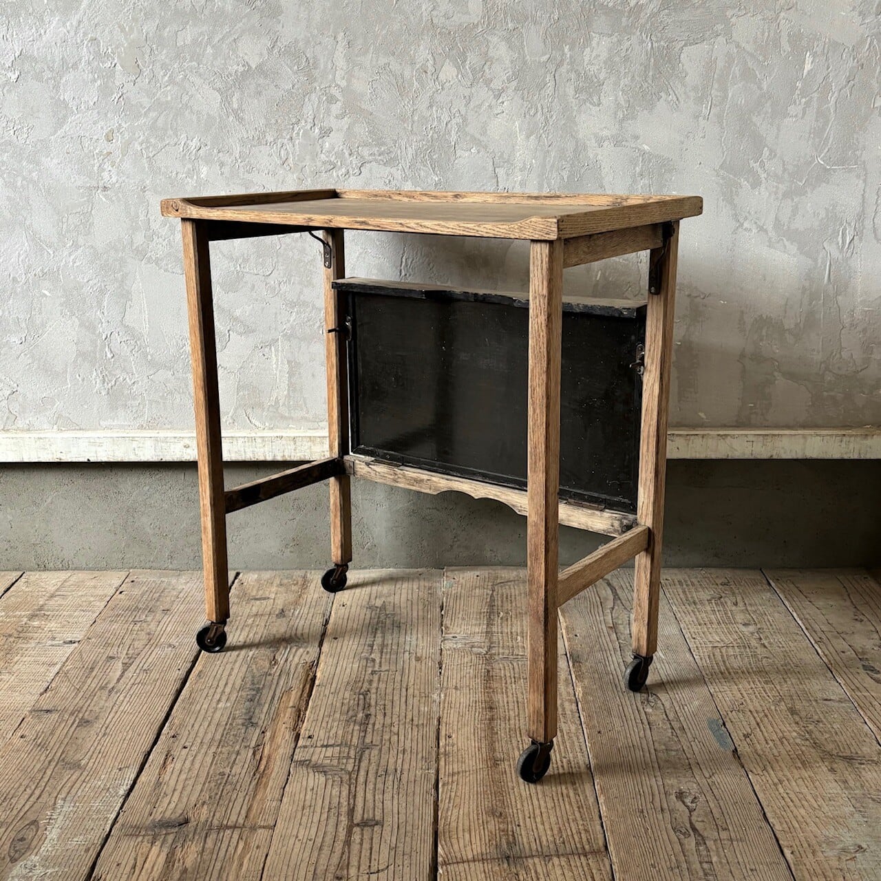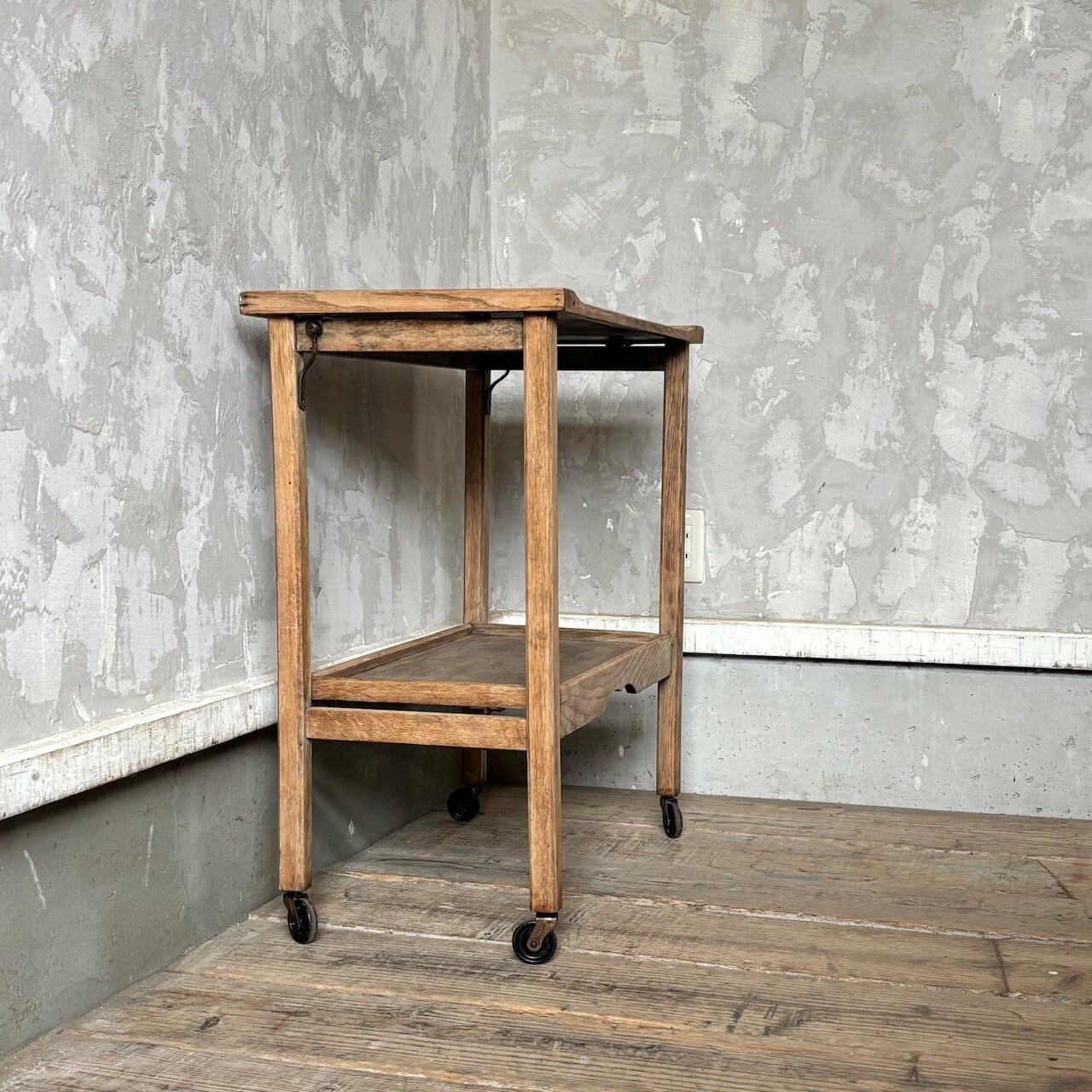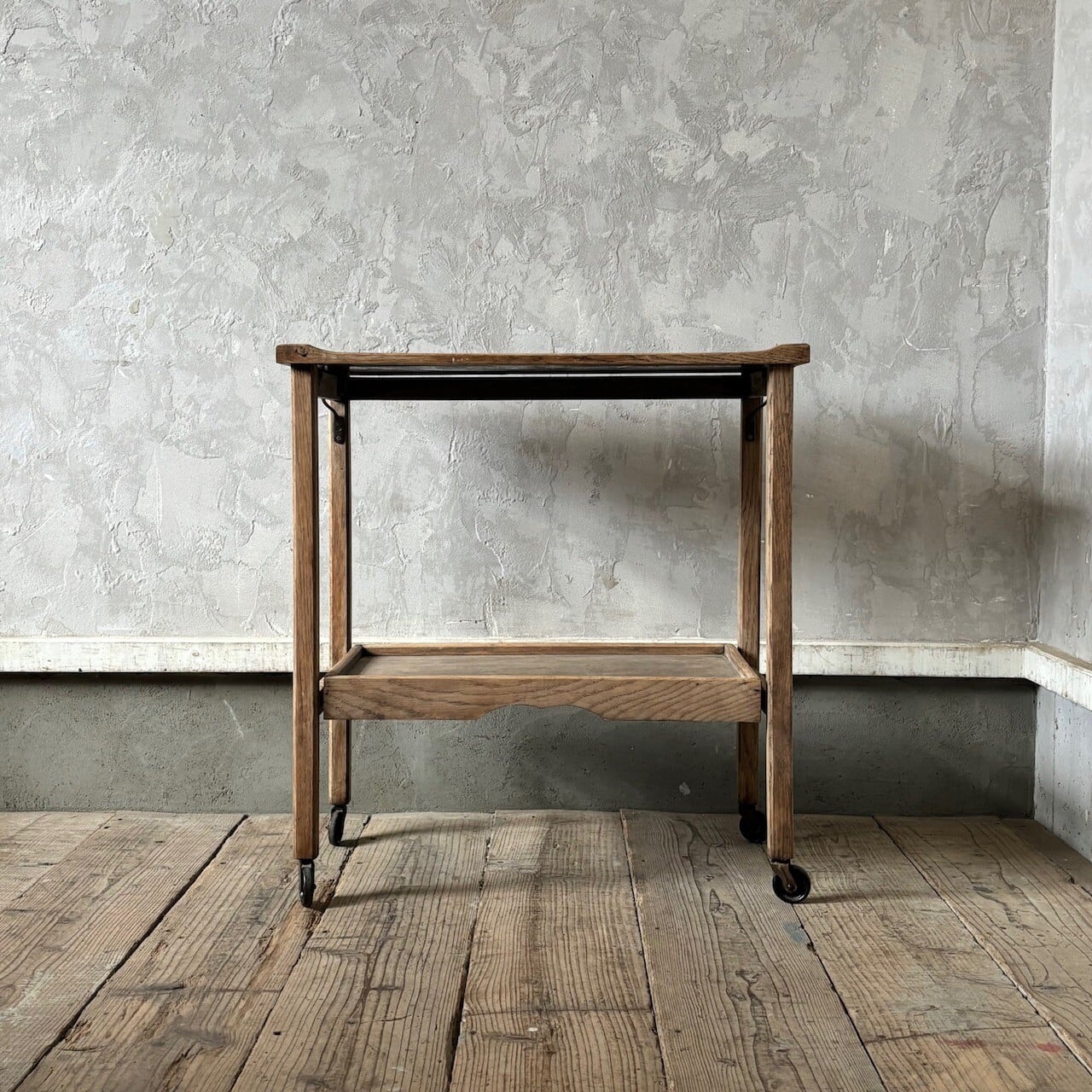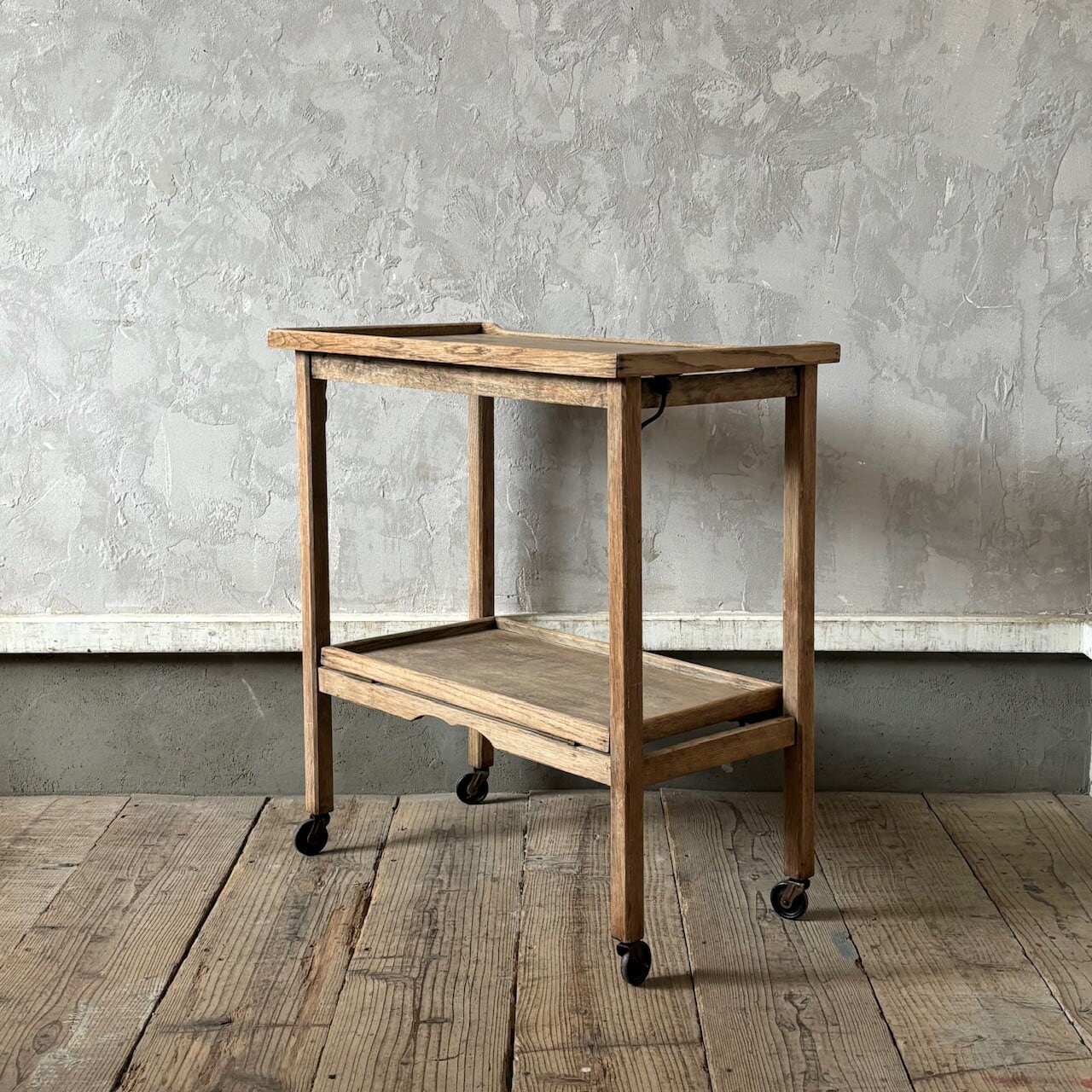 ティーセットやデザートなどを運ぶ際に使われていたトロリー。キャスターはスムーズに動くので実用的で、キッチン脇で使ったりサイドテーブルとして使ったりと使い勝手が良いです。使わない際は折りたたみが可能です。