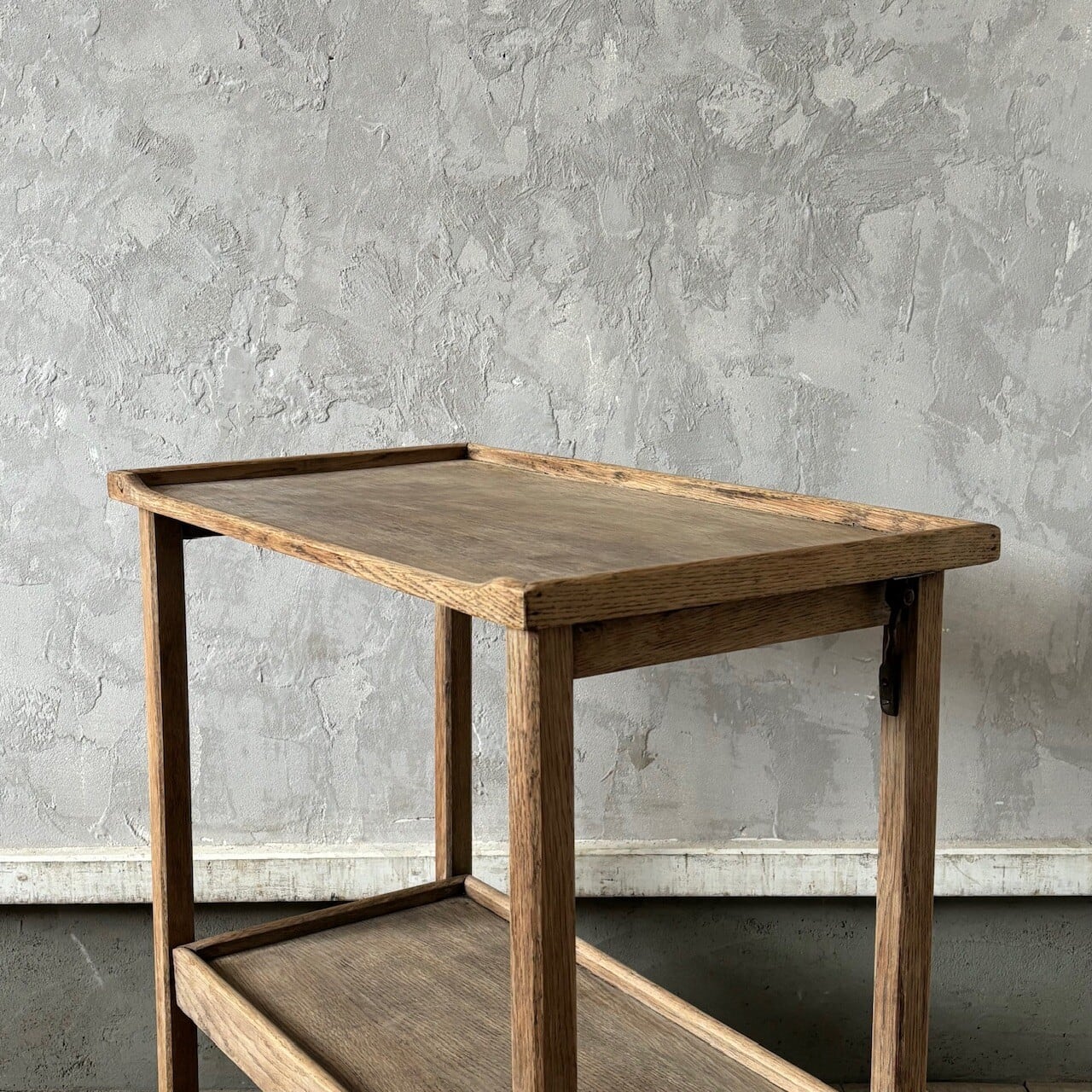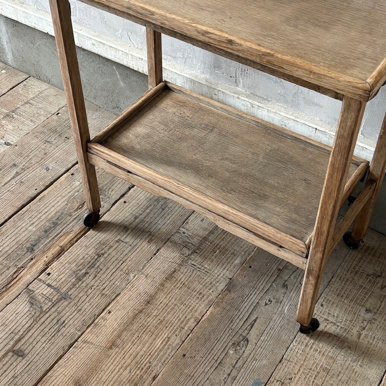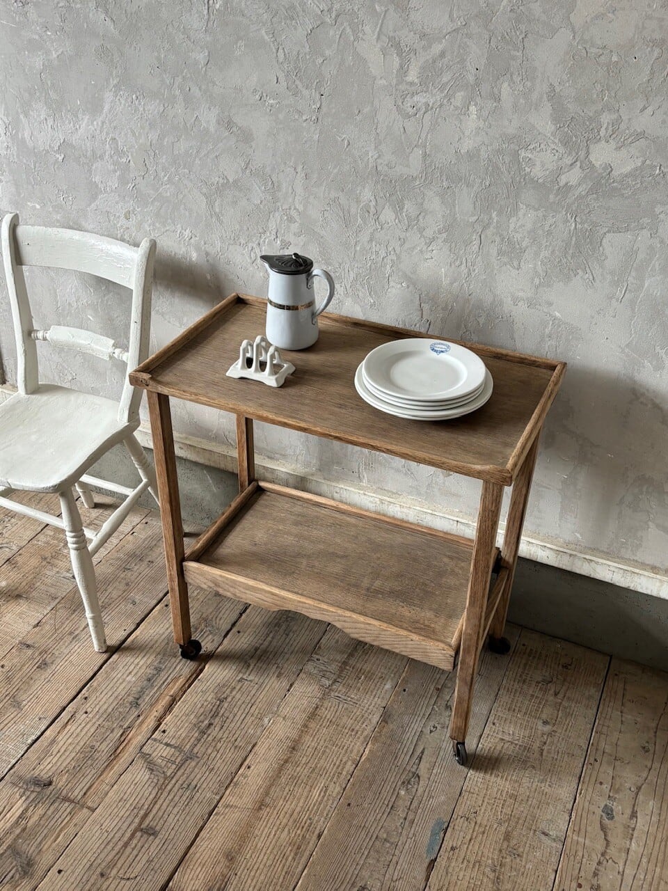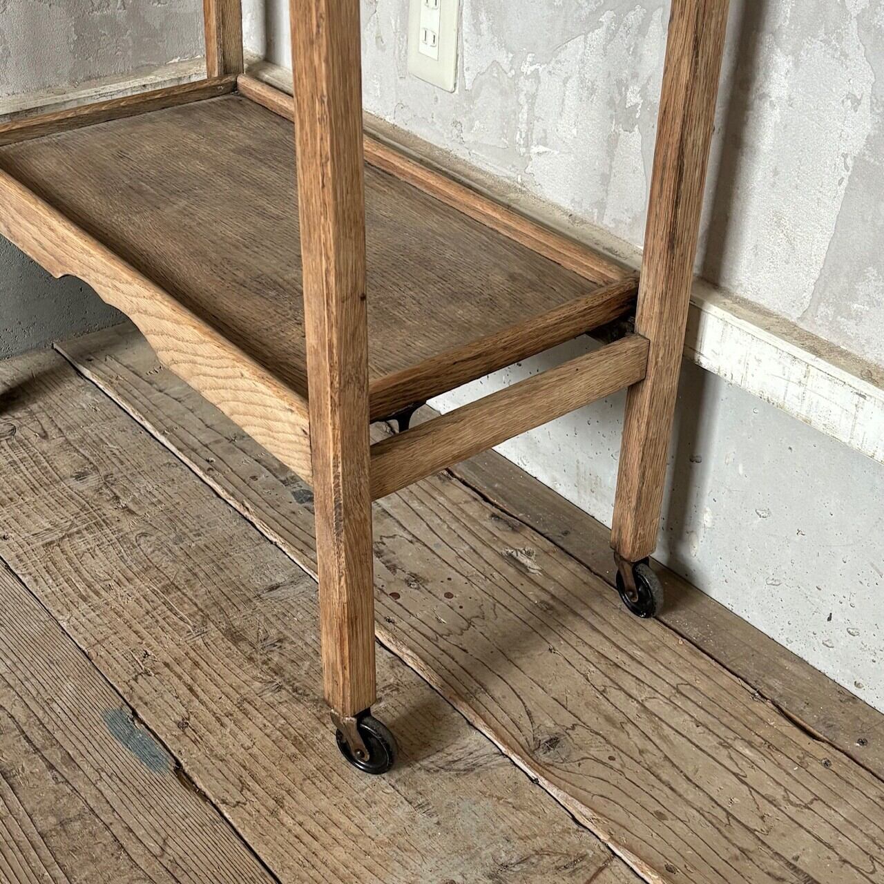 ティーセットやデザートなどを運ぶ際に使われていたトロリー。キャスターはスムーズに動くので実用的で、キッチン脇で使ったりサイドテーブルとして使ったりと使い勝手が良いです。使わない際は折りたたみが可能です。