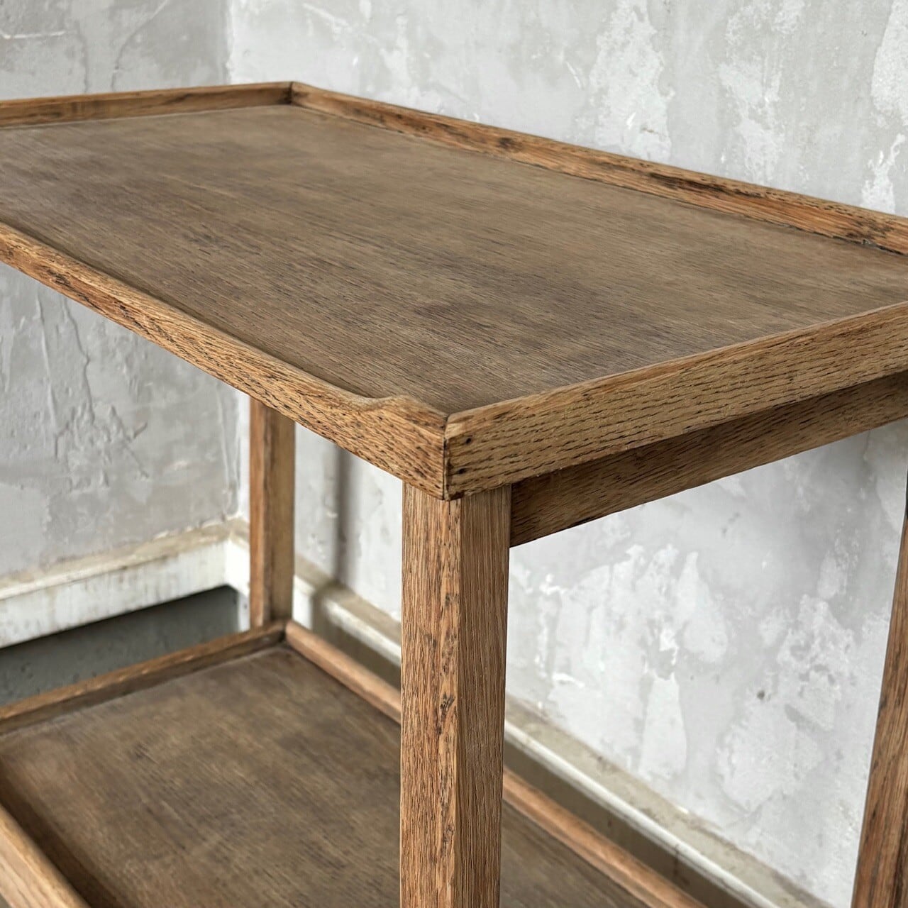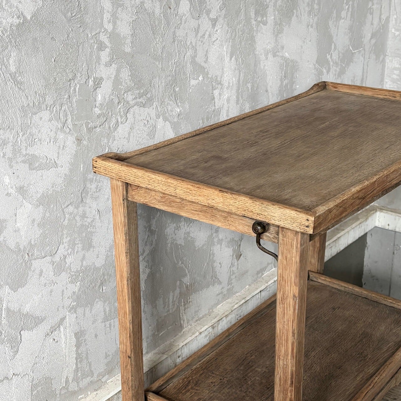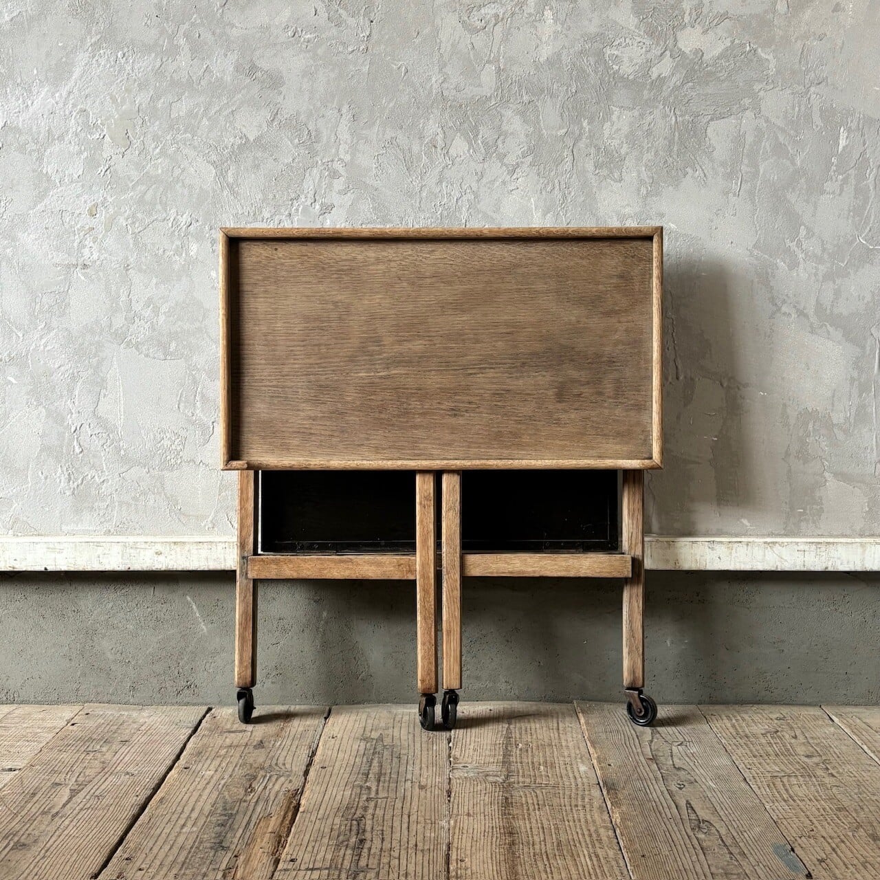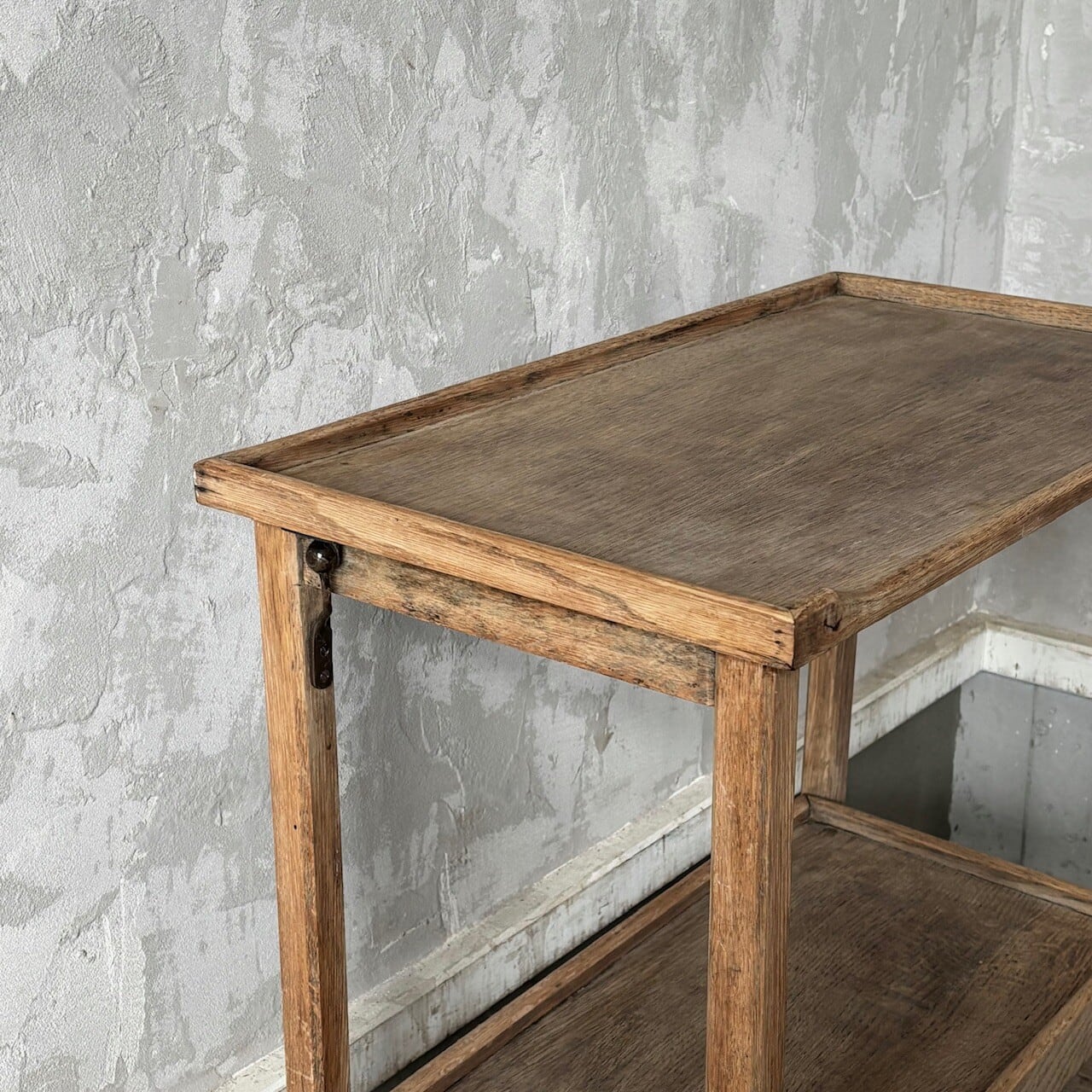 ティーセットやデザートなどを運ぶ際に使われていたトロリー。キャスターはスムーズに動くので実用的で、キッチン脇で使ったりサイドテーブルとして使ったりと使い勝手が良いです。使わない際は折りたたみが可能です。