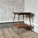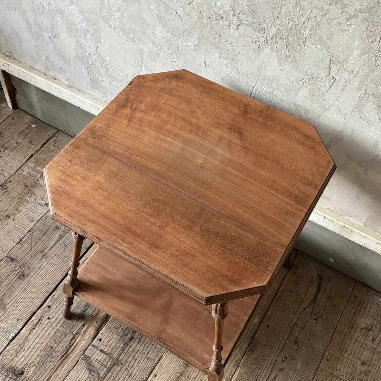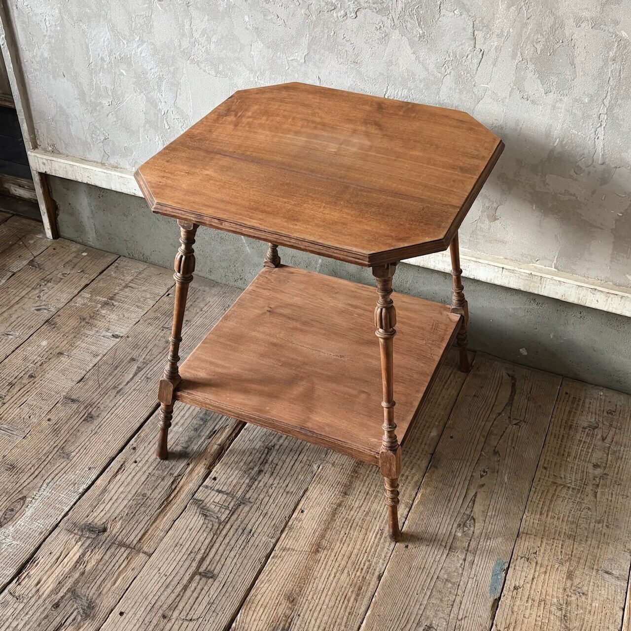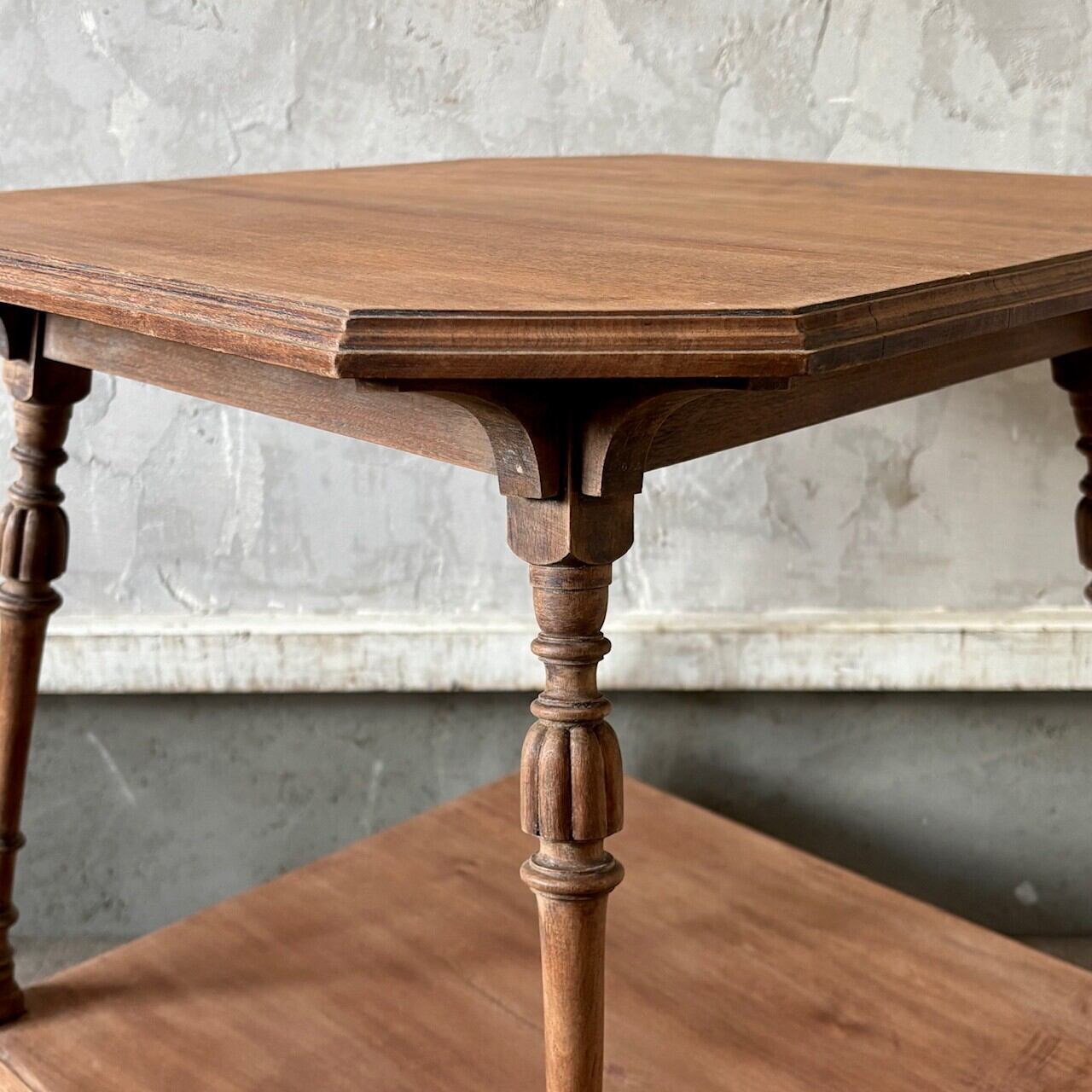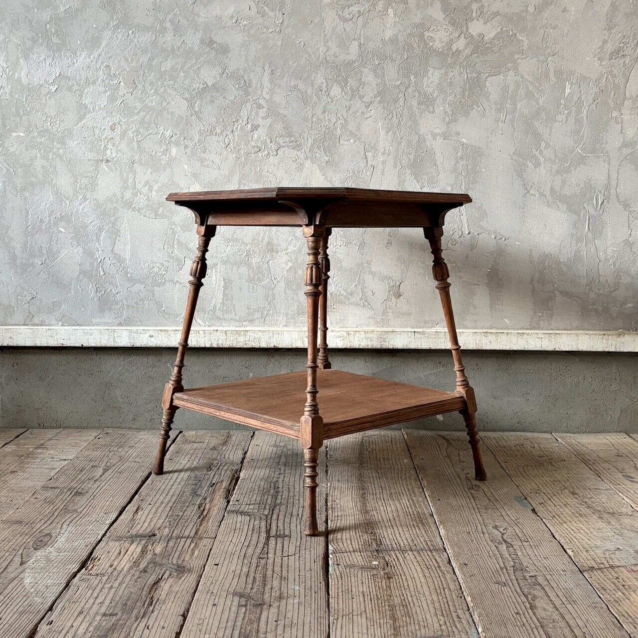 高さが少し低めのサイドテーブル。8角形の天板や細くすらりと伸びる4本の脚と脚周りの装飾が良い雰囲気です。天板はやや広めで下部にも本などを置ける広めの棚があるので便利です。