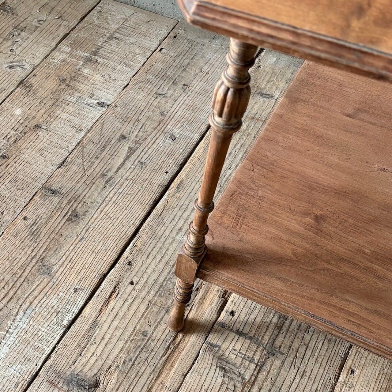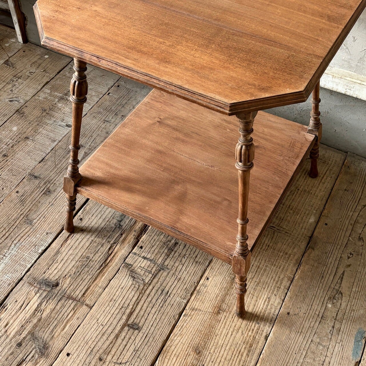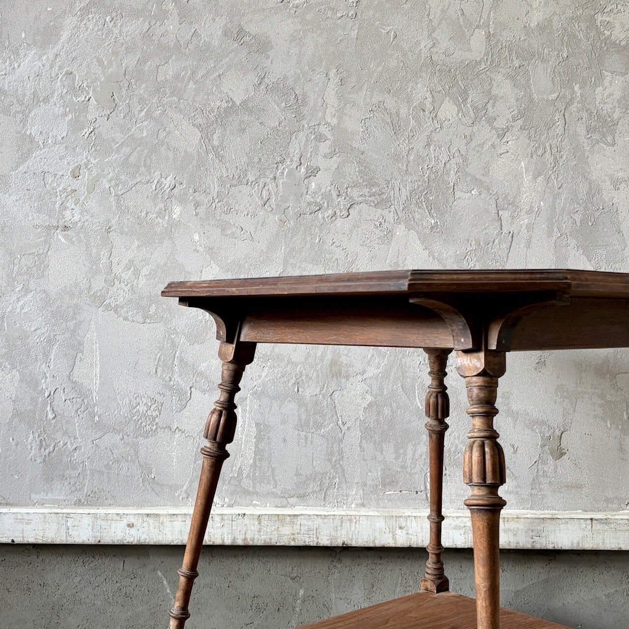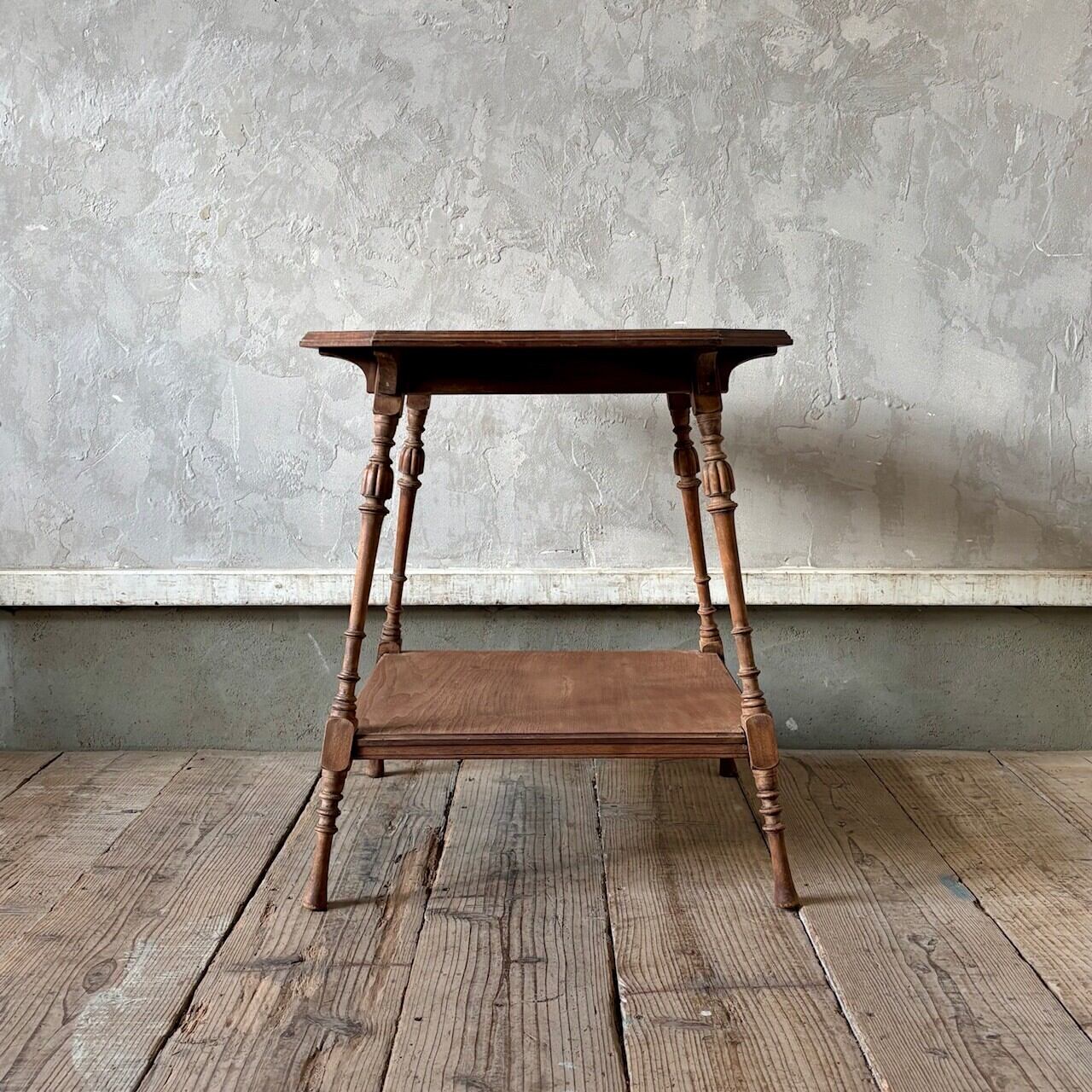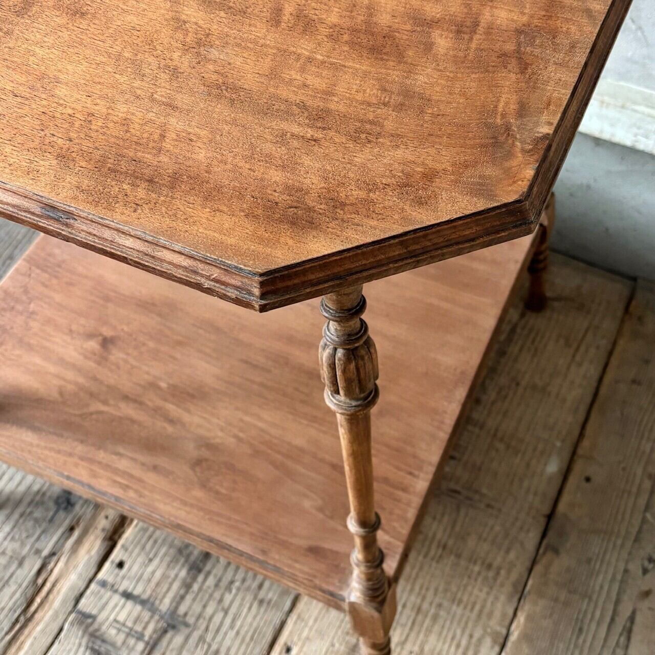 高さが少し低めのサイドテーブル。8角形の天板や細くすらりと伸びる4本の脚と脚周りの装飾が良い雰囲気です。天板はやや広めで下部にも本などを置ける広めの棚があるので便利です。