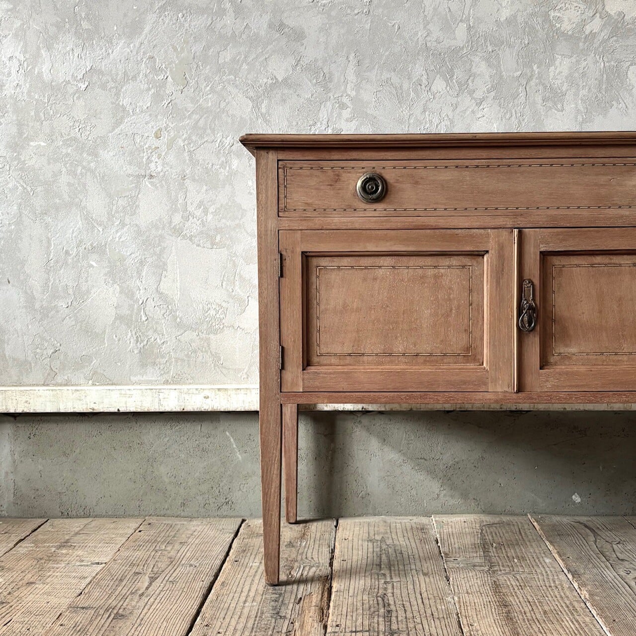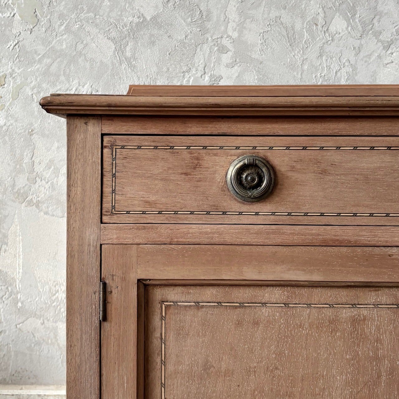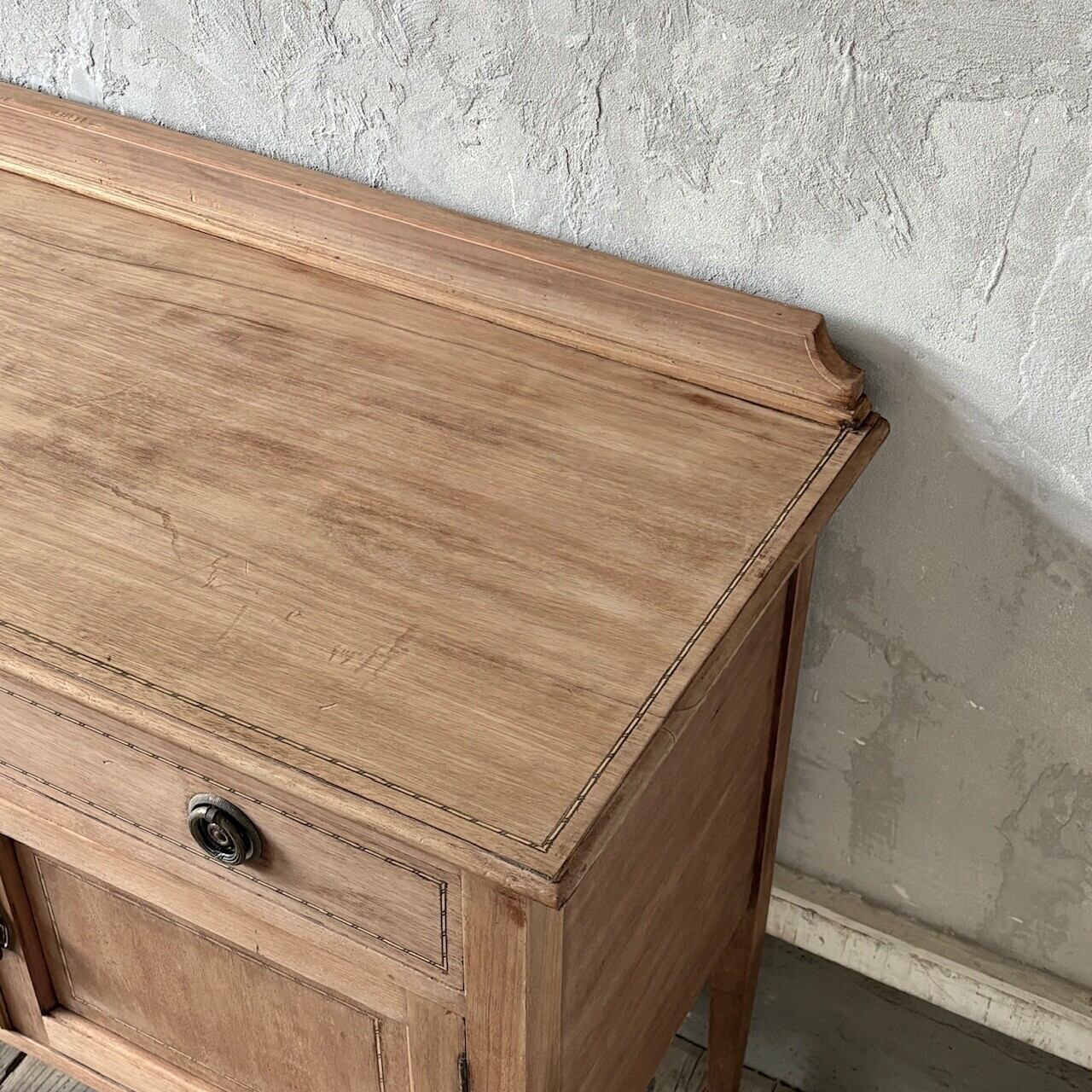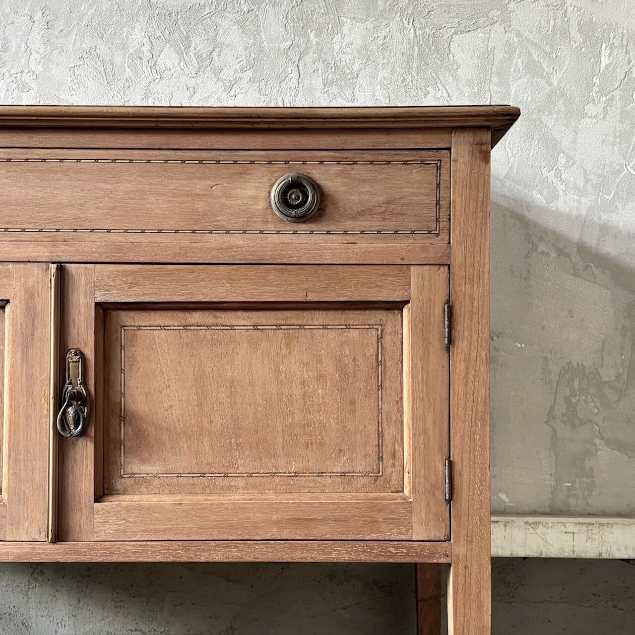 程よいサイズ感のサイドボード。扉や天板に施された象嵌細工や取手金具がクラシカルな印象で良い雰囲気です。やや広めの引き出しと扉収納があり、扉内は仕切りのない空間になっているので収納力があります。飾り棚や本棚などとして様々な場所で使えそうです。