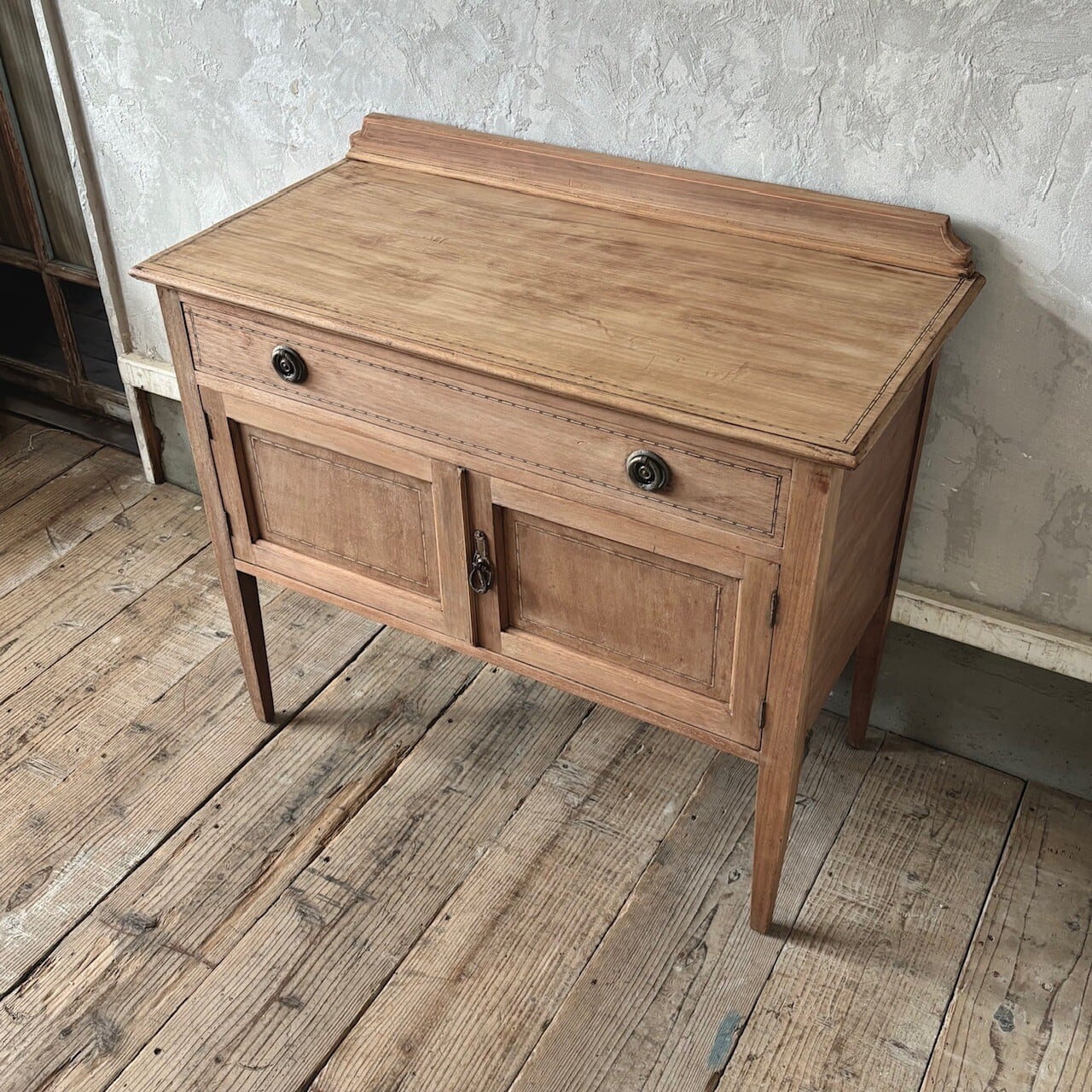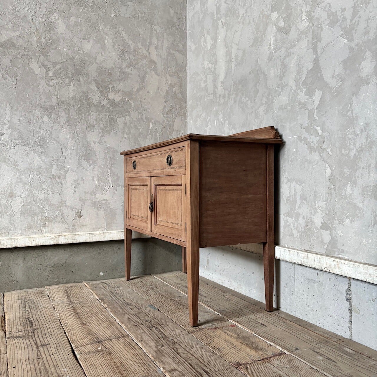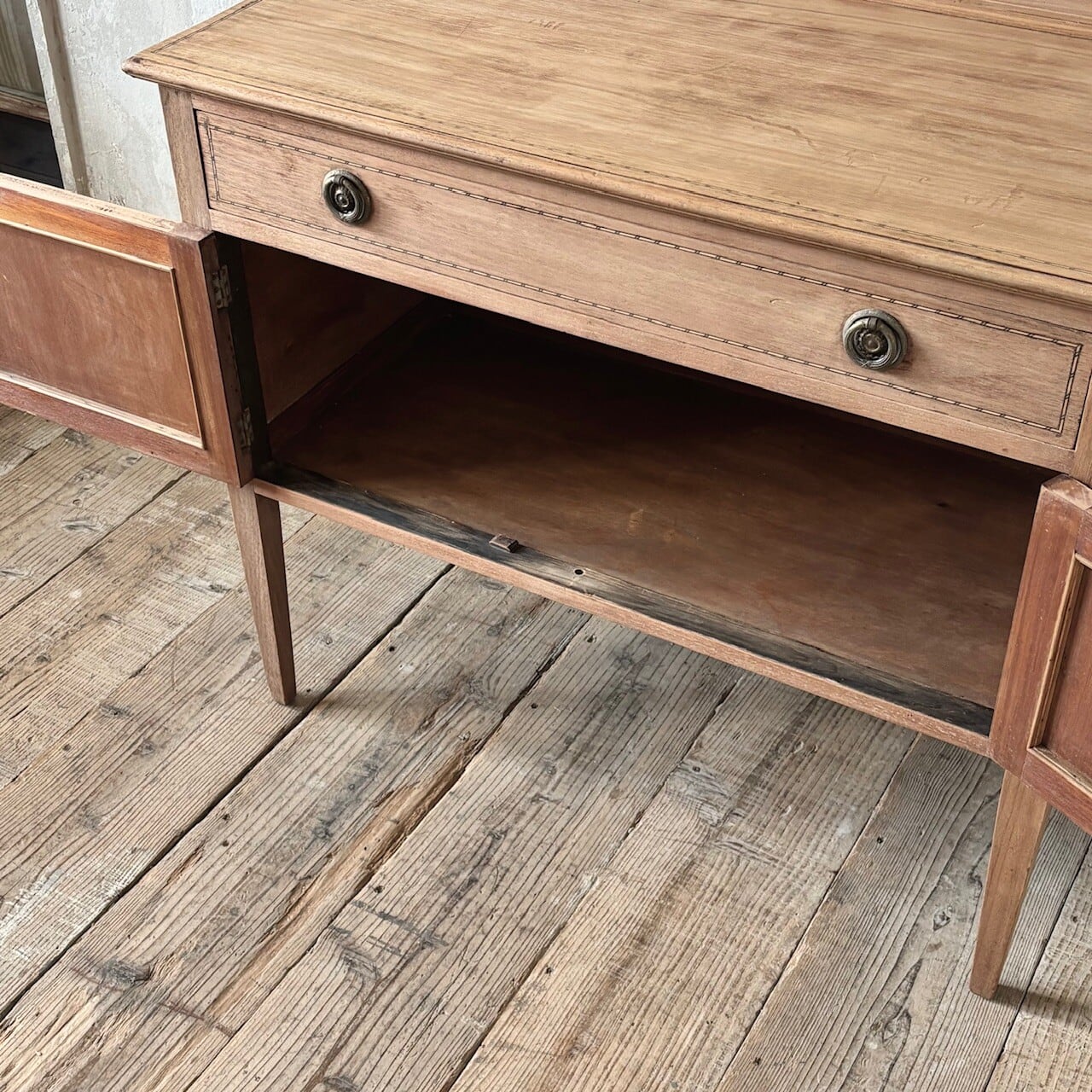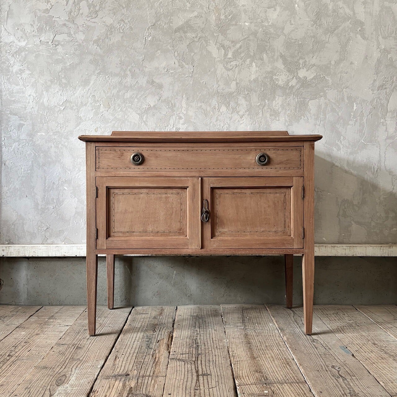 程よいサイズ感のサイドボード。扉や天板に施された象嵌細工や取手金具がクラシカルな印象で良い雰囲気です。やや広めの引き出しと扉収納があり、扉内は仕切りのない空間になっているので収納力があります。飾り棚や本棚などとして様々な場所で使えそうです。