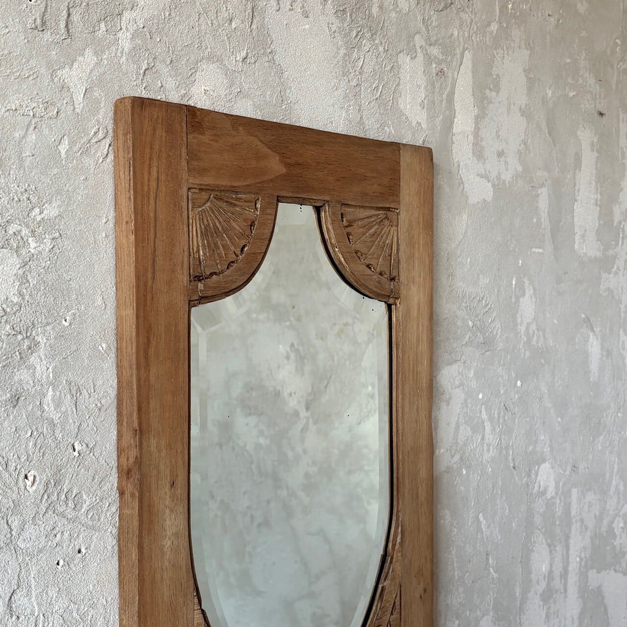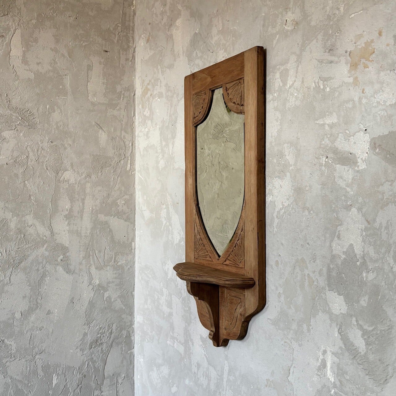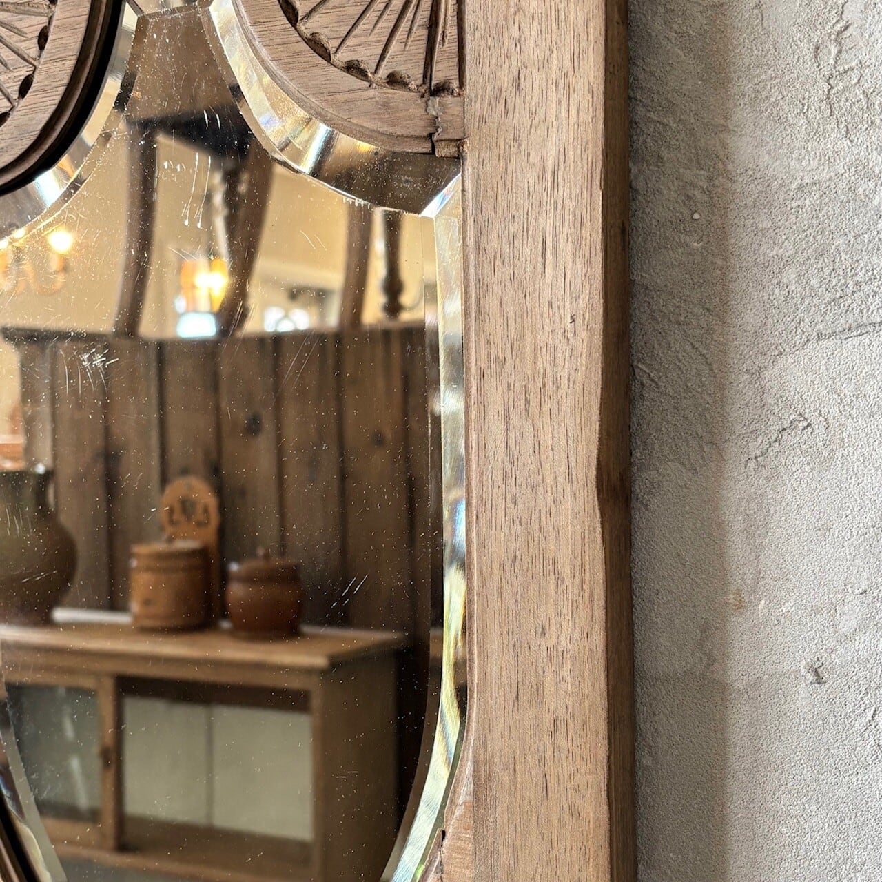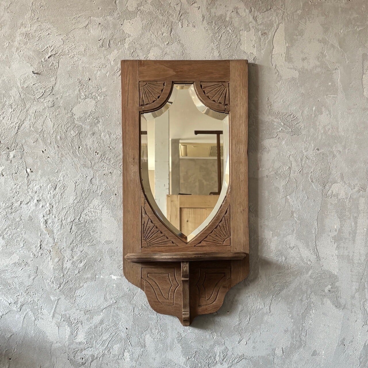 教会で使われていたというウォールミラー。フレームの彫り込みやフレームの形に沿ってはいる鏡面のカットが存在感を高めています。下部には棚板がありちょっとした小物を飾ることができます。鏡面は少し離れると頭頂部から胸部辺りまでが映るサイズ感で、所々に黒点や小傷などありますが普段使いができる範囲かと思います。背面に壁掛け用の金具がついています。