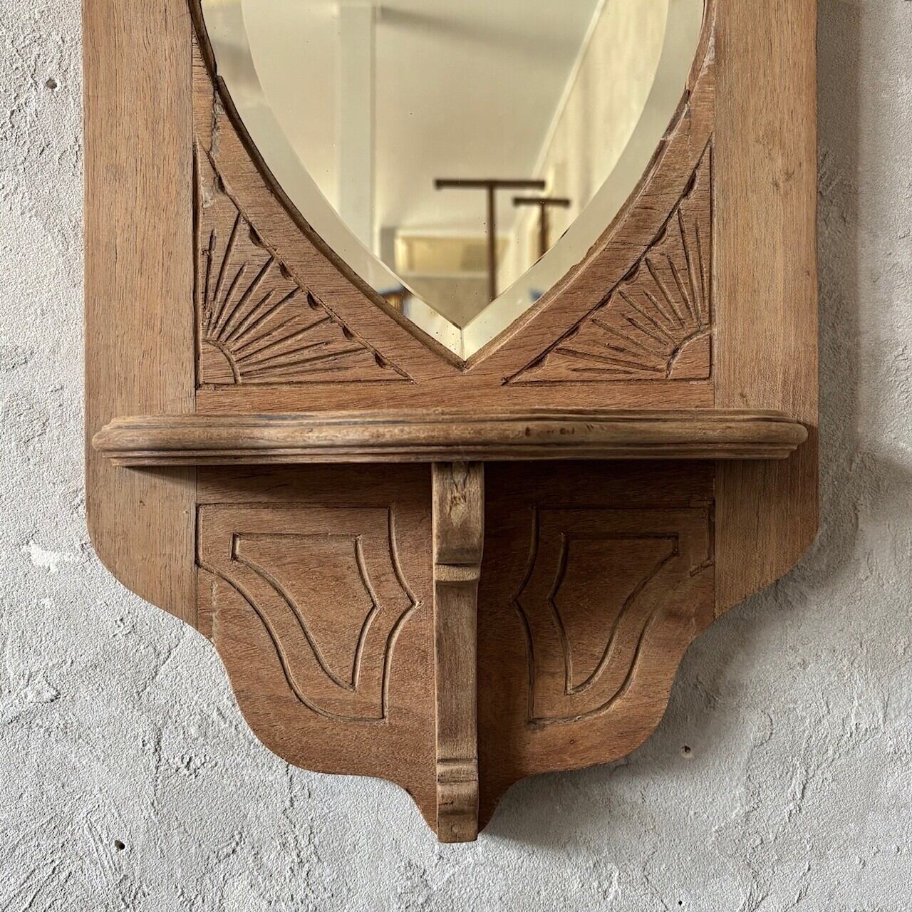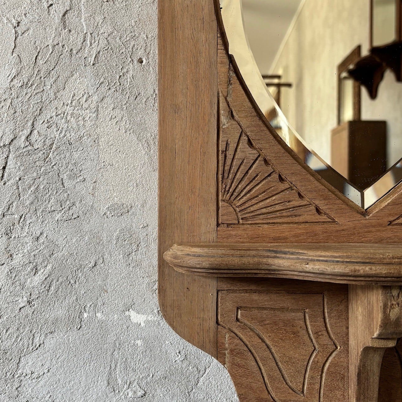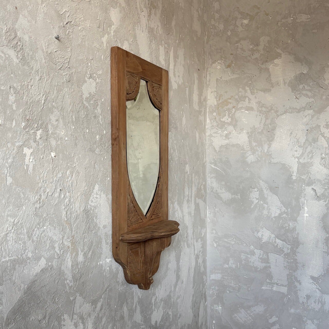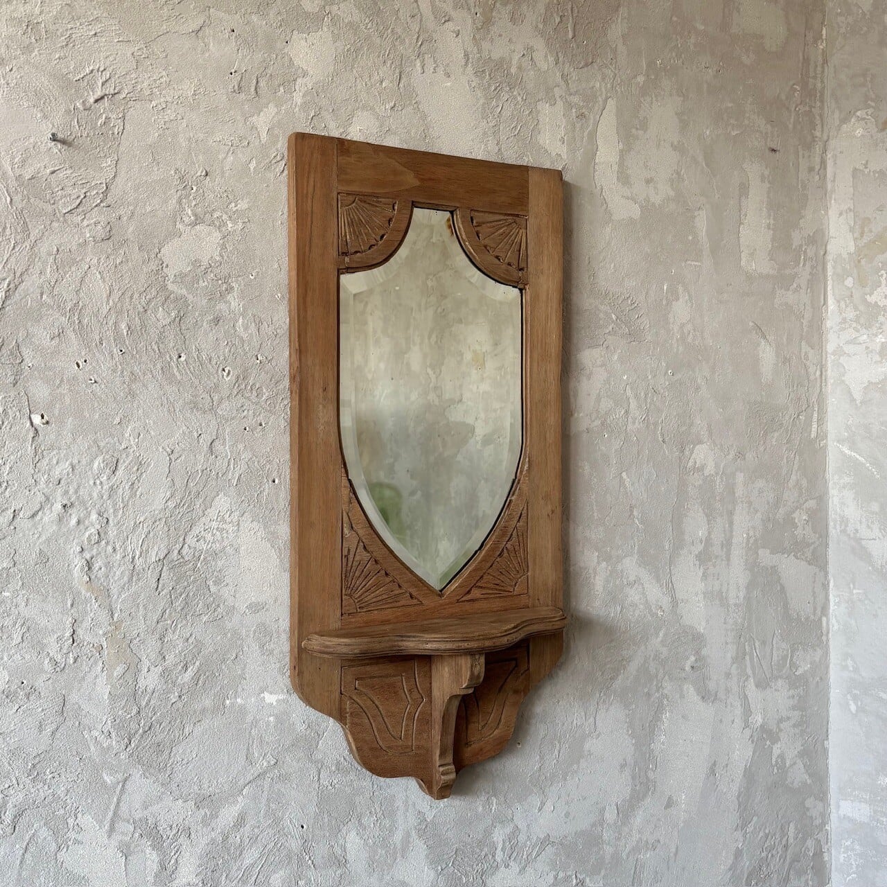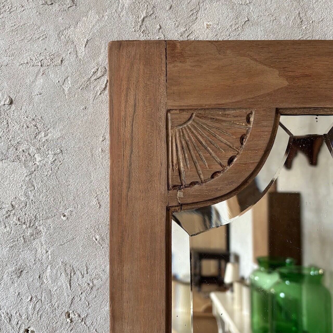 教会で使われていたというウォールミラー。フレームの彫り込みやフレームの形に沿ってはいる鏡面のカットが存在感を高めています。下部には棚板がありちょっとした小物を飾ることができます。鏡面は少し離れると頭頂部から胸部辺りまでが映るサイズ感で、所々に黒点や小傷などありますが普段使いができる範囲かと思います。背面に壁掛け用の金具がついています。