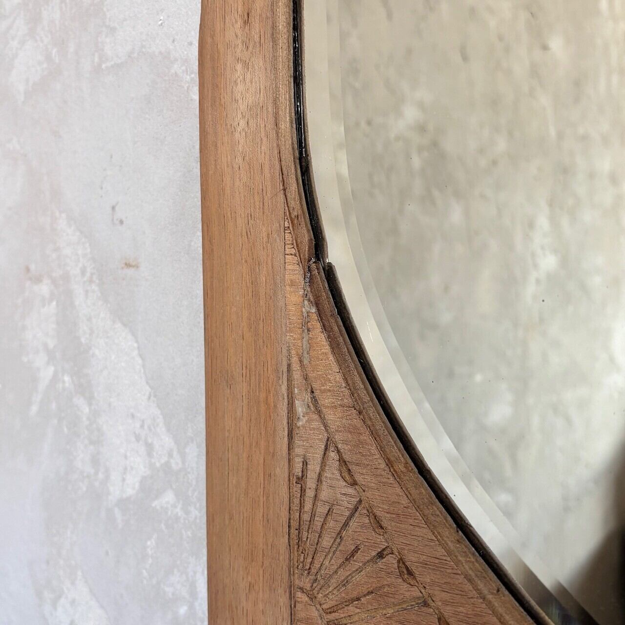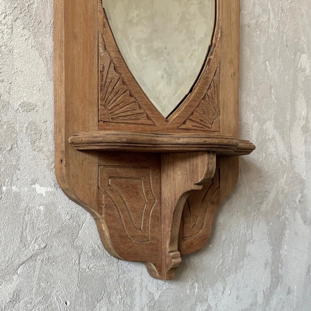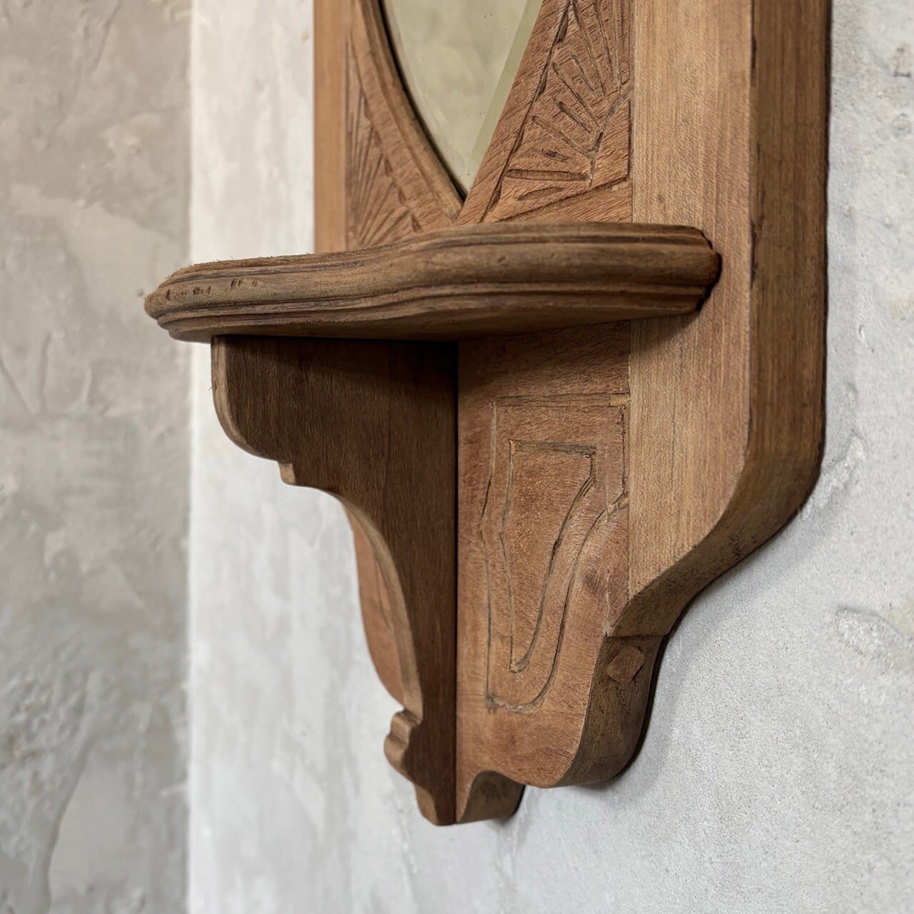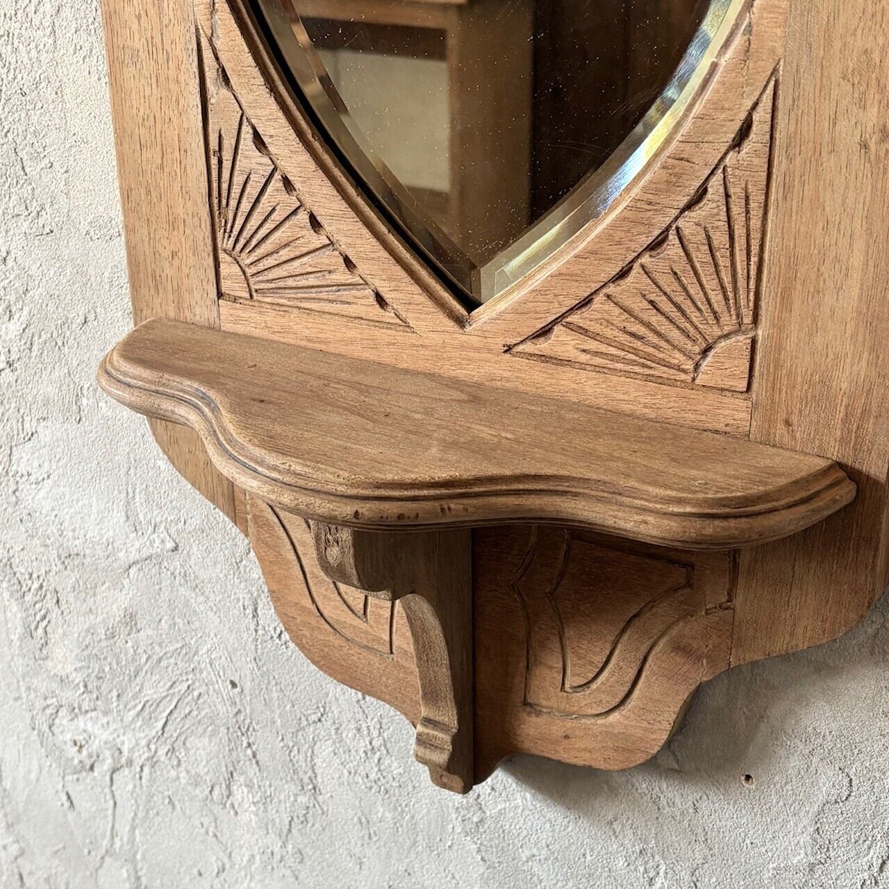 教会で使われていたというウォールミラー。フレームの彫り込みやフレームの形に沿ってはいる鏡面のカットが存在感を高めています。下部には棚板がありちょっとした小物を飾ることができます。鏡面は少し離れると頭頂部から胸部辺りまでが映るサイズ感で、所々に黒点や小傷などありますが普段使いができる範囲かと思います。背面に壁掛け用の金具がついています。