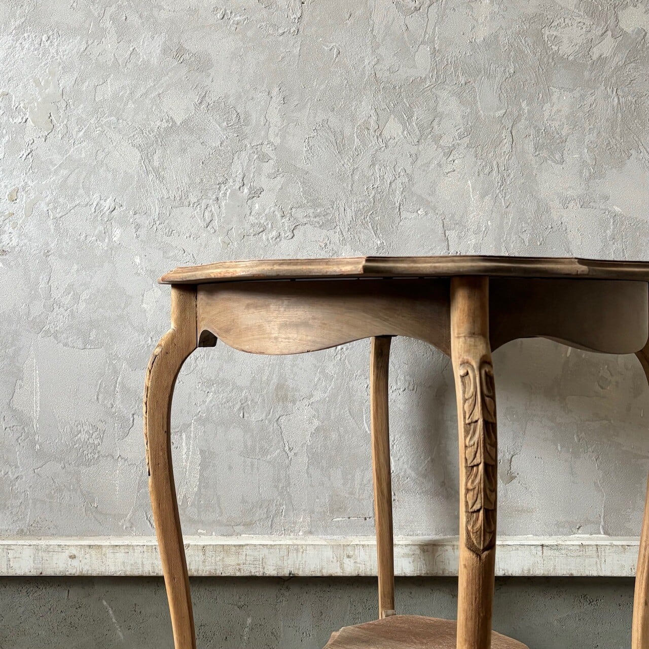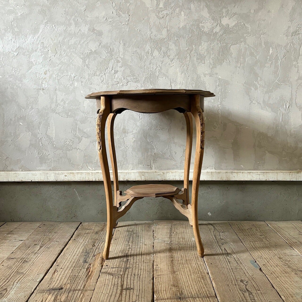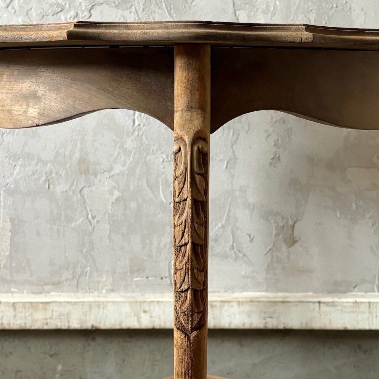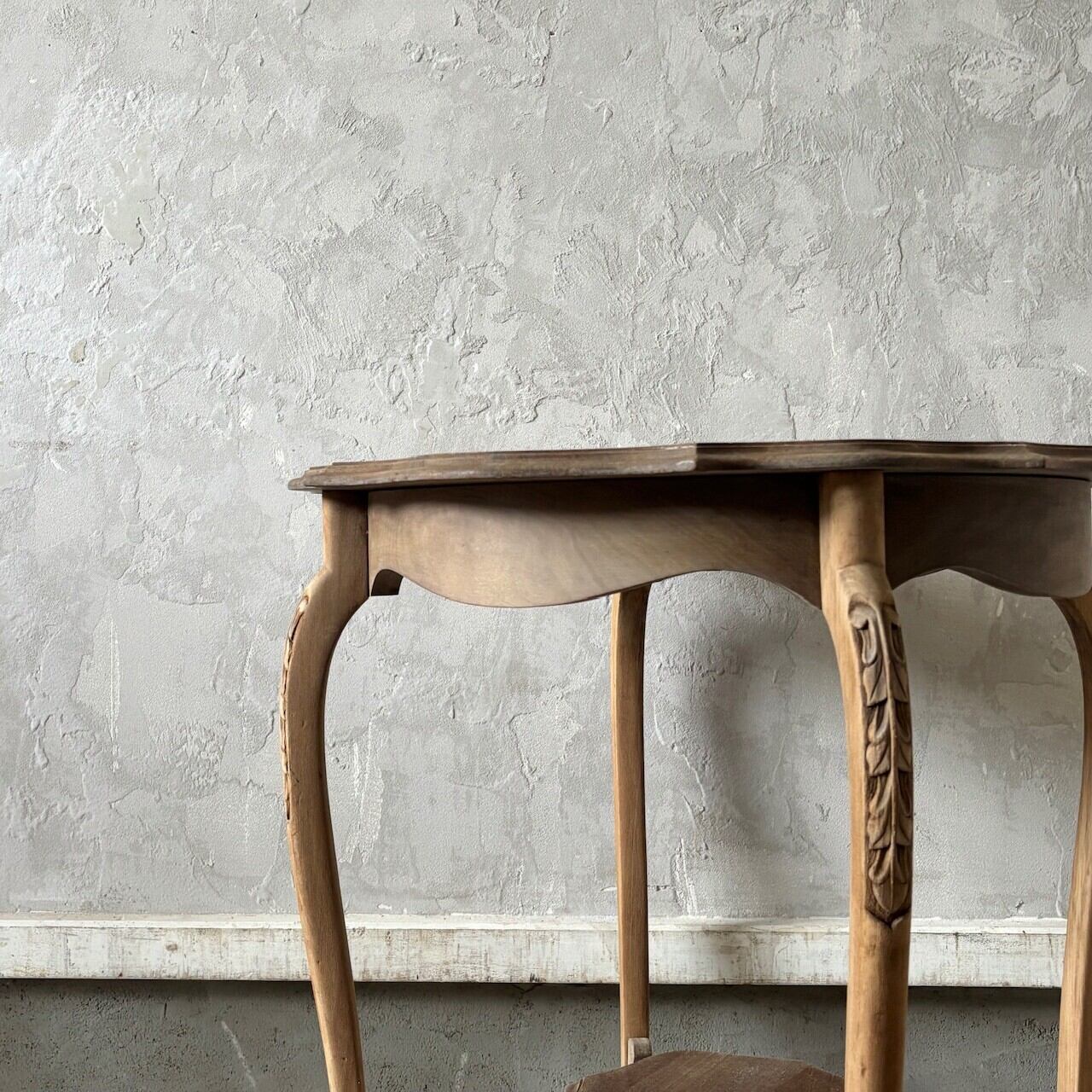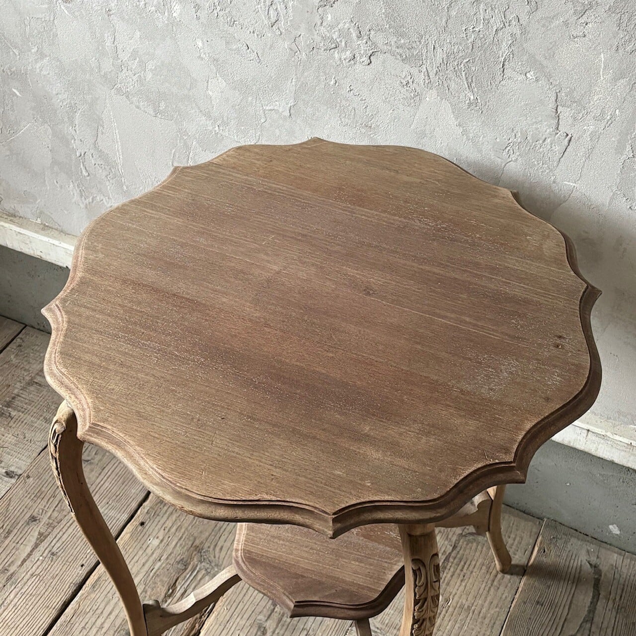 天板の形が印象的なサイドテーブル。緩やかな曲線を描く細めの脚や天板縁や脚部など所々に施された装飾が魅力的です。ちょっとしたテーブルとしてやディスプレイテーブルとしてなど様々な用途で使えそうです。