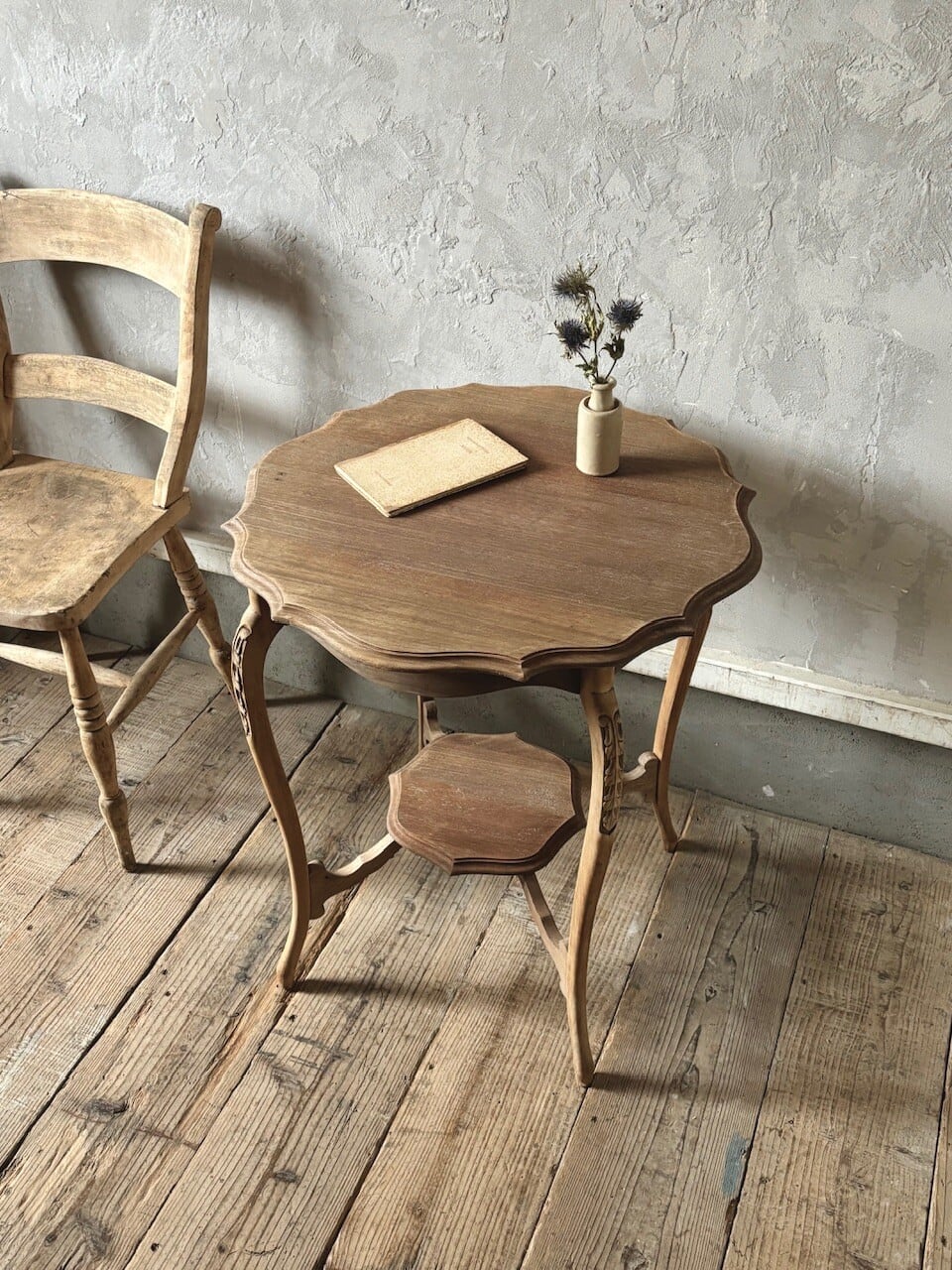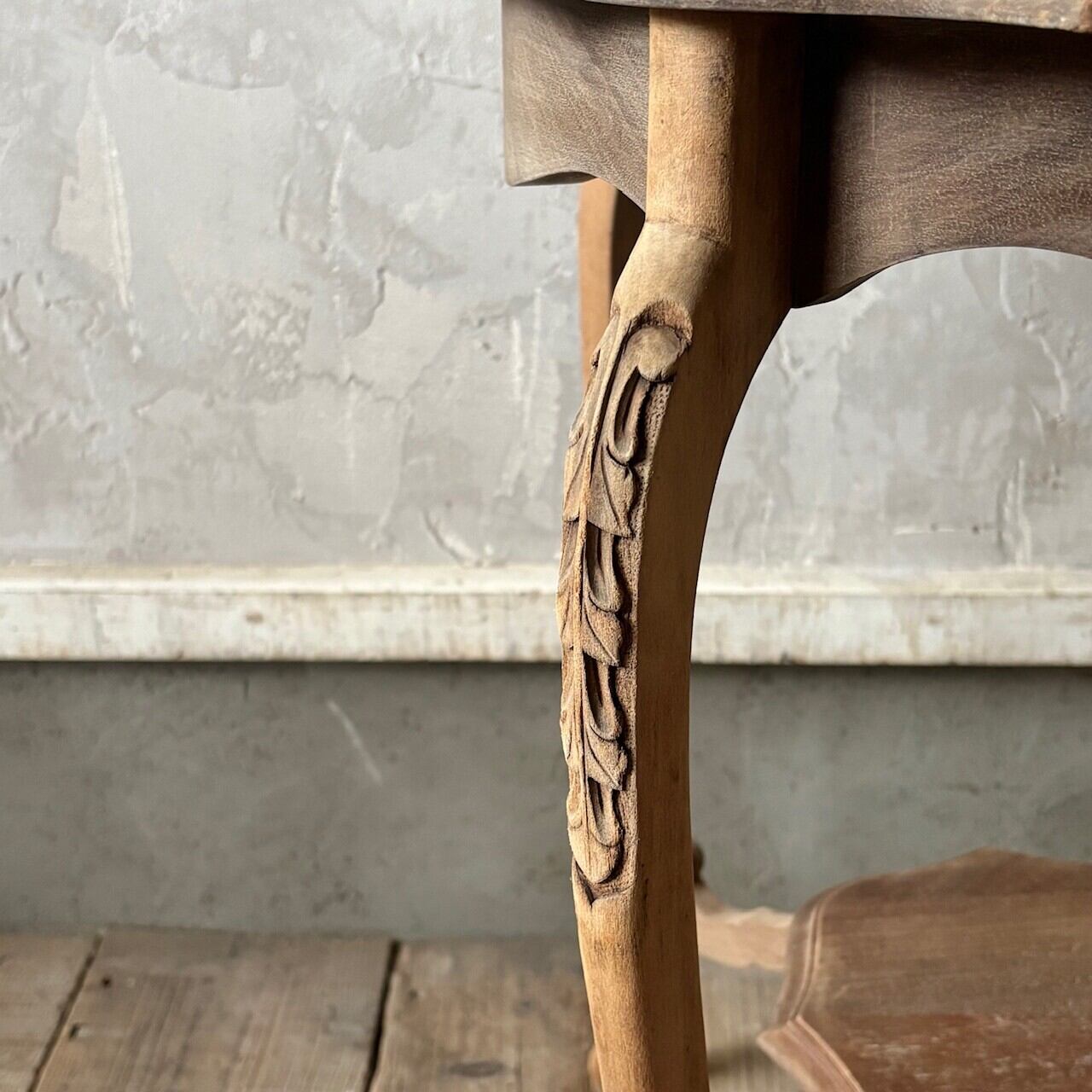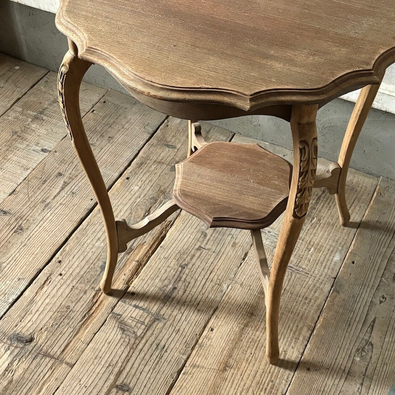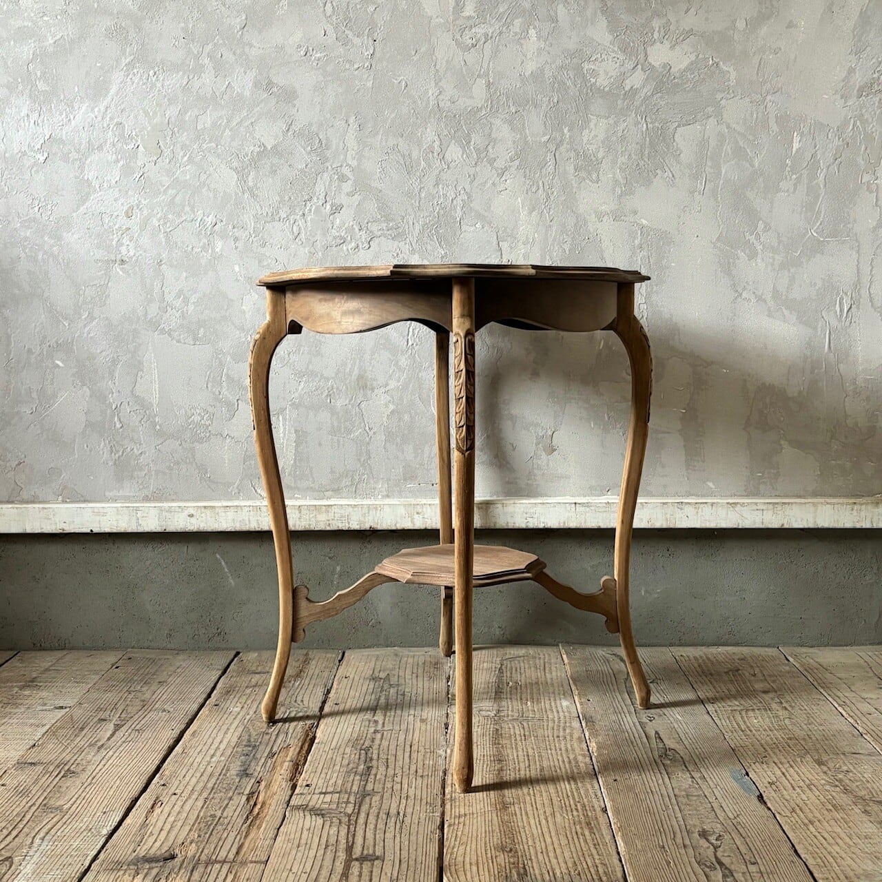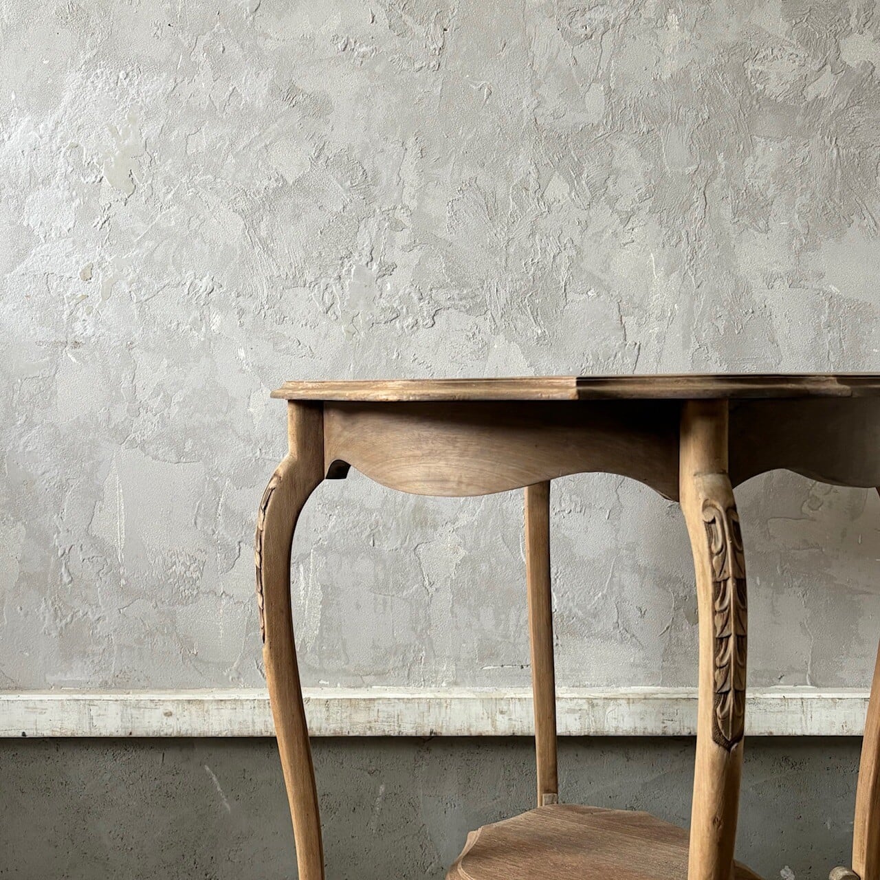 天板の形が印象的なサイドテーブル。緩やかな曲線を描く細めの脚や天板縁や脚部など所々に施された装飾が魅力的です。ちょっとしたテーブルとしてやディスプレイテーブルとしてなど様々な用途で使えそうです。
