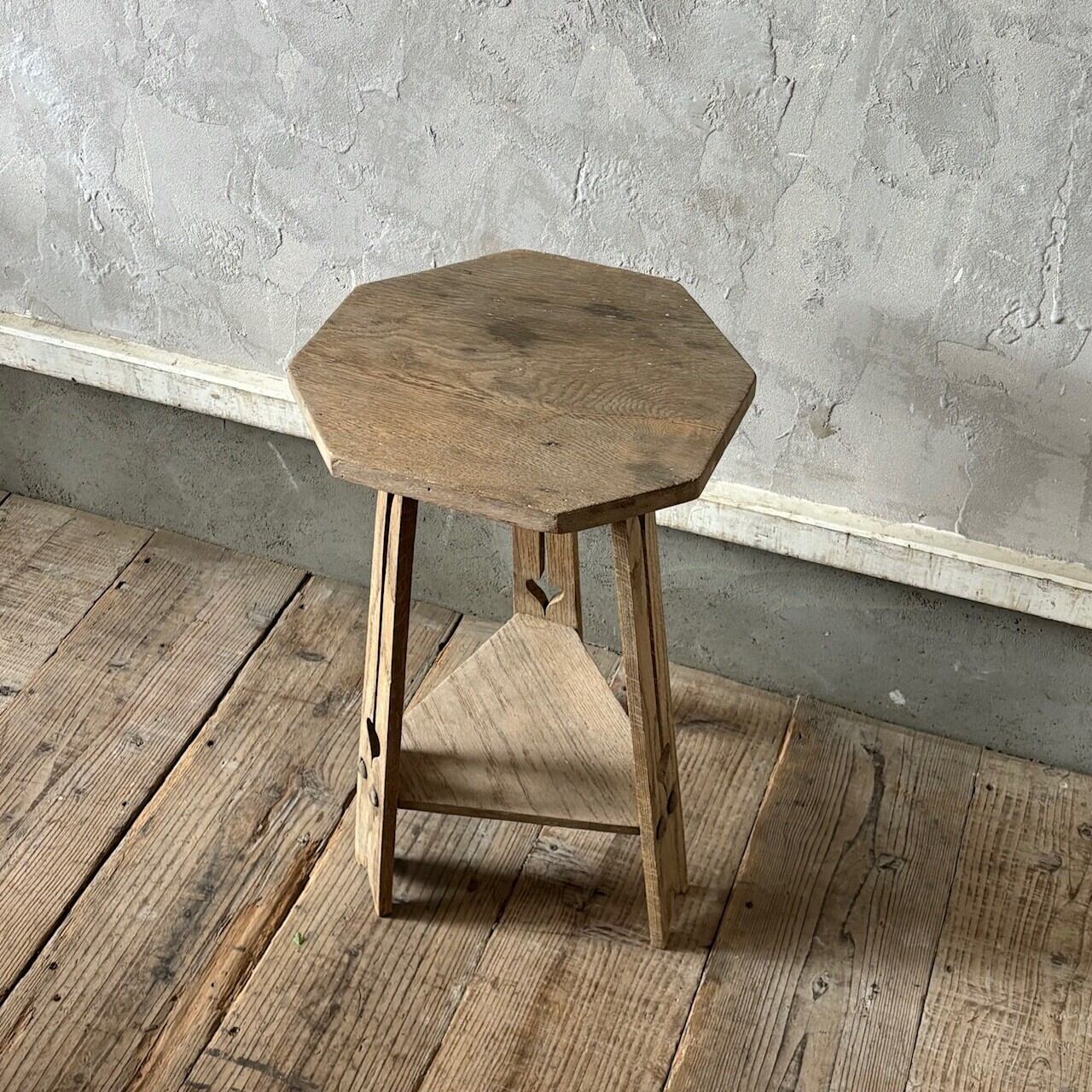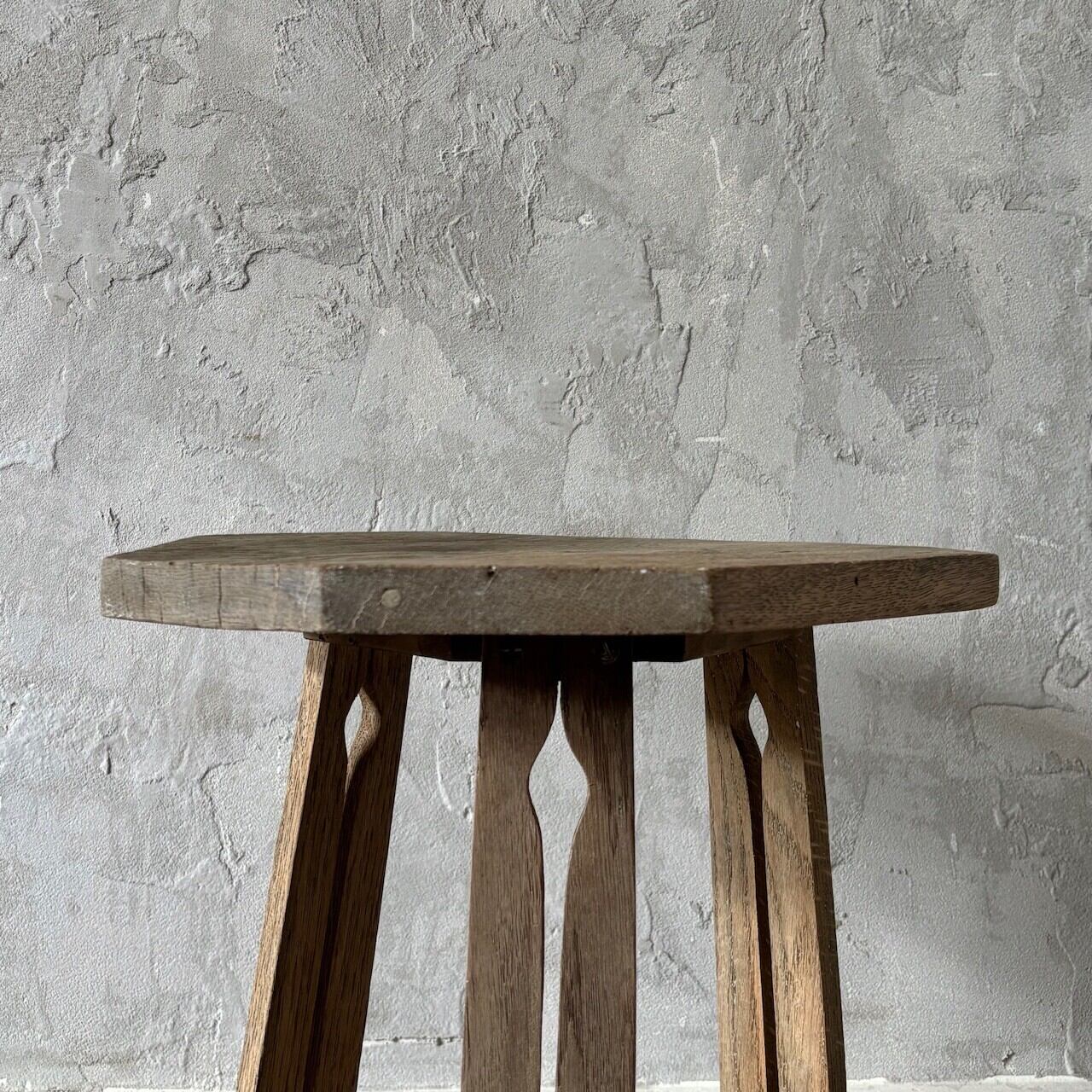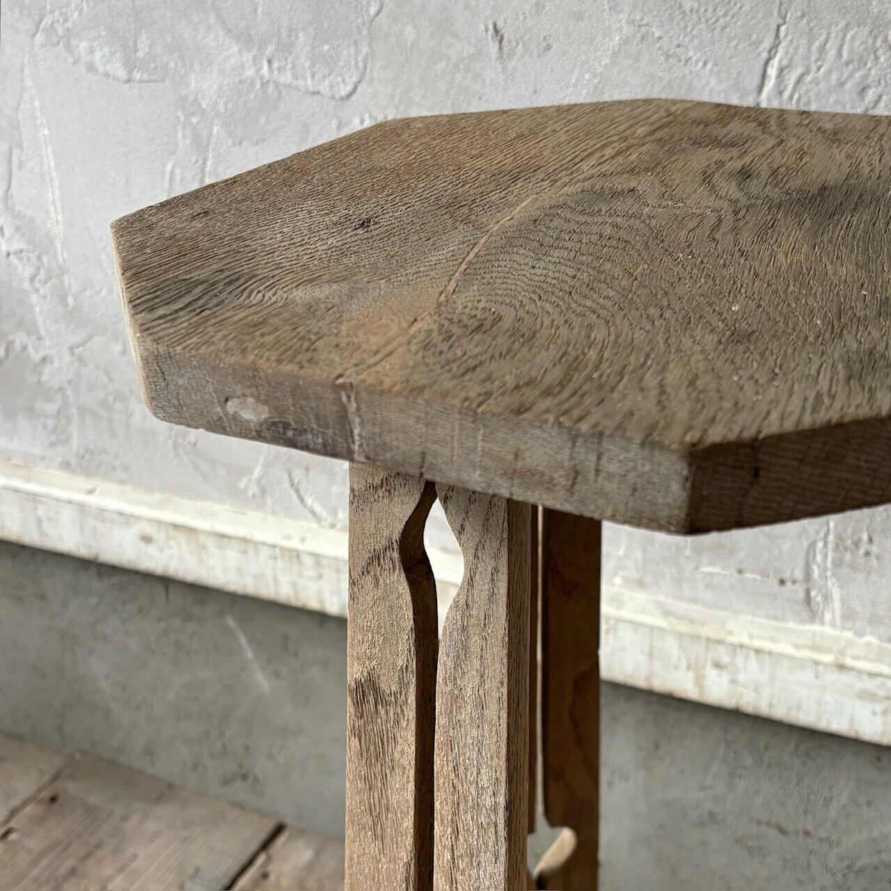 均等ではない形が素朴で愛嬌があるオーク材のサイドテーブル。脚部に施された装飾、左右非対称の天板や全体的に歪んだ形など古いものならではの魅力があります。椅子と合わせてちょっとしたテーブルとしてや花台やベッドサイドテーブルとしてなど様々な用途で使えそうです。