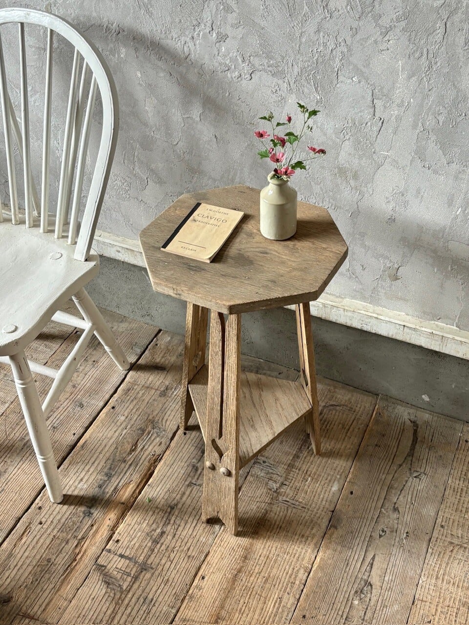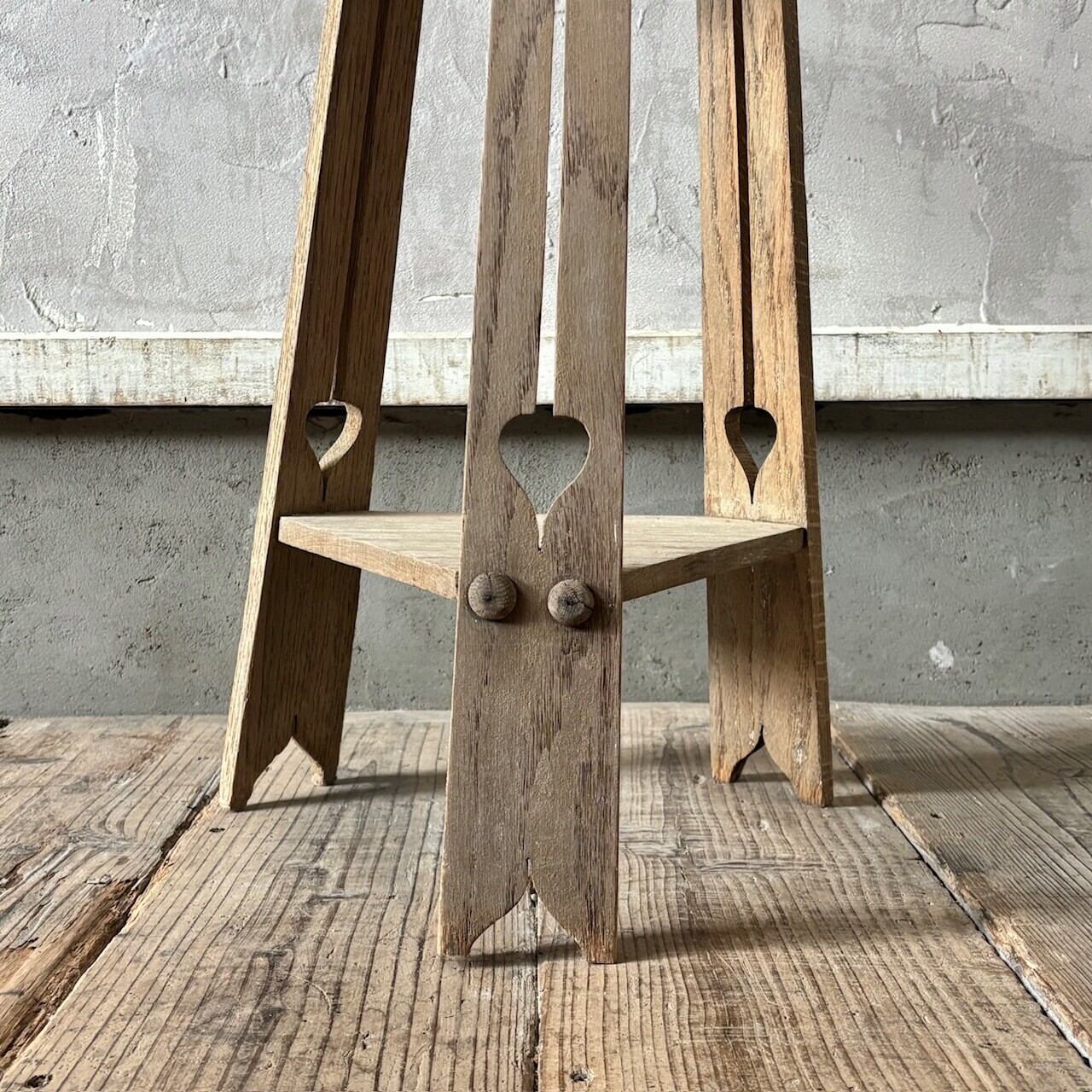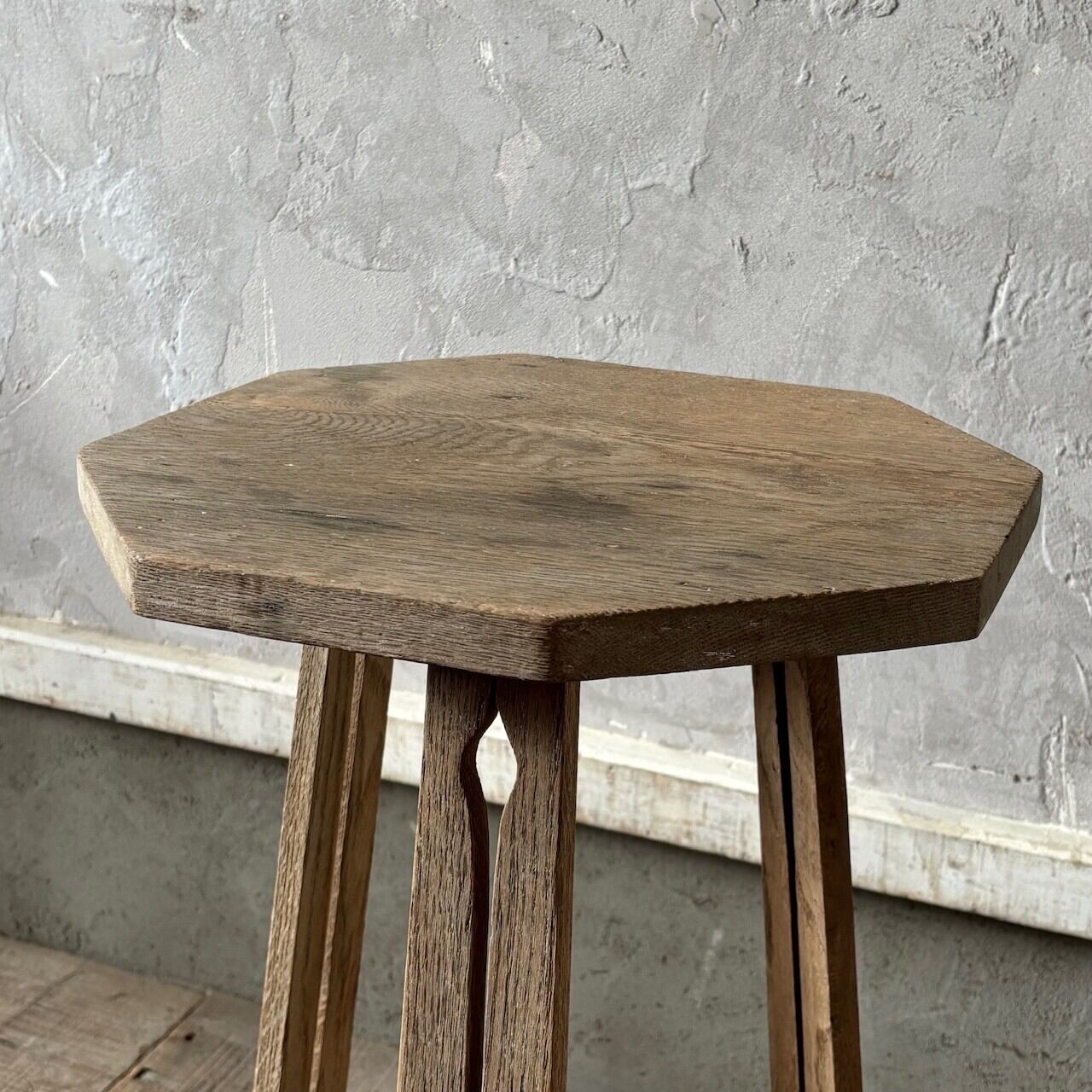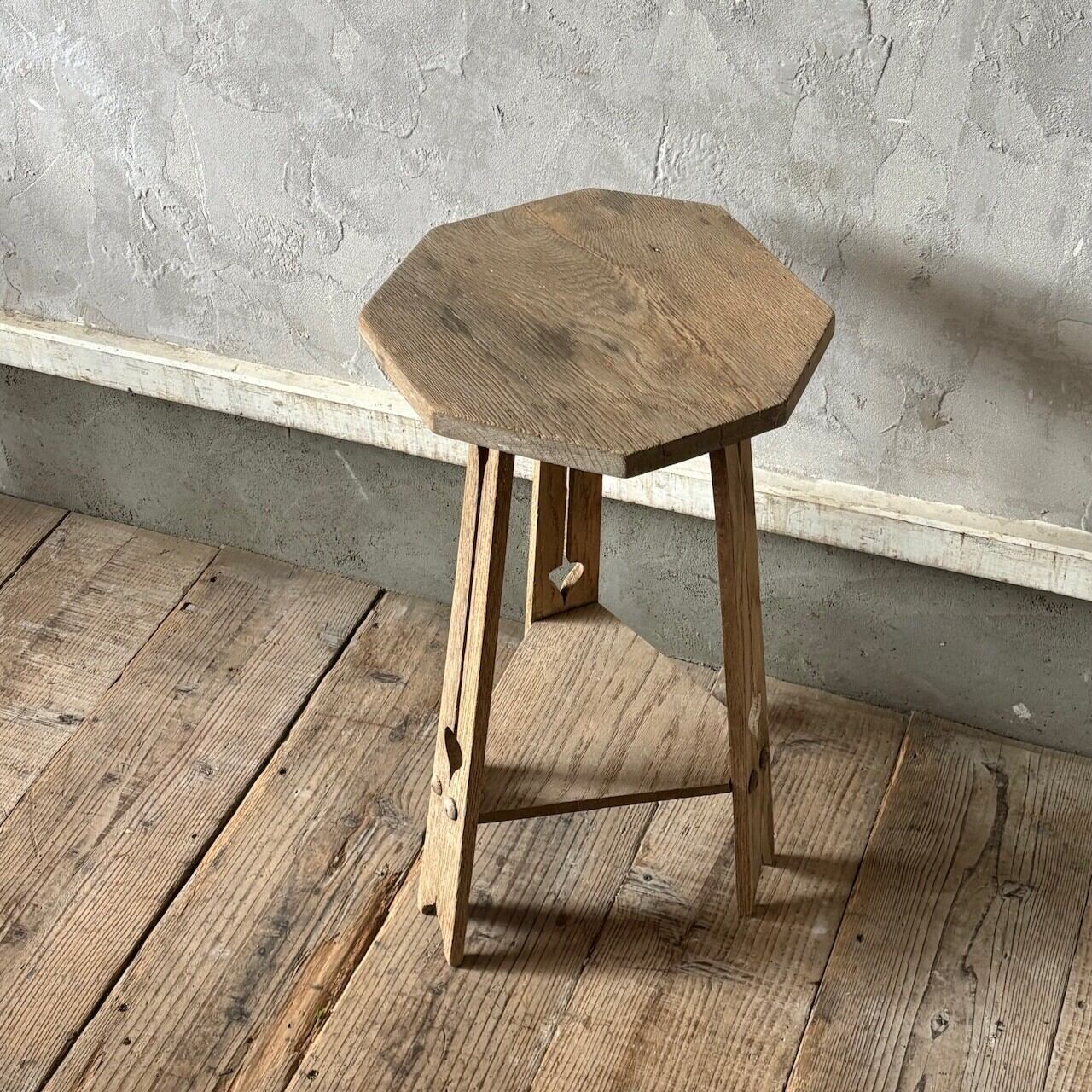 均等ではない形が素朴で愛嬌があるオーク材のサイドテーブル。脚部に施された装飾、左右非対称の天板や全体的に歪んだ形など古いものならではの魅力があります。椅子と合わせてちょっとしたテーブルとしてや花台やベッドサイドテーブルとしてなど様々な用途で使えそうです。