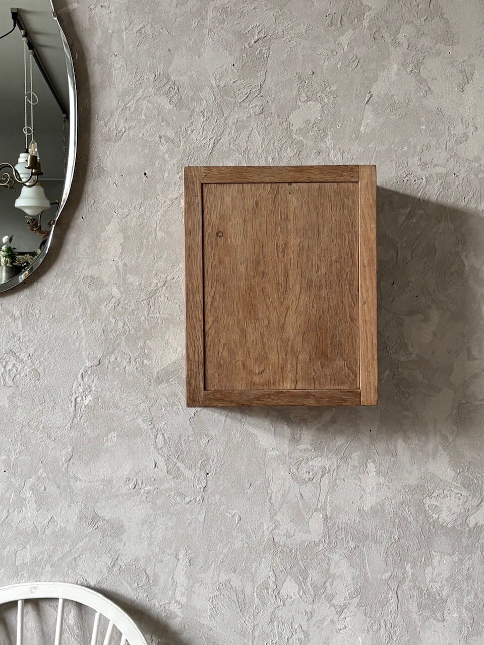 小さめのウォールキャビネット。前面に取手がないシンプルな形で、天板部分に小物やお花などを飾っても良さそうです。背板に穴があり、内側から壁にしっかりと固定すると扉が開けやすいです。