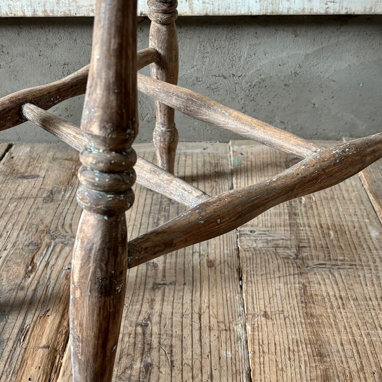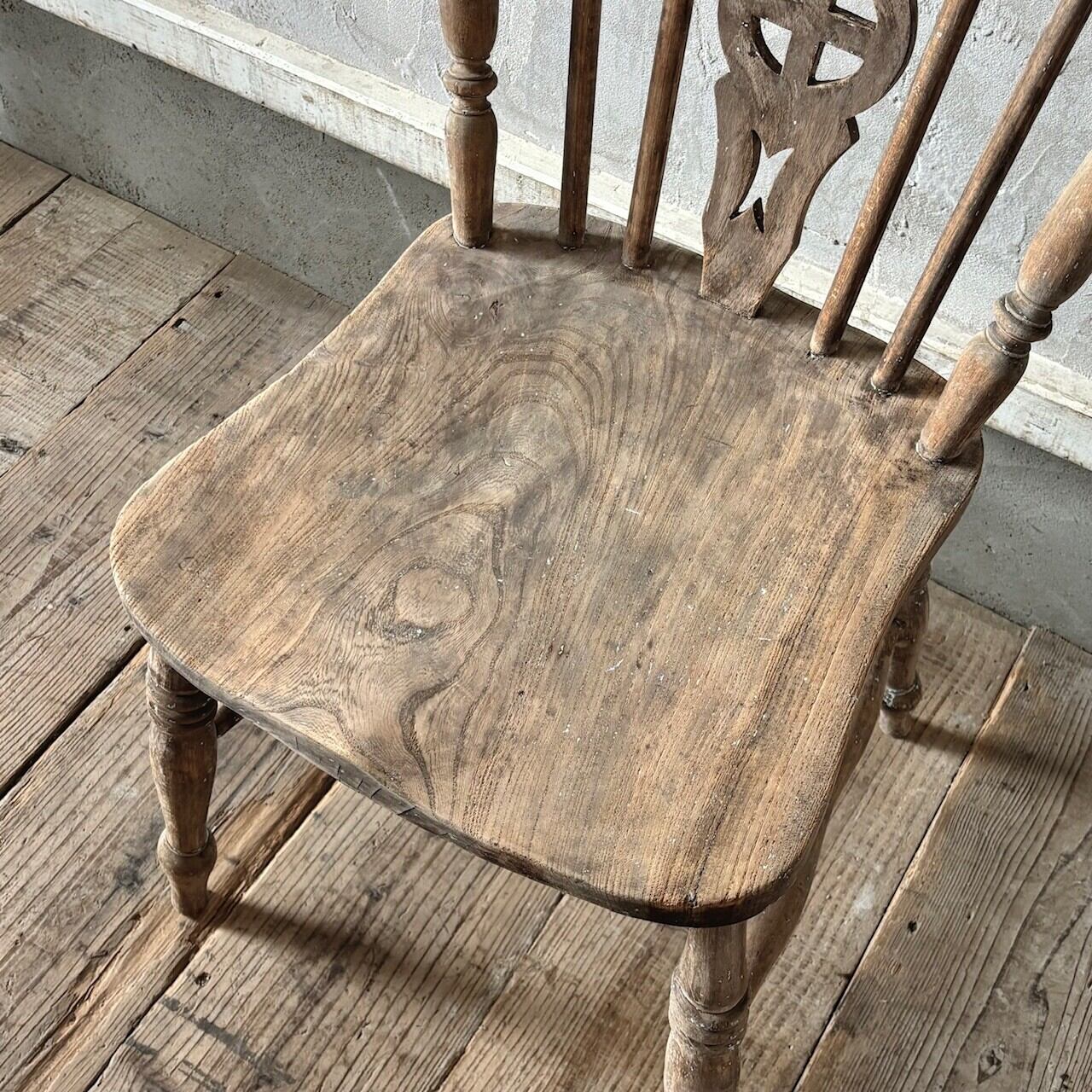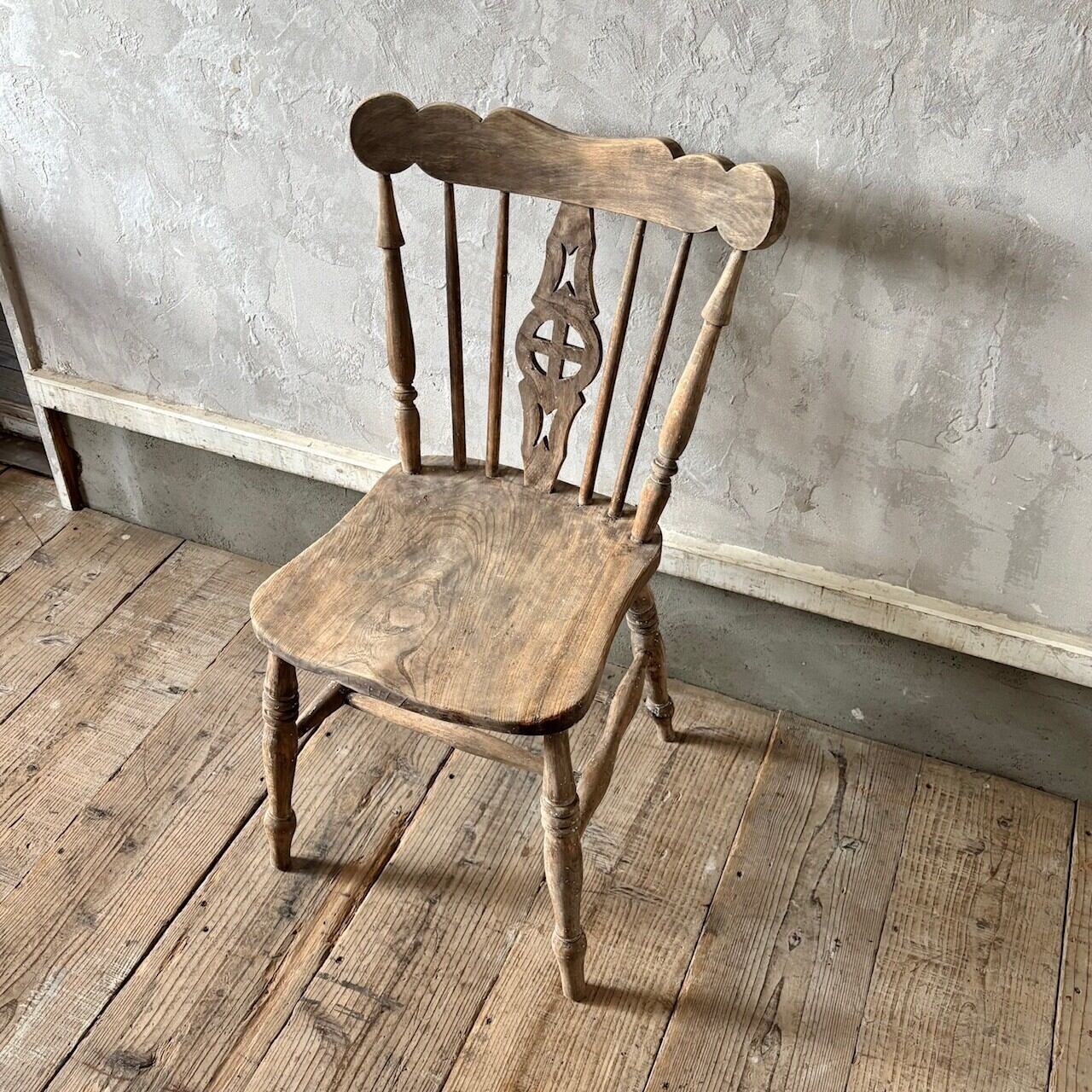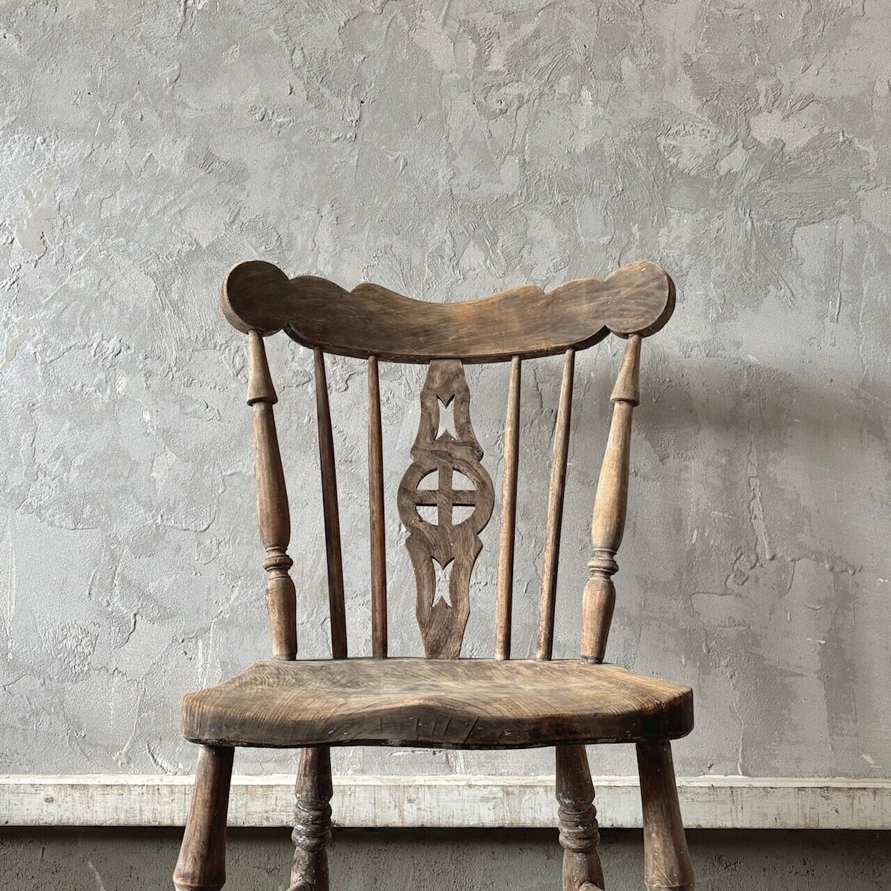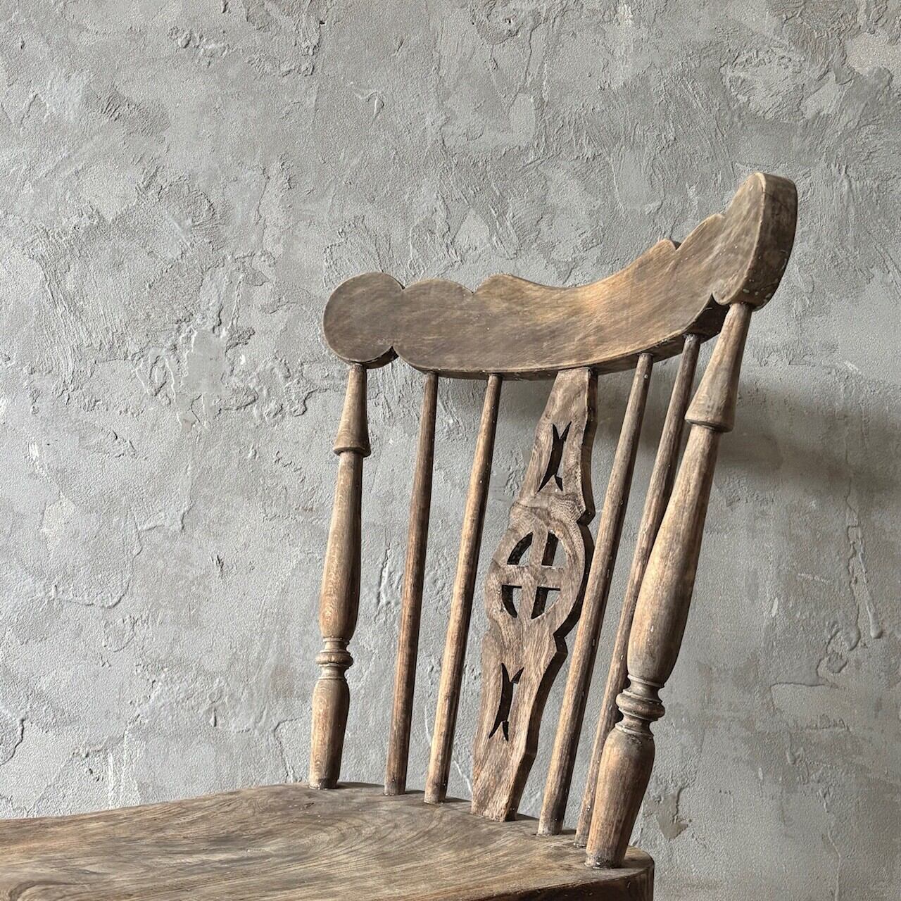クラシカルな印象のチェア。重さのあるしっかりとしたつくりで、くぼんだ座面と背中に沿うようにカーブした背面が良い座り心地です。木目の表情、少し残るペイントや色むら、使い込まれてついた傷や経年で歪んだ形など古いものならではの味わいが魅力的です。高さ調整の脚のカットは可能です。