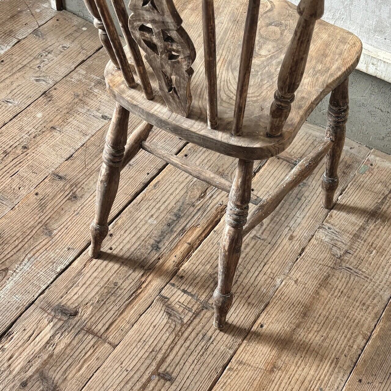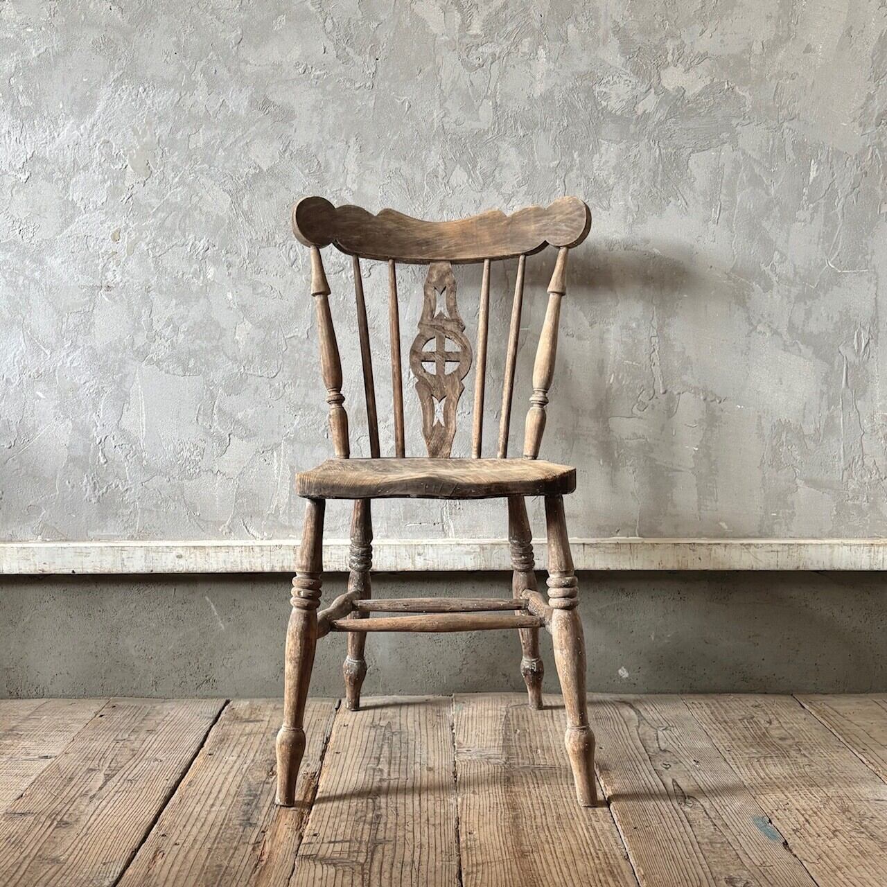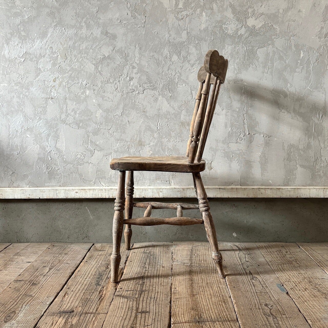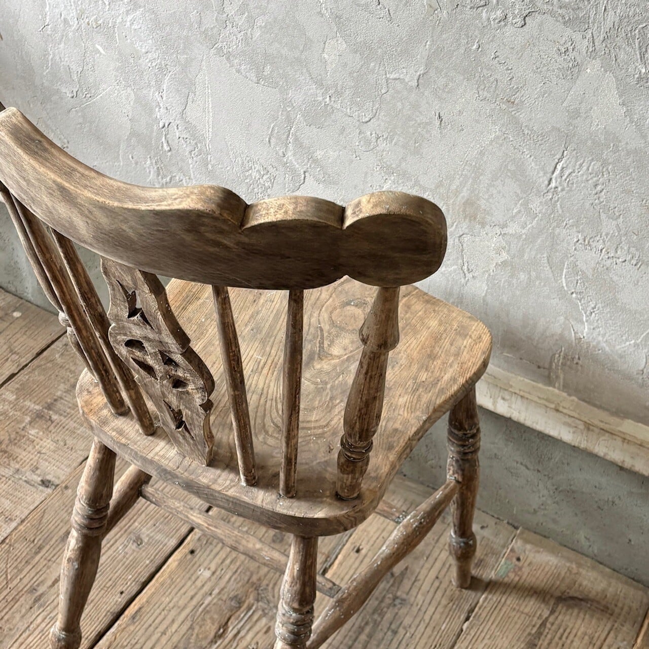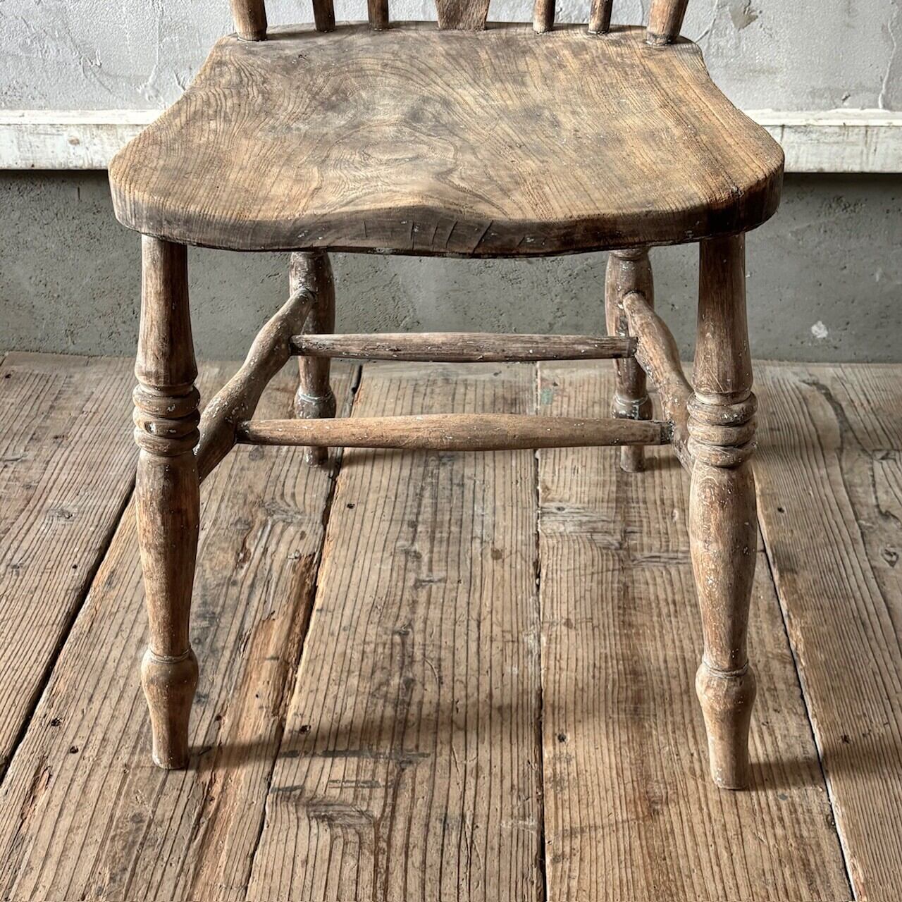 クラシカルな印象のチェア。重さのあるしっかりとしたつくりで、くぼんだ座面と背中に沿うようにカーブした背面が良い座り心地です。木目の表情、少し残るペイントや色むら、使い込まれてついた傷や経年で歪んだ形など古いものならではの味わいが魅力的です。高さ調整の脚のカットは可能です。