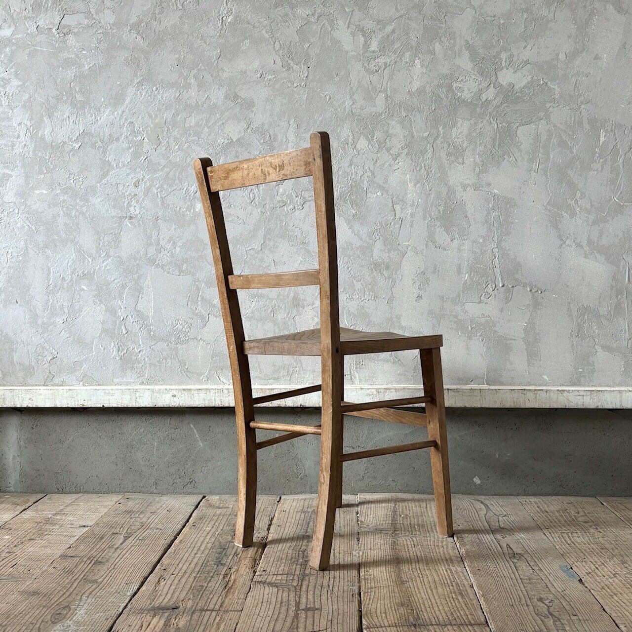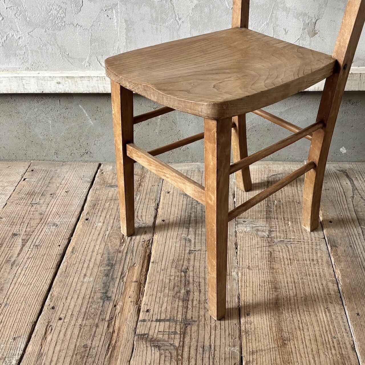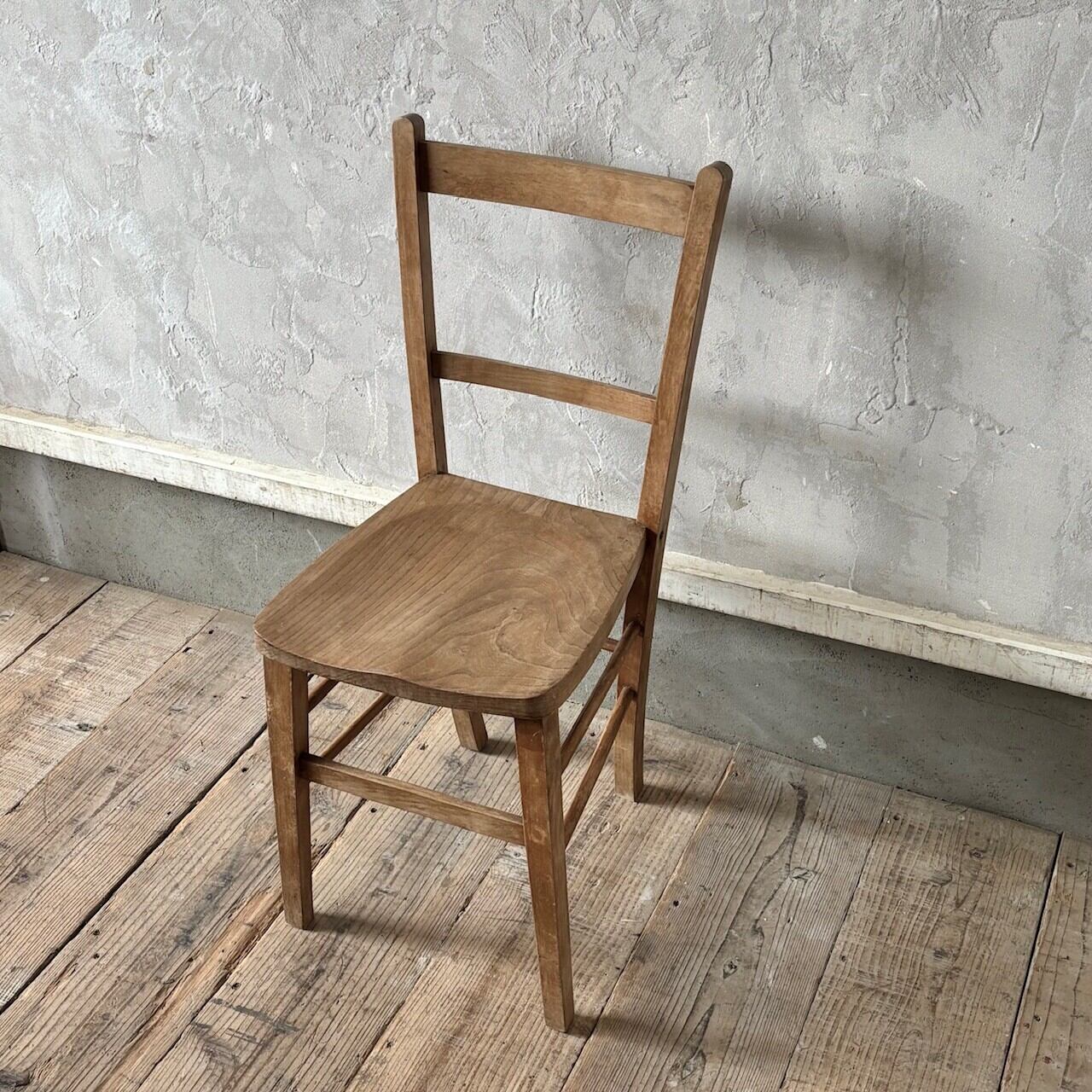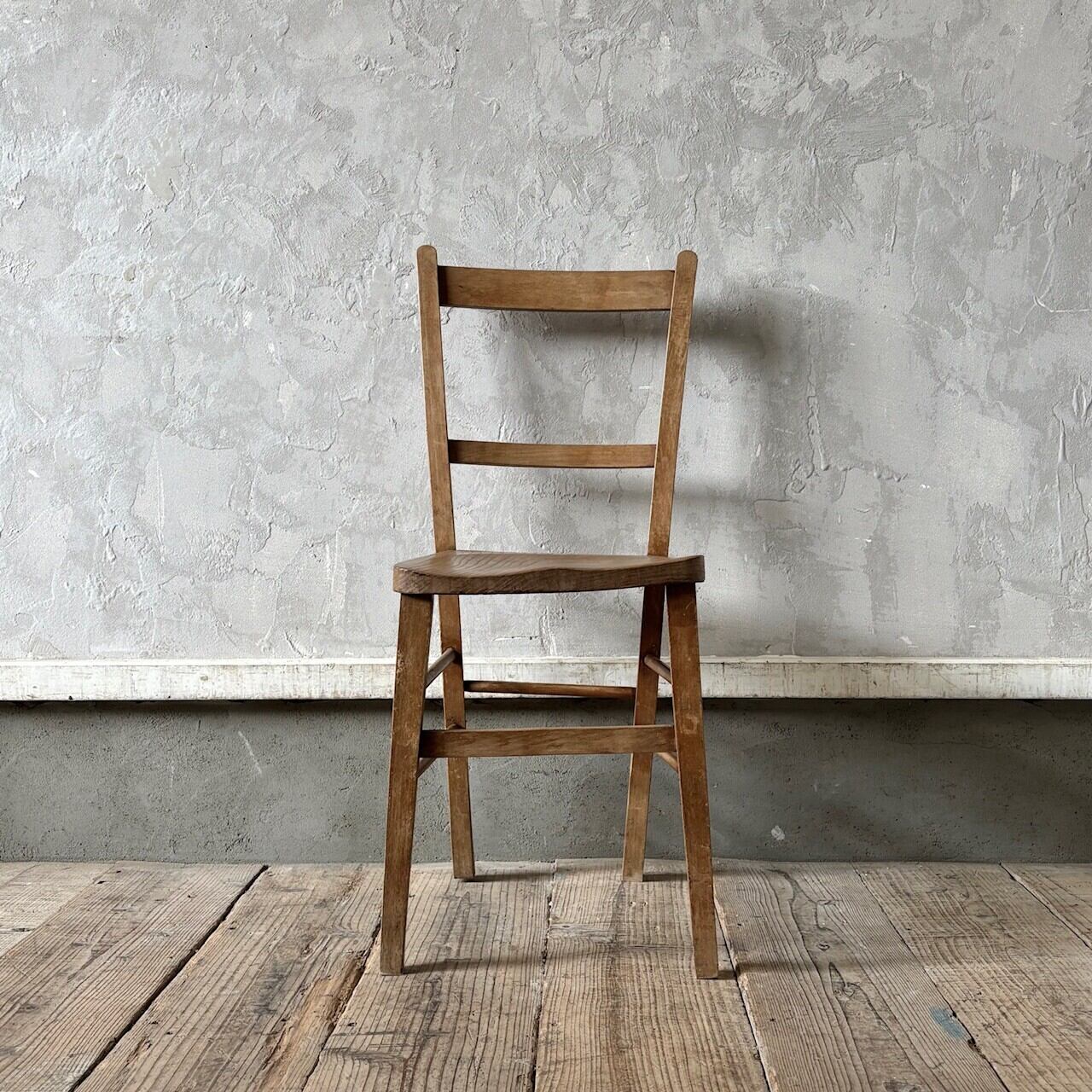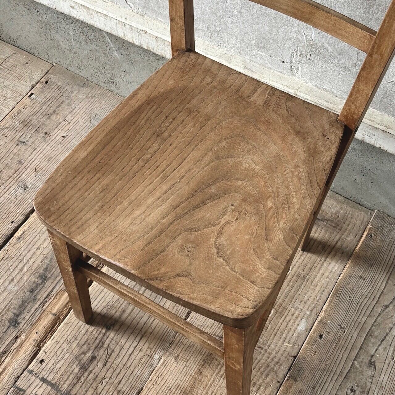 シンプルなデザインの素朴な雰囲気のチャーチチェア。座面の木目の表情、使い込まれてついた傷や味わいのある表情、経年で歪んだ形など古いものならではの味わいが魅力的です。高さ調整の脚のカットは可能です。