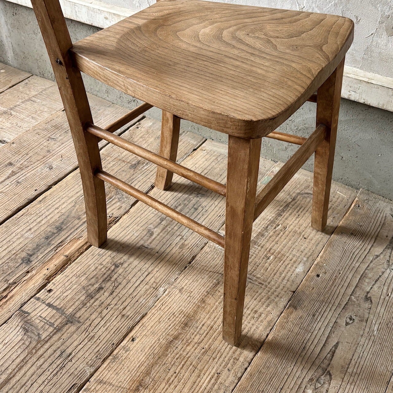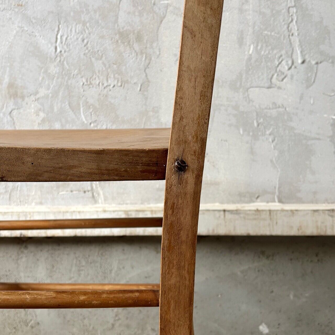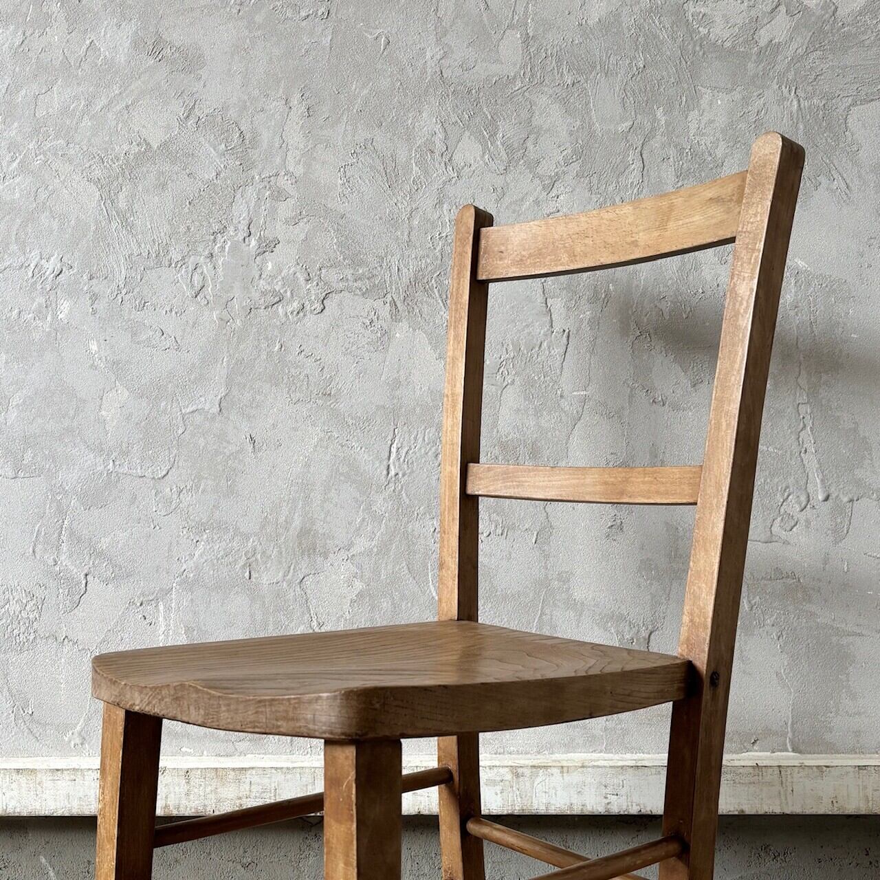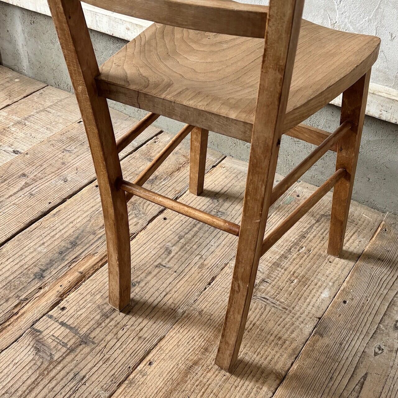 シンプルなデザインの素朴な雰囲気のチャーチチェア。座面の木目の表情、使い込まれてついた傷や味わいのある表情、経年で歪んだ形など古いものならではの味わいが魅力的です。高さ調整の脚のカットは可能です。