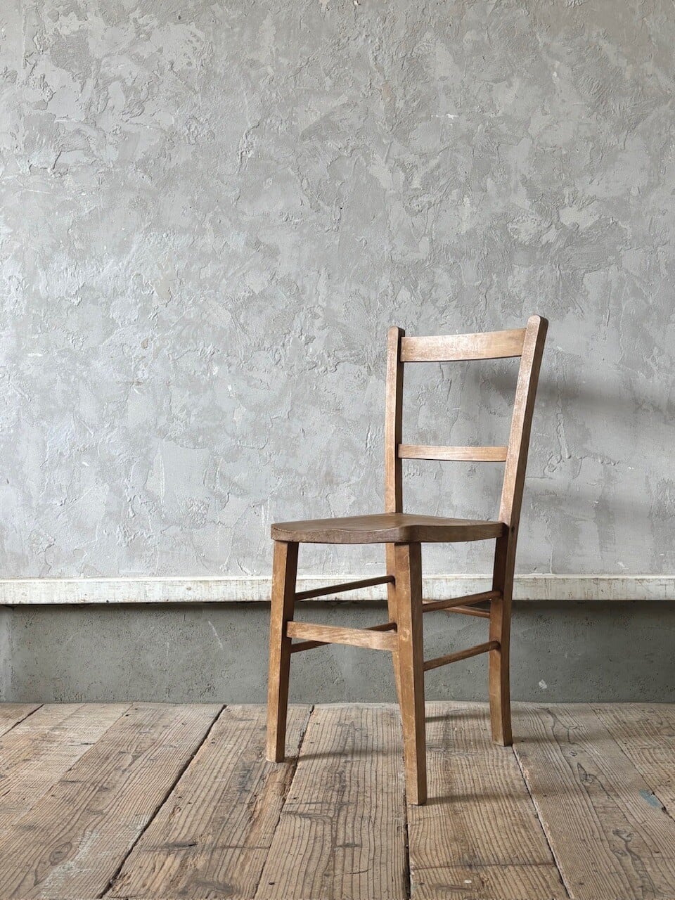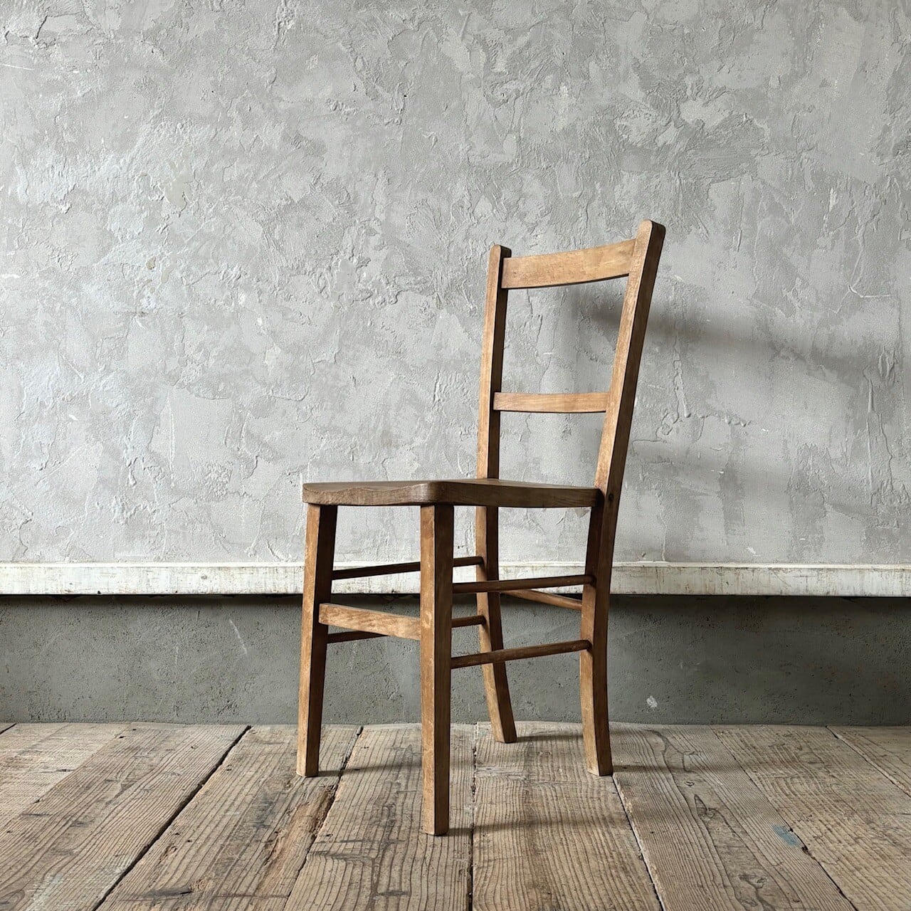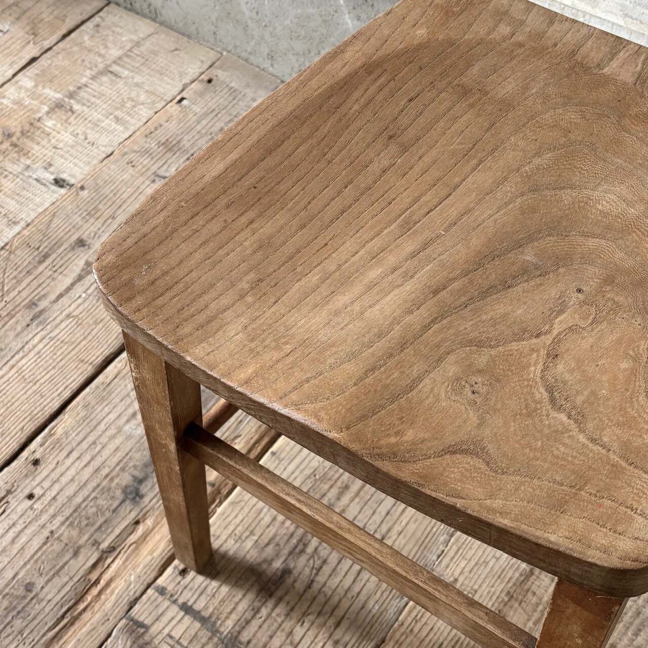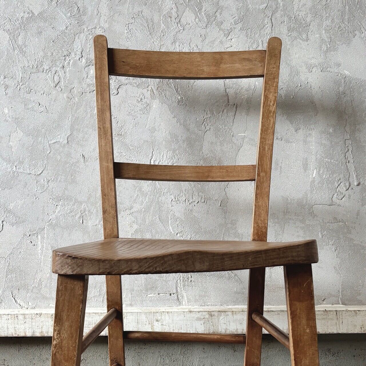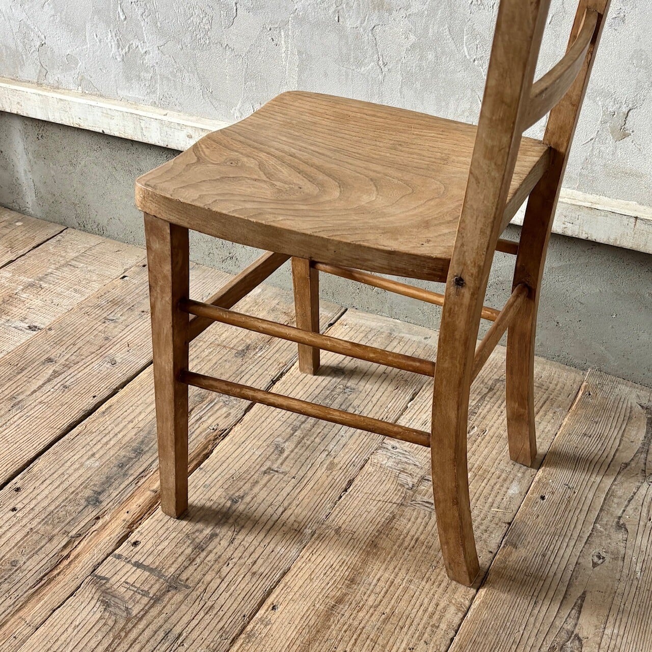 シンプルなデザインの素朴な雰囲気のチャーチチェア。座面の木目の表情、使い込まれてついた傷や味わいのある表情、経年で歪んだ形など古いものならではの味わいが魅力的です。高さ調整の脚のカットは可能です。
