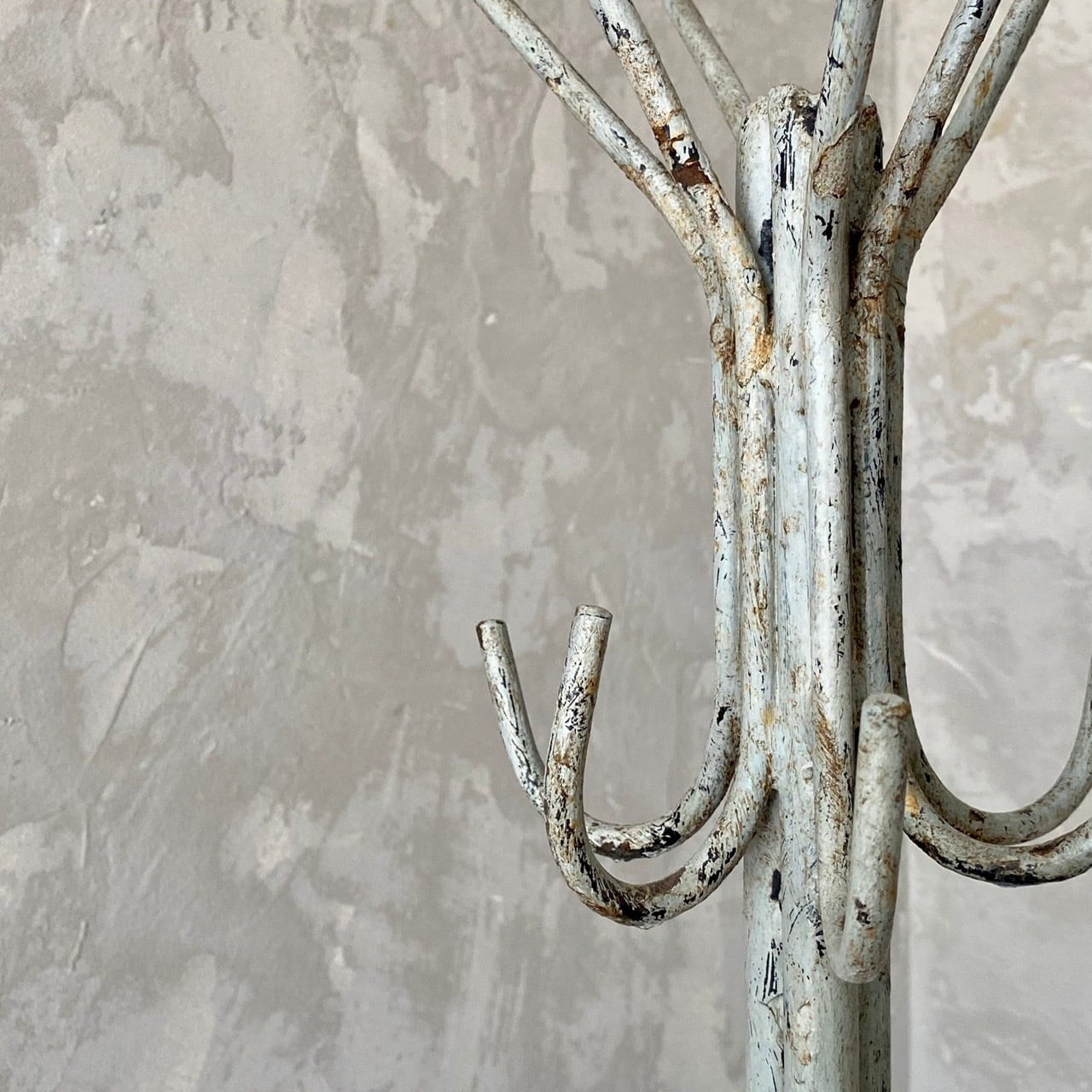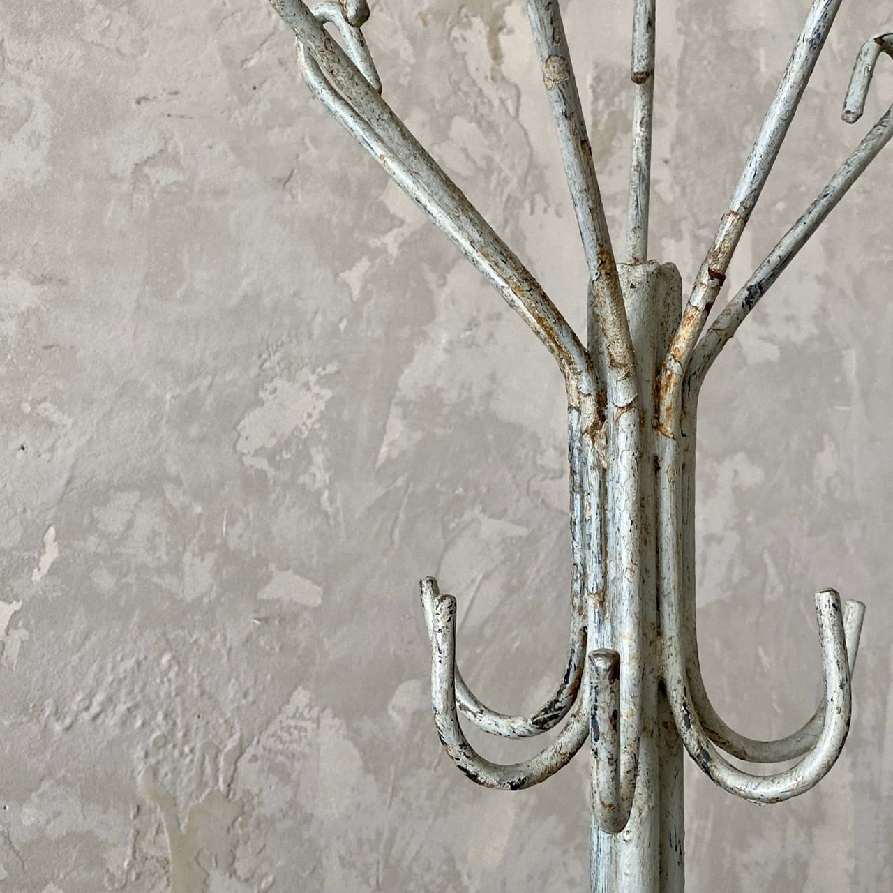 アイアン製のコートとハットのスタンドラック。経年による表情が良い雰囲気で、合計12本のフックが付いています。ベース部分が広めで全体の重さもあるため安定感が良いです。