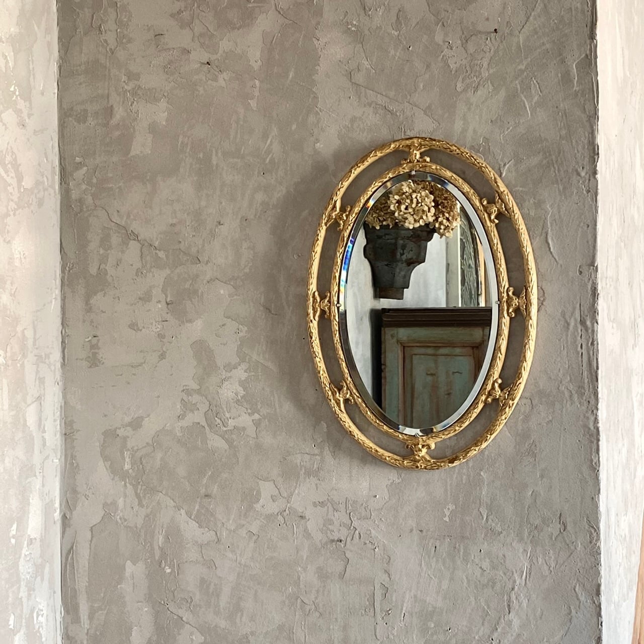壁に飾るだけで絵になるウォールミラー。鋳物のフレームはやさしい色合いの黄みがかったクリーム色で、装飾部分の表面はゴールドでペイントされています。少し離れると頭部から腹部辺りまでが映るサイズ感です。オーバル形のミラーにはカットが入っていて、飾ると壁面が華やかな雰囲気になります。鏡面の縁辺りに小さな黒点などがありますが、全体的に比較的きれいな状態で、裏には縦 / 横どちらでも飾れるように金具が付いているので壁にかけやすいです。