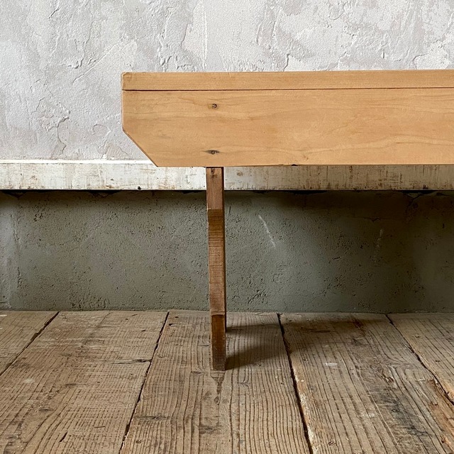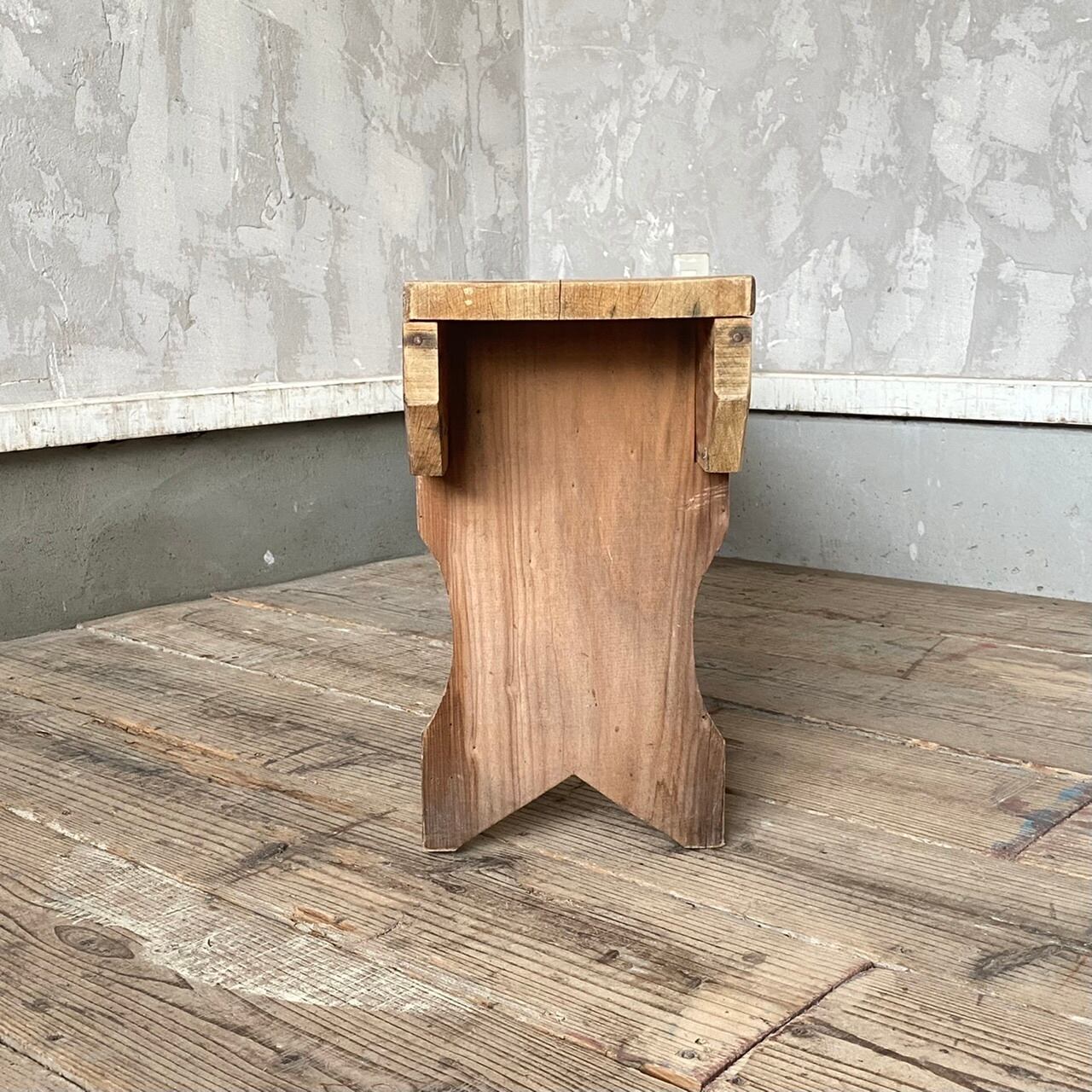 しっかりとした作りのベンチ。座面と脚部で少し違う色味が可愛く、素朴な雰囲気ながら厚みのある木が存在感を際立たせています。ベンチとしてはもちろん、飾り棚としてやテレビ台、鉢を並べたり、店舗什器として衣類や靴などを並べて置くのもよさそうです。